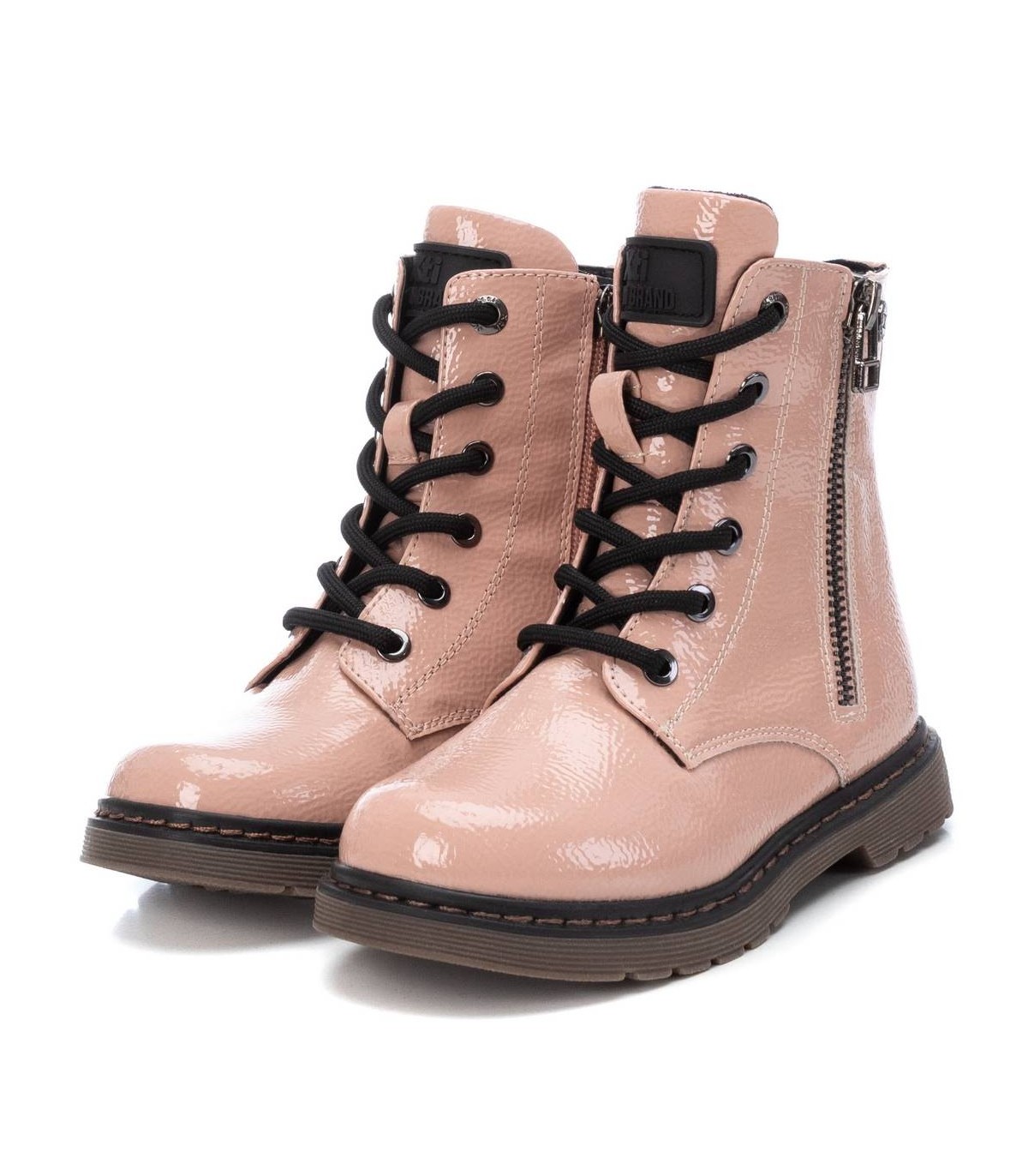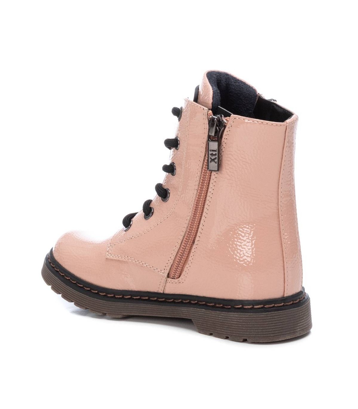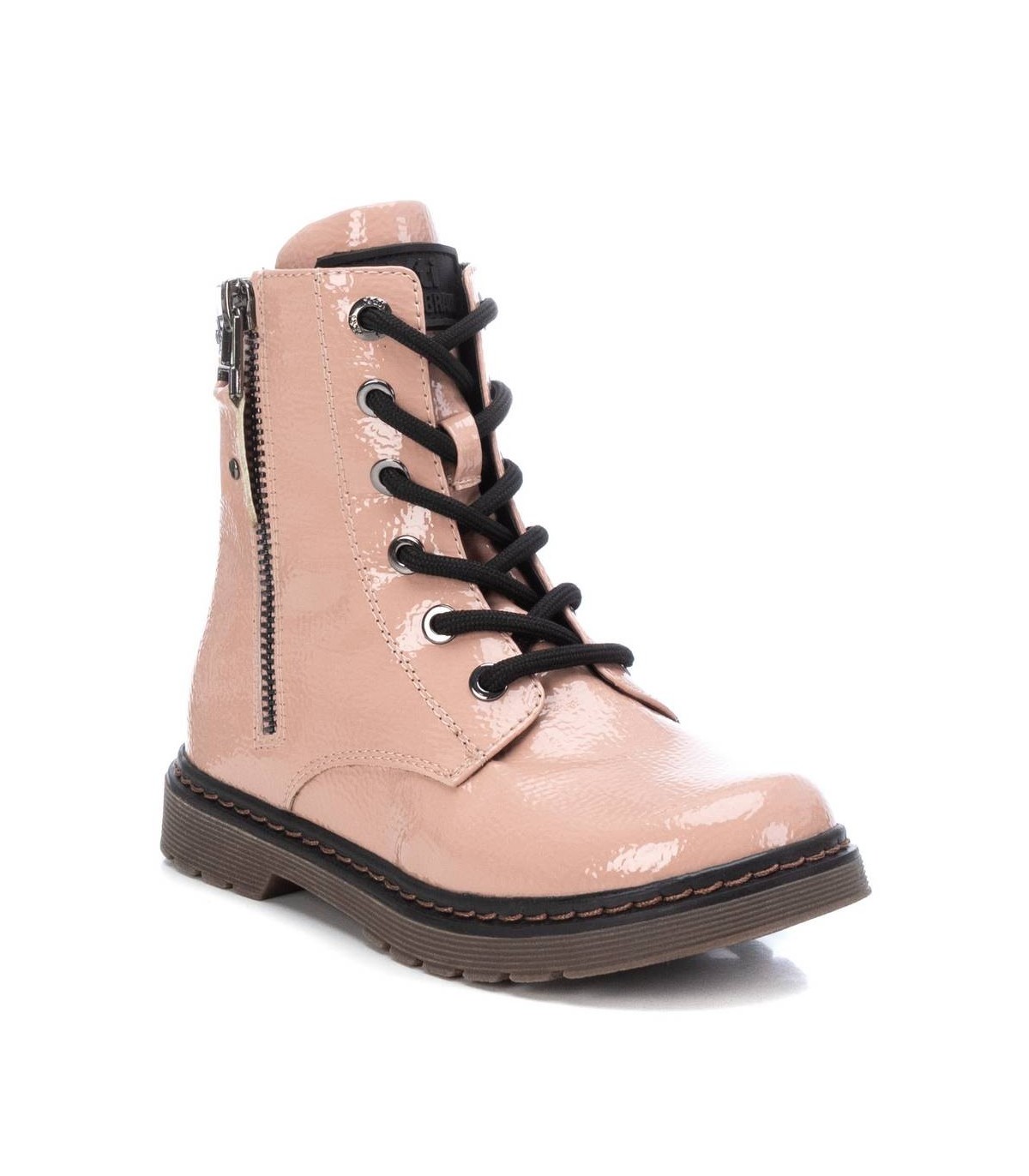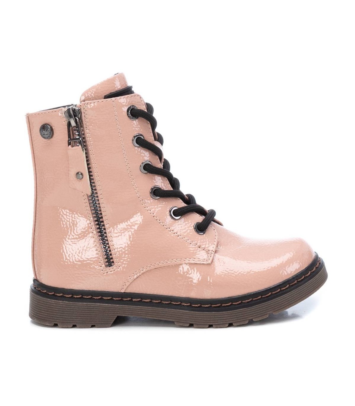 Botín de niña, de la marca Xti Kids. Fabricado en material que imita la piel con efecto charol. Cierre mediante cremallera interna. Con cremallera exterior decorativa. Cordones al tono para un mejor ajuste. Gruesa suela de goma antideslizante. Este modelo ha obtenido el certificado vegano por la organización mundial PETA (Organización de los derechos de los animales).