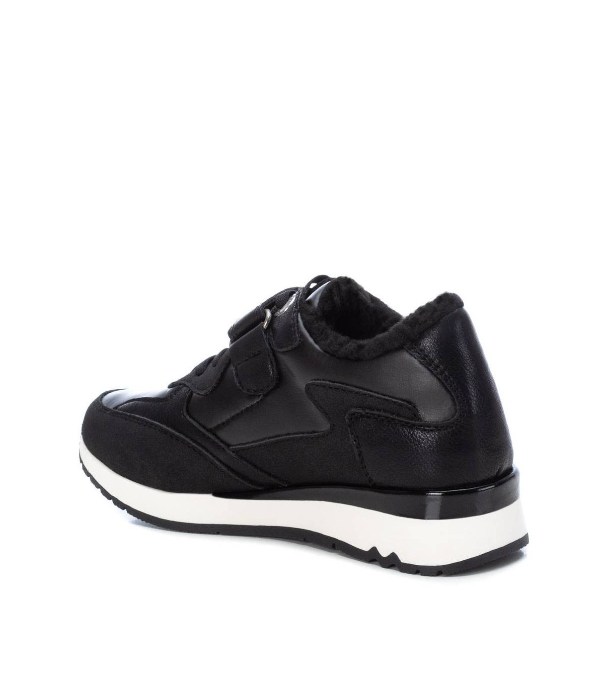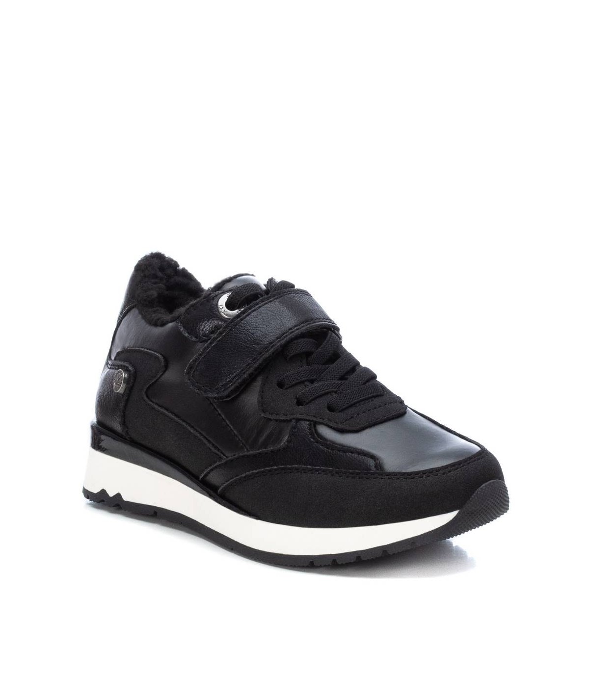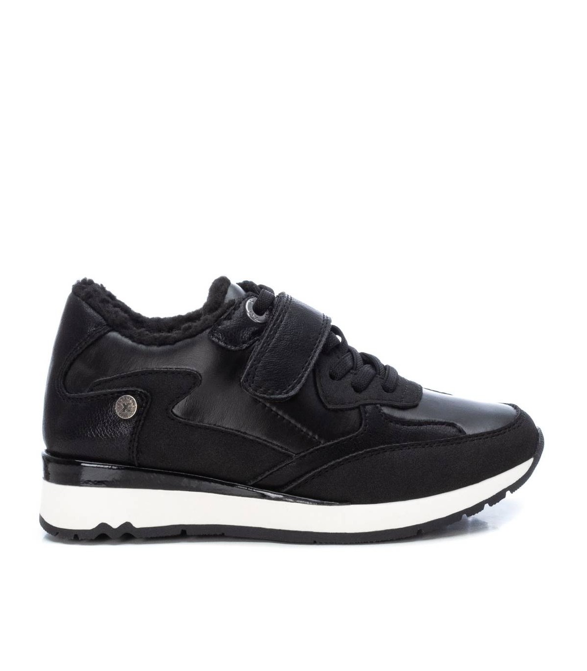 Zapatilla de niña, de la marca Xti Kids. Fabricada en textil metalizado combinado en material que imita a la piel. Cierre mediante tira autoadherente con cordones elásticos decorativos. Zapatilla para los días más frios gracias a su confortable forro y suela aislante de goma antideslizante. Este modelo ha obtenido el certificado vegano por la organización mundial PETA (Organización de los derechos de los animales).