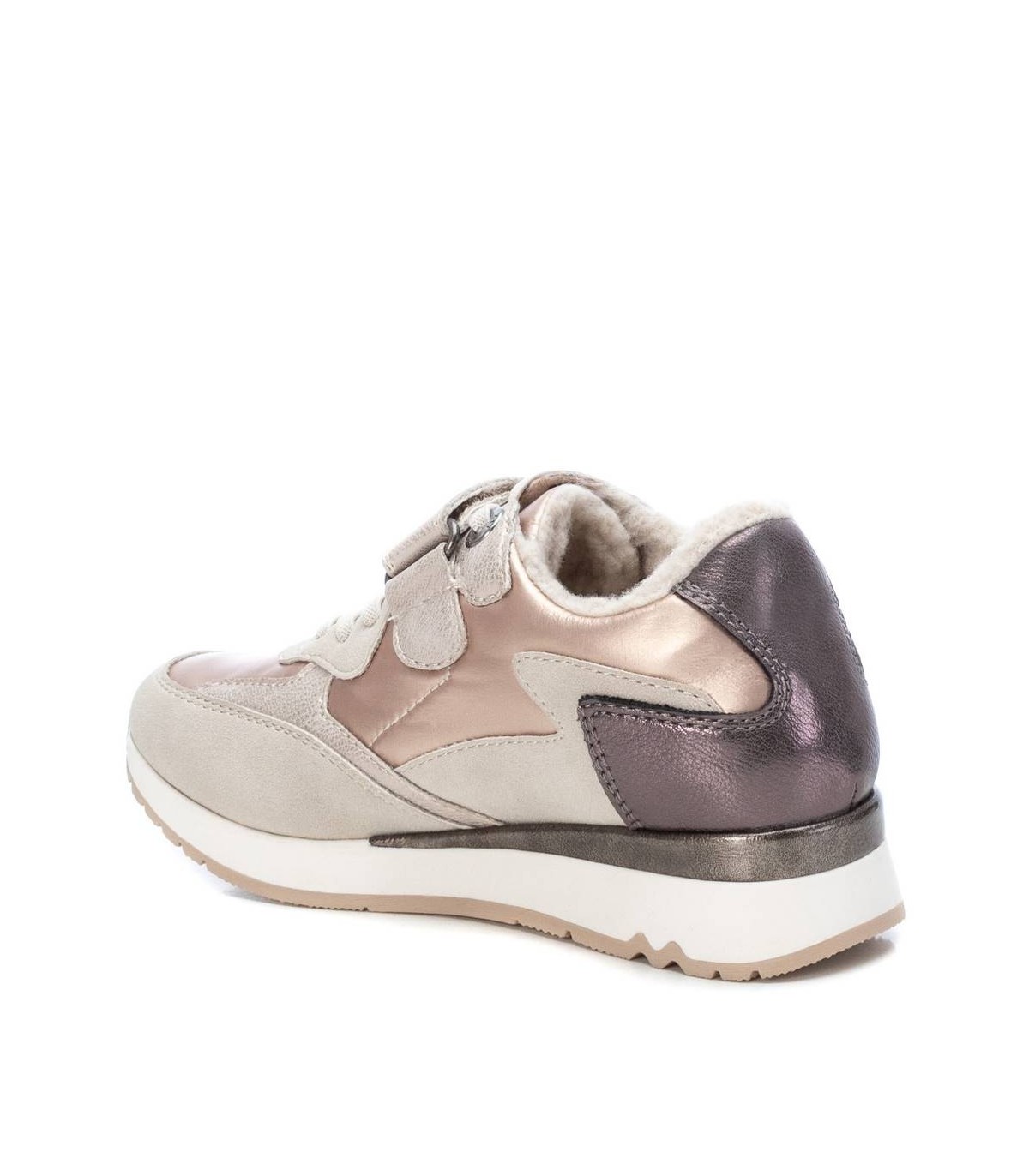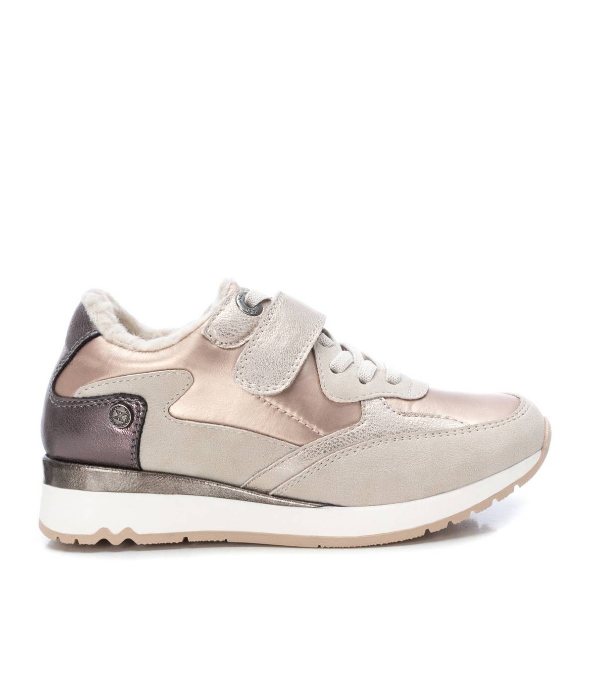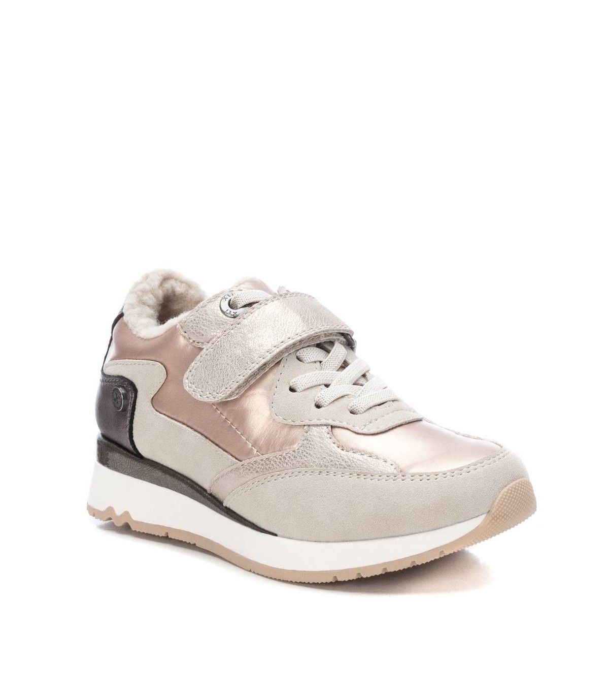 Zapatilla de niña, de la marca Xti Kids. Fabricada en textil metalizado combinado en material que imita a la piel. Cierre mediante tira autoadherente con cordones elásticos decorativos. Zapatilla para los días más frios gracias a su confortable forro y suela aislante de goma antideslizante. Este modelo ha obtenido el certificado vegano por la organización mundial PETA (Organización de los derechos de los animales).