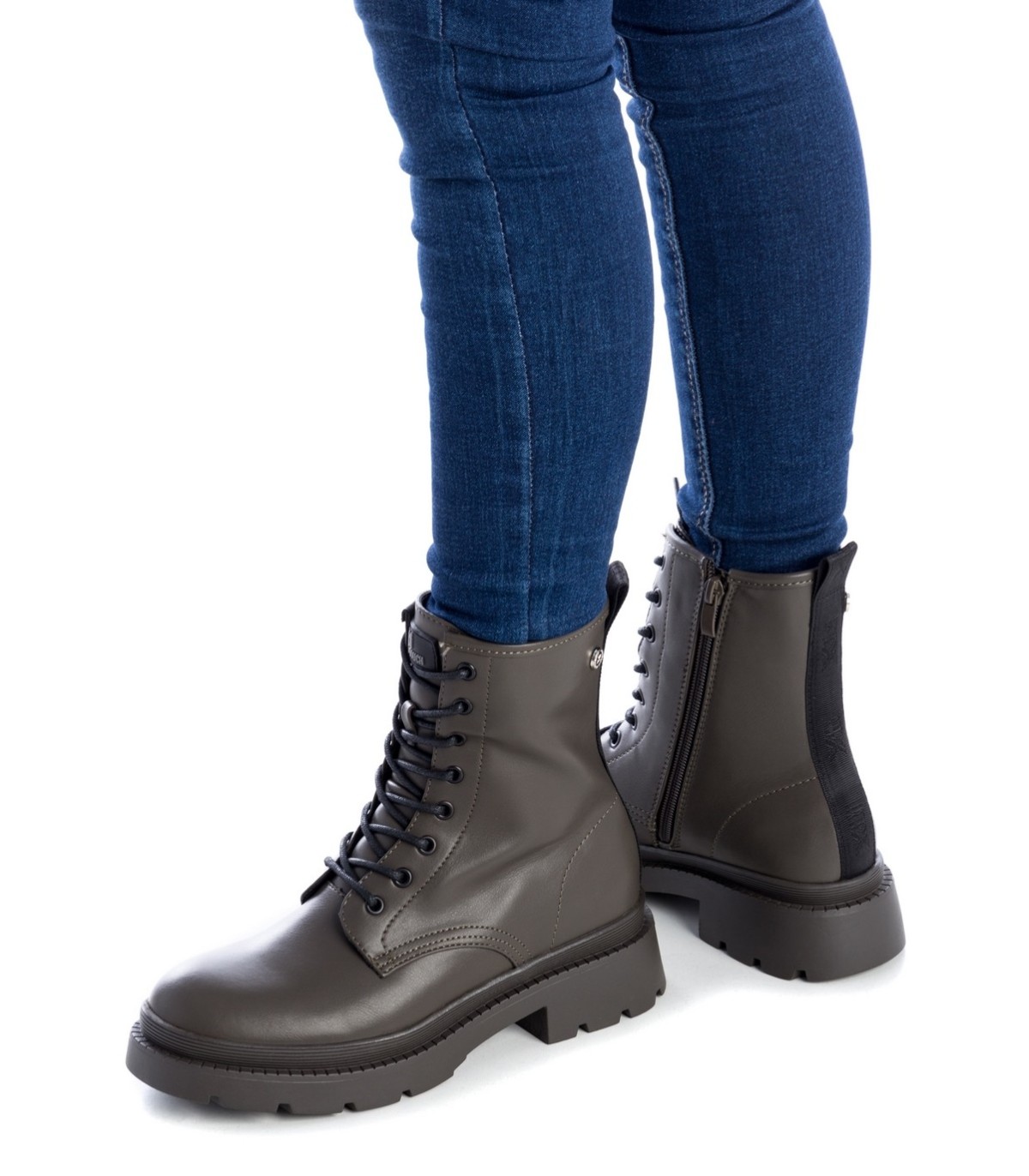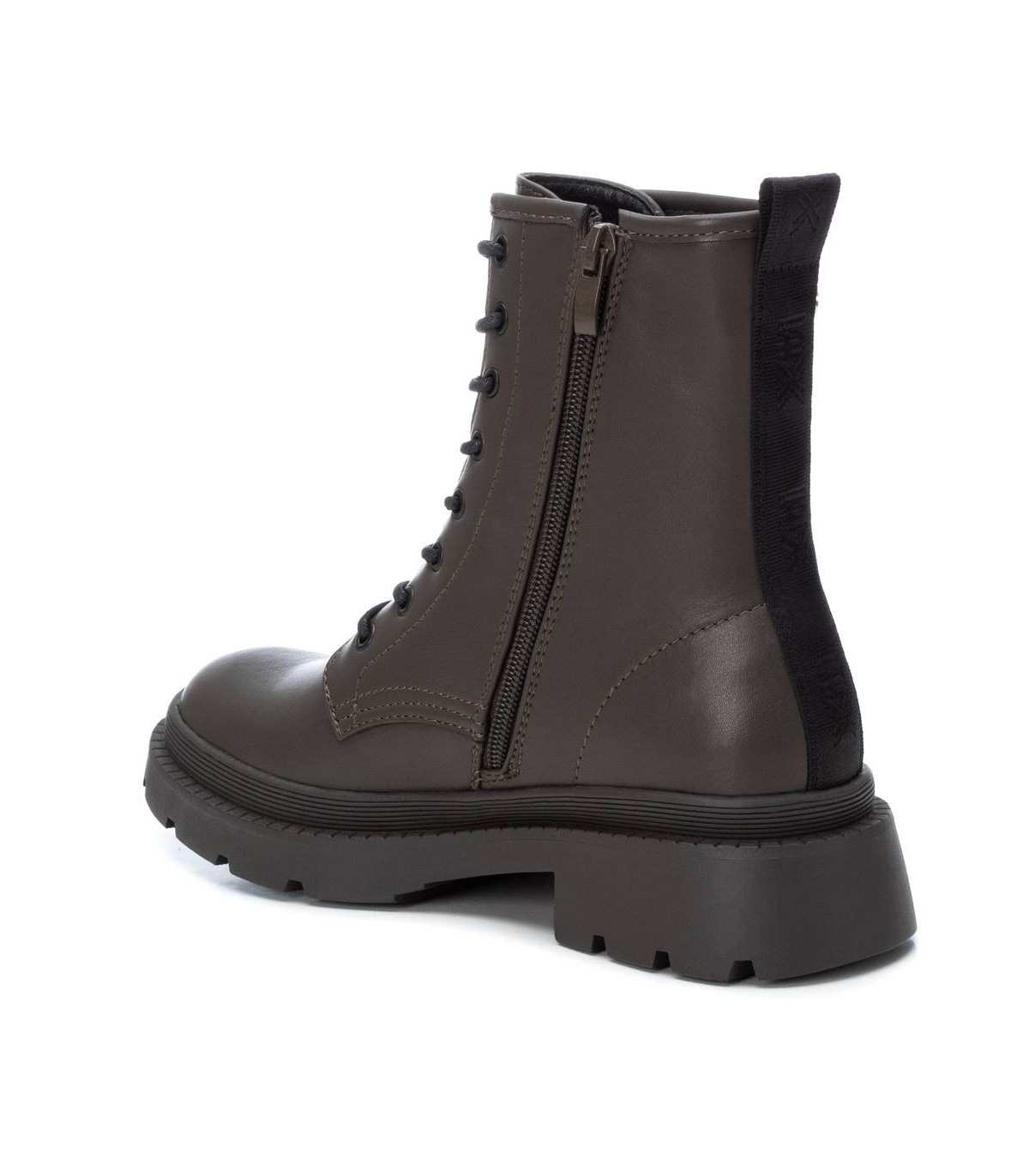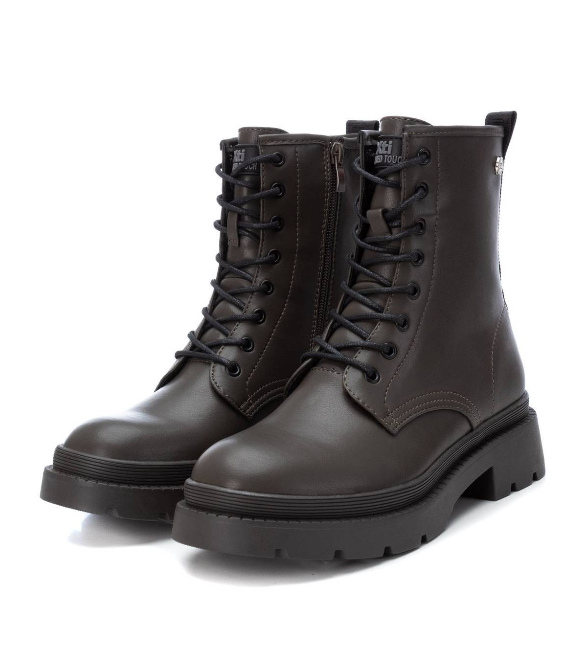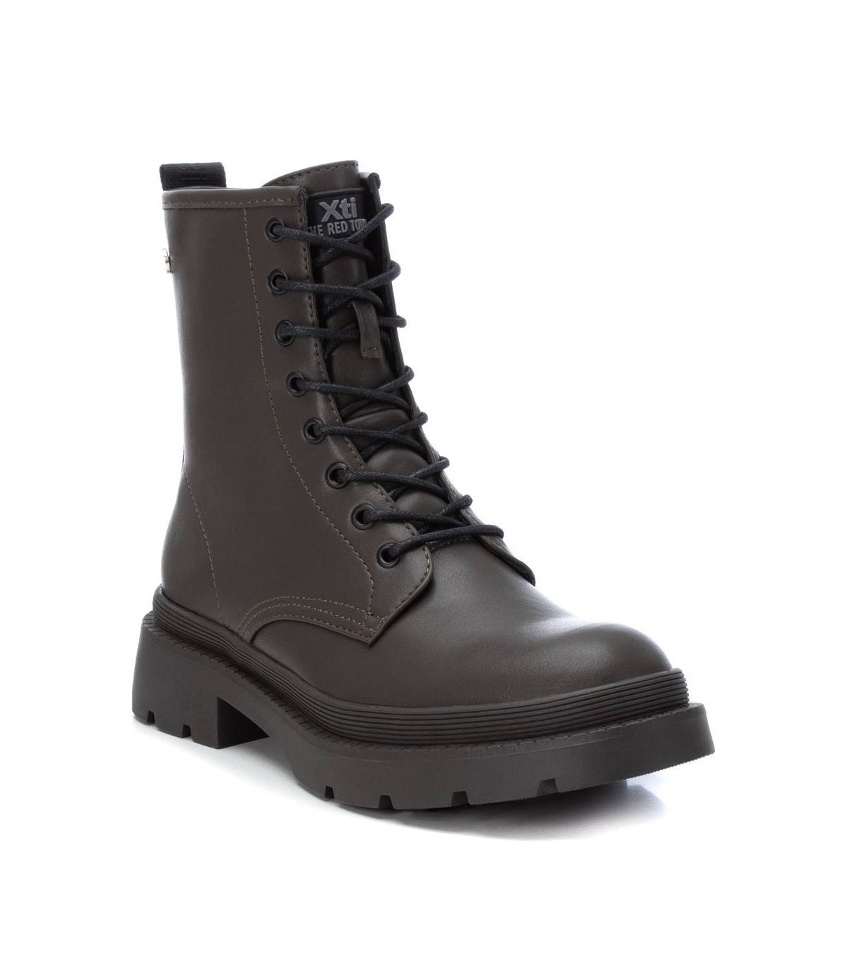 Botín de mujer estilo militar, de la marca Xti. Fabricado en material que imita la piel. Cierre con cremallera lateral y cordones redondos para un mejor ajuste. Un botín versátil y en tendencia para esta temporada. Este modelo ha obtenido el certificado vegano por la organización mundial PETA (Organización de los derechos de los animales).