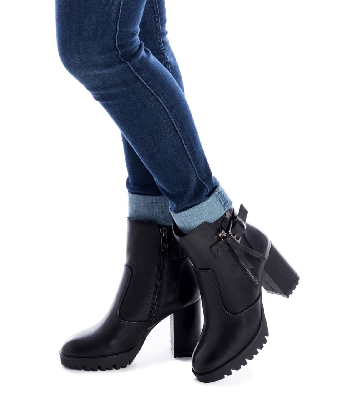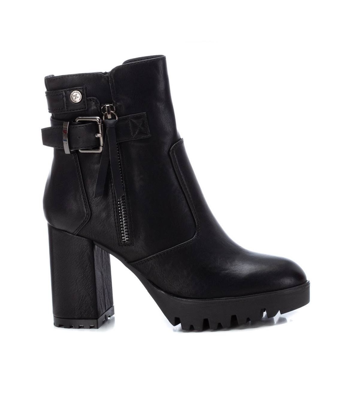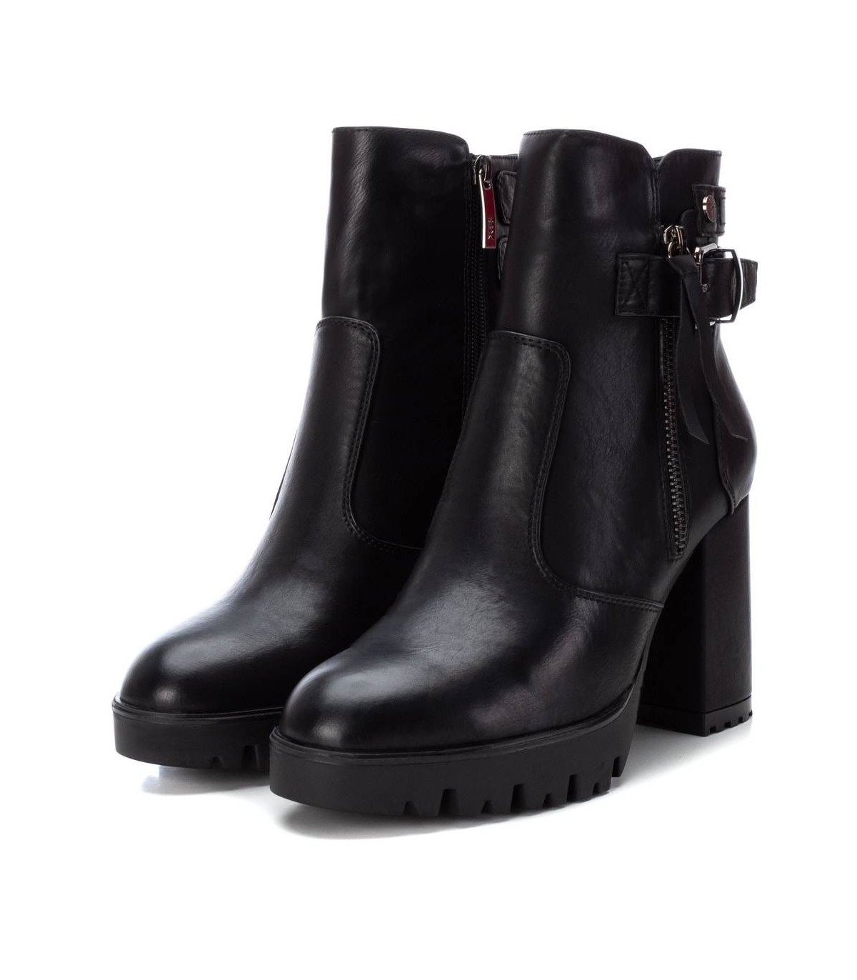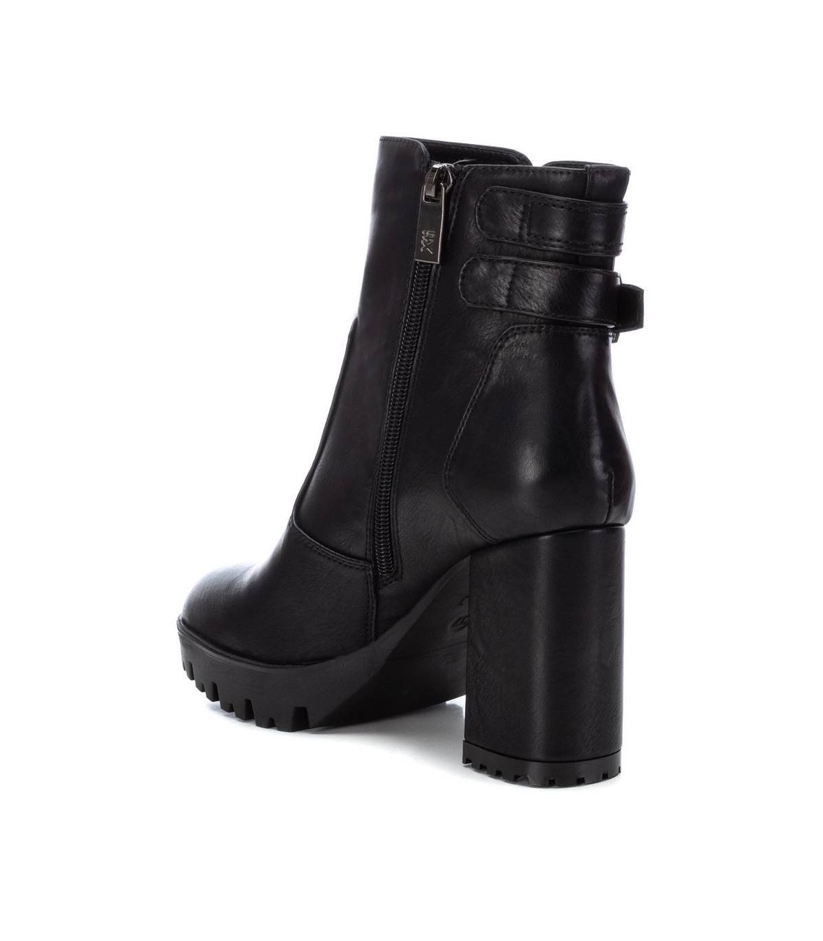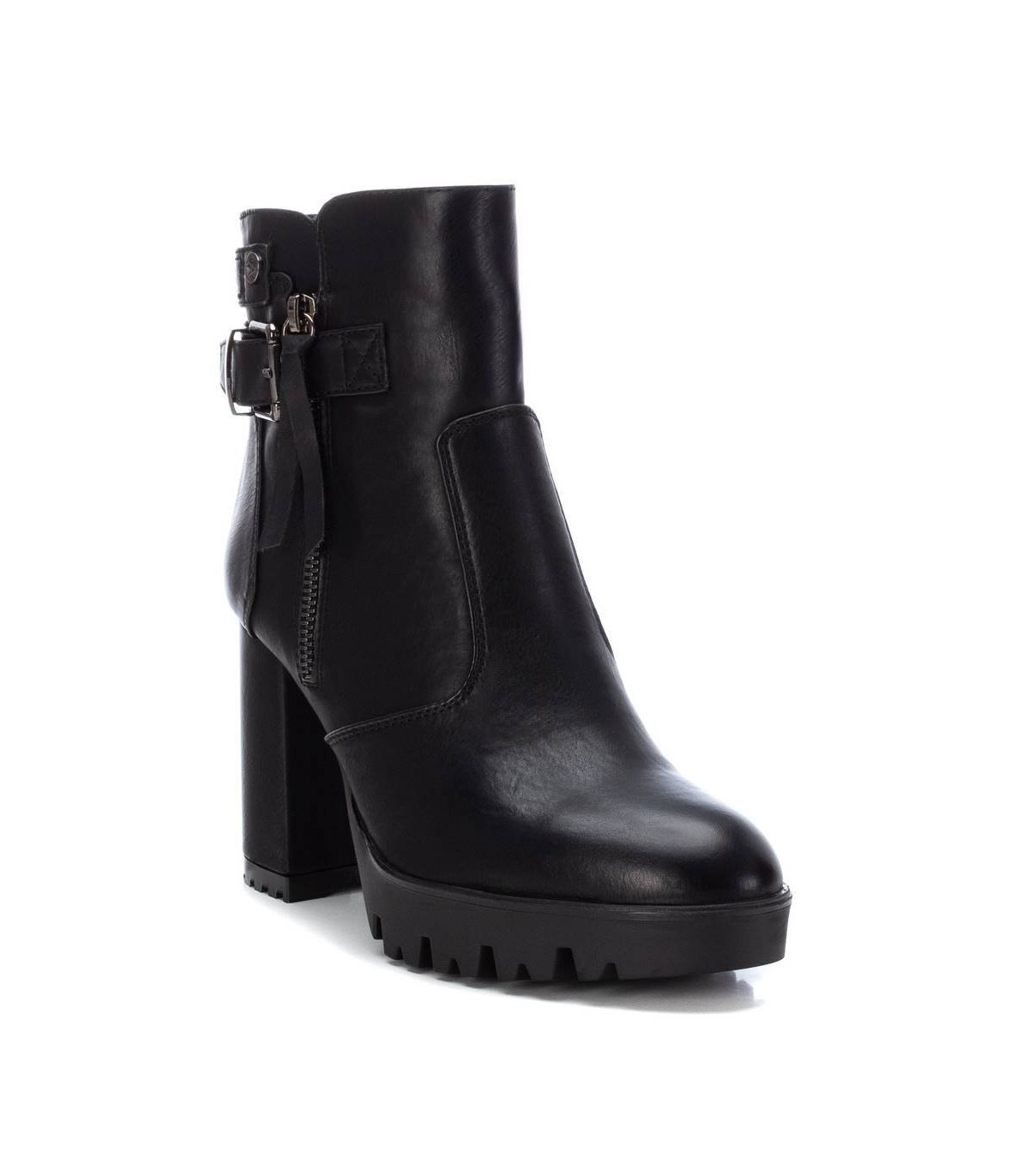 Botín de mujer, de la marca Xti. Fabricado en material que imita la piel. Cierre mediante cremallera. Tacón ancho de 9 cm con plataforma delantera. Cremallera lateral decorativa y correa con hebilla al tono. Suela de goma antideslizante. Este modelo ha obtenido el certificado vegano por la organización mundial PETA (Organización de los derechos de los animales).