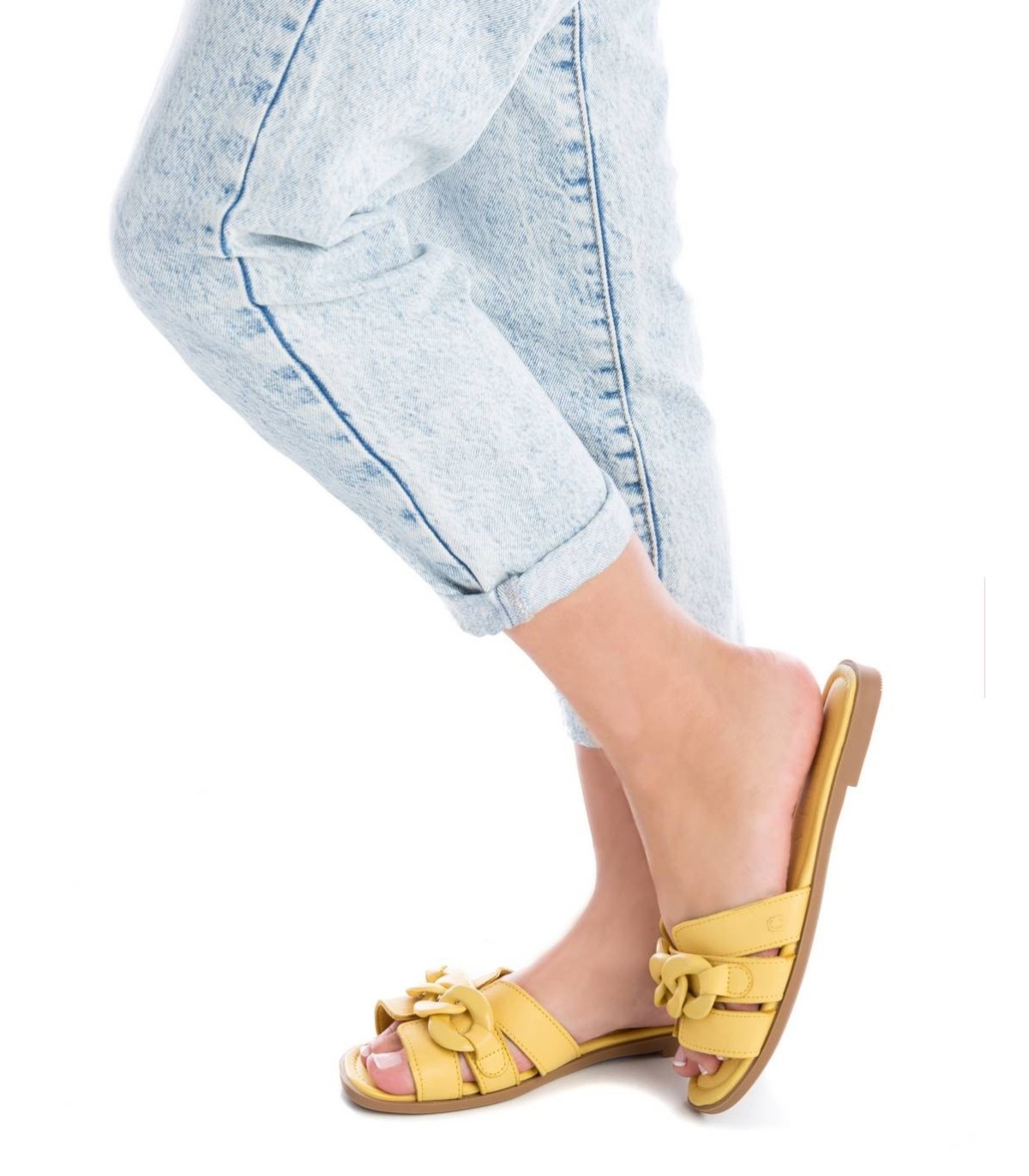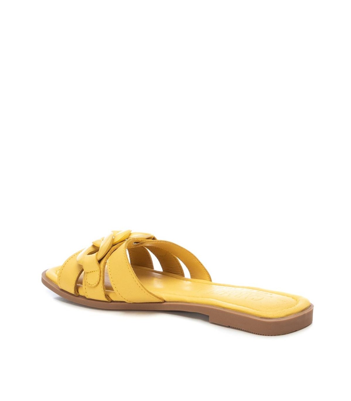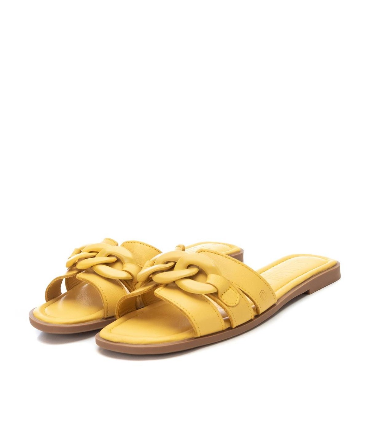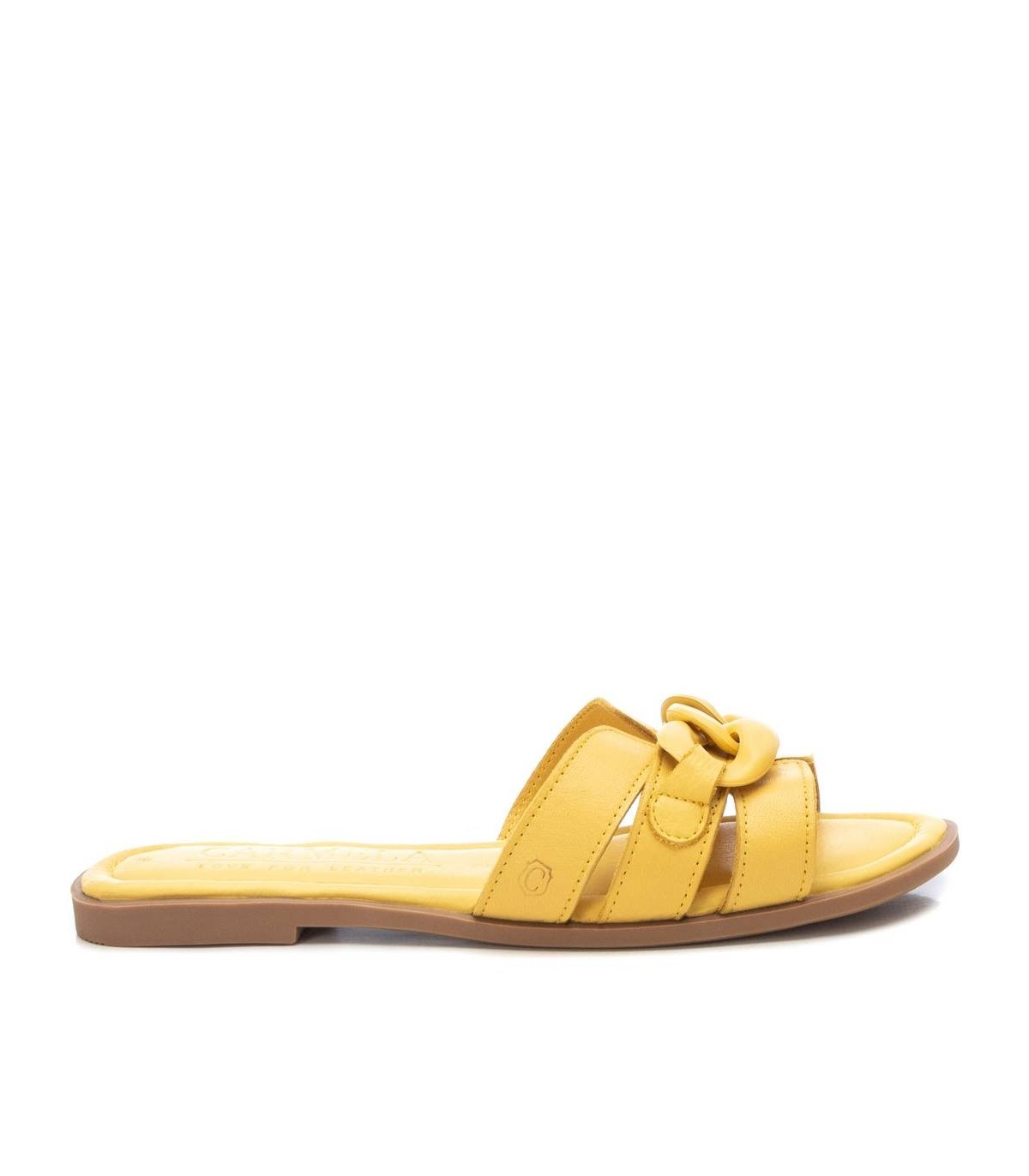 Sandalia de mujer de la marca Carmela. Fabricada en piel de alta calidad. Adorno de cadena al tono. Suela plana de goma antideslizante. Combinará con todos tus looks.