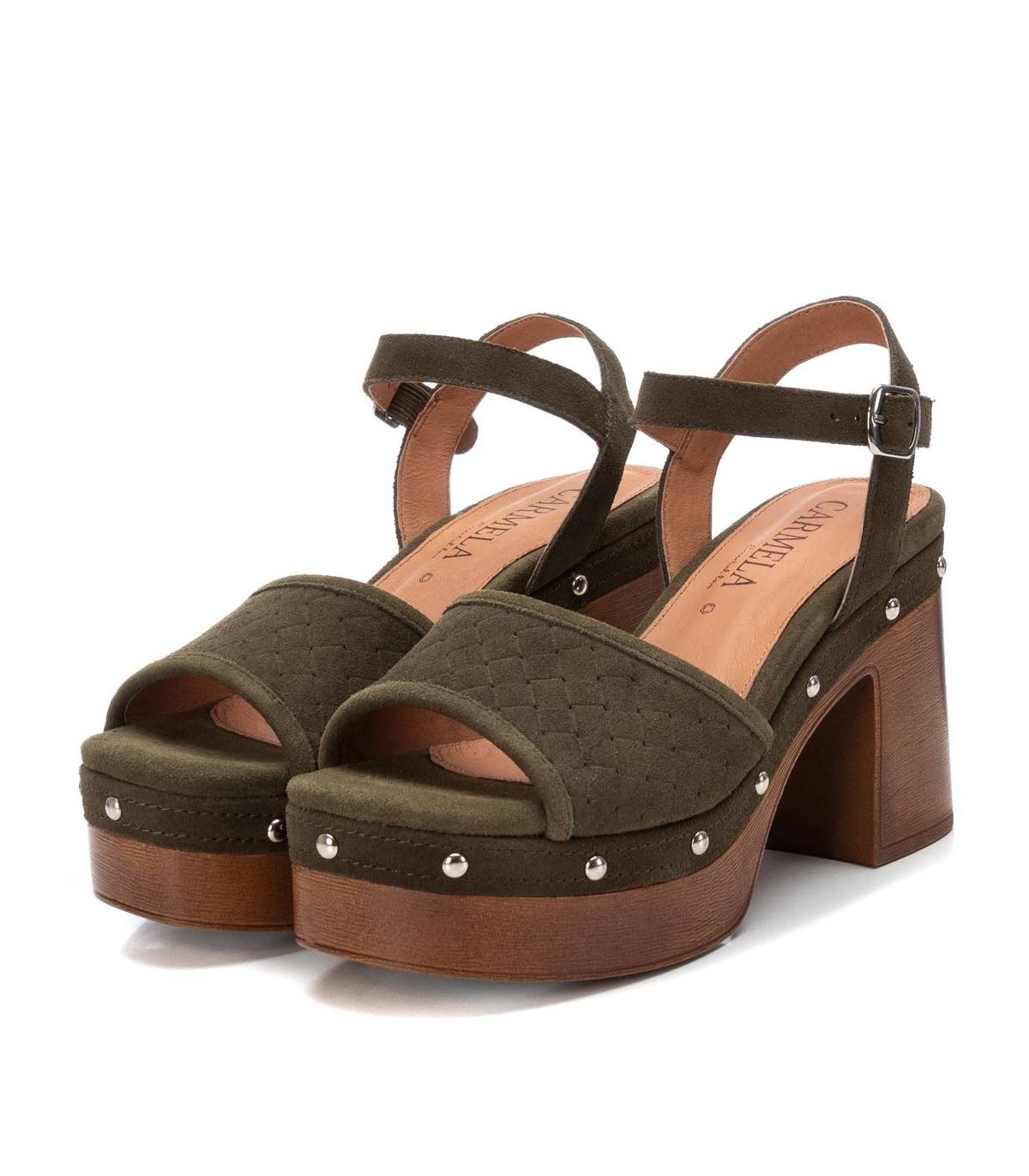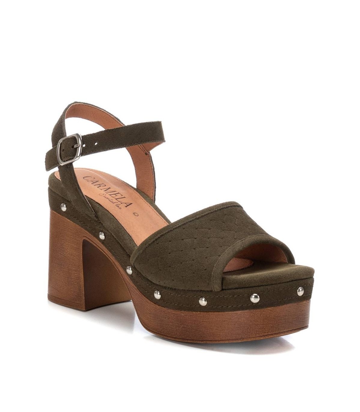 Sandalia de mujer, de la marca Carmela. Fabricada en serraje con diseño geométrico. Cierre mediante pulsera con hebilla al tobillo. Tacón de 10cm con plataforma delantera de acabado madera. Detalle de tachas en el piso. Suela antideslizante.