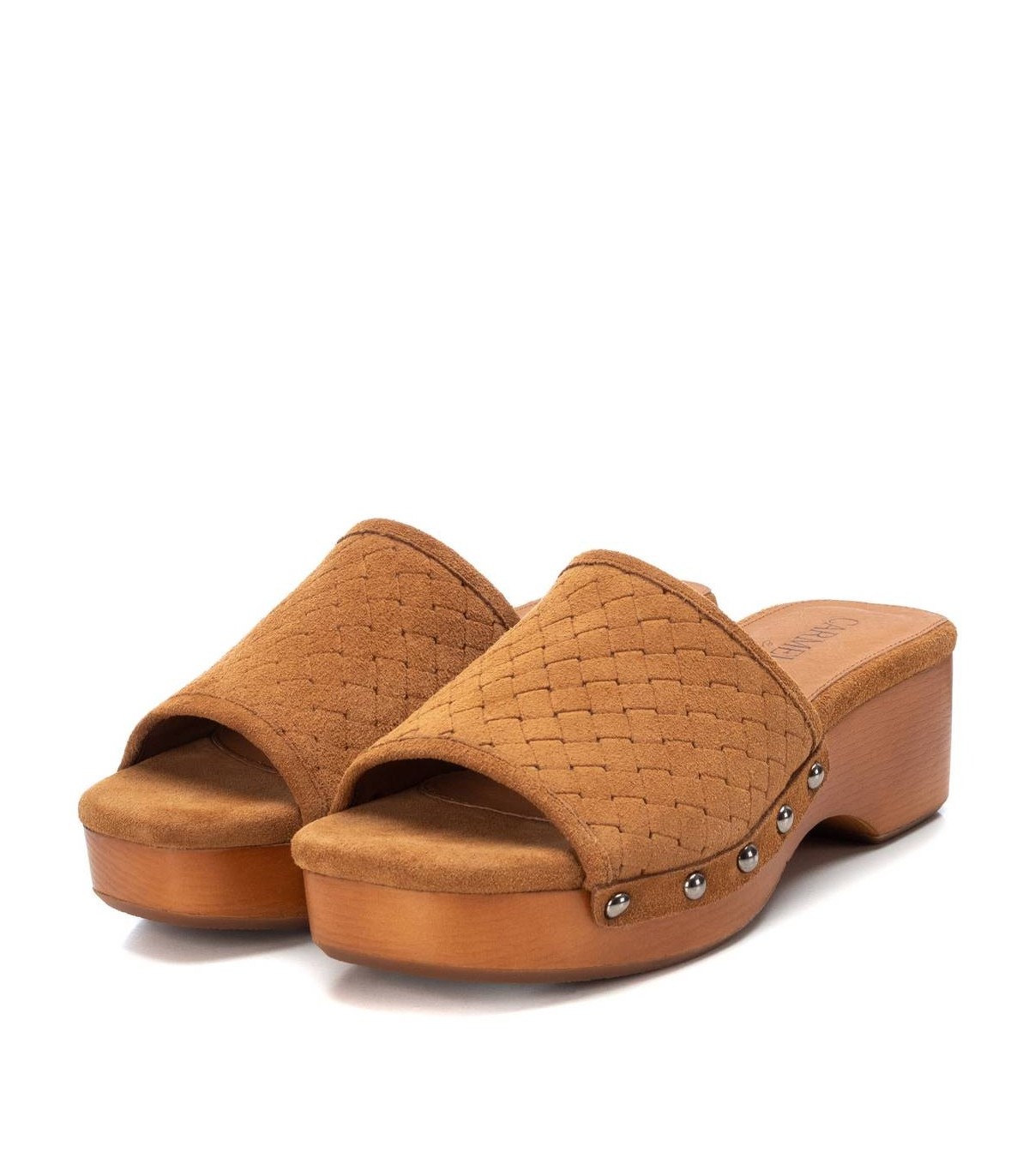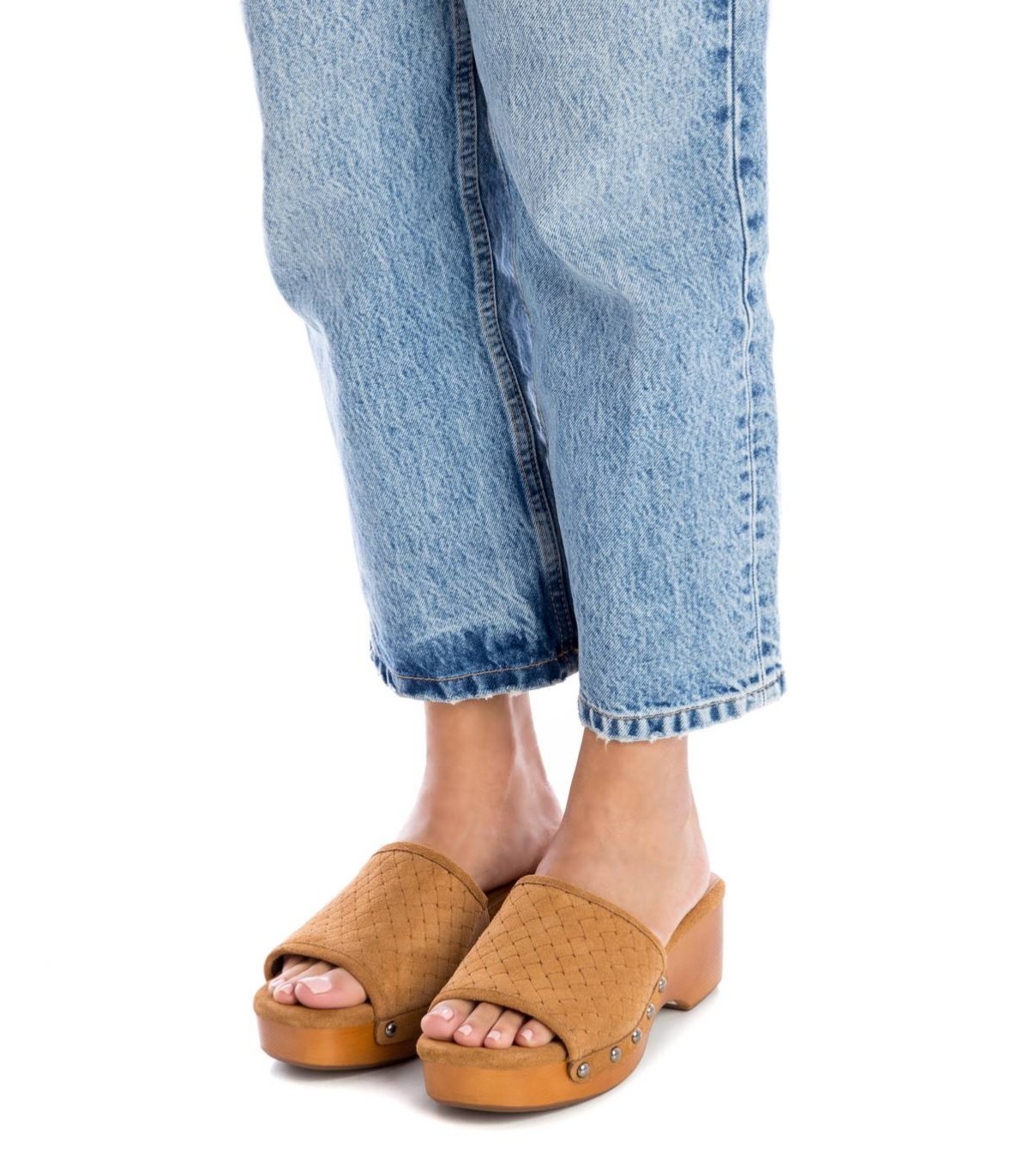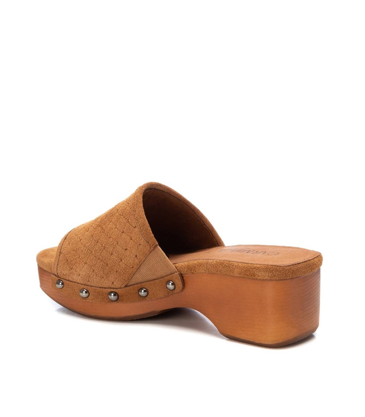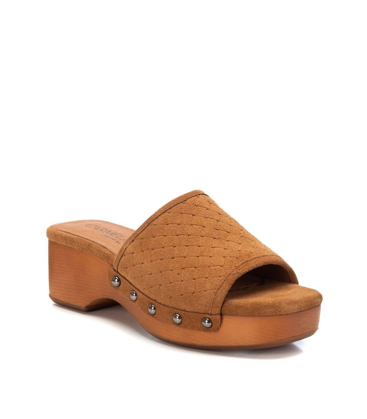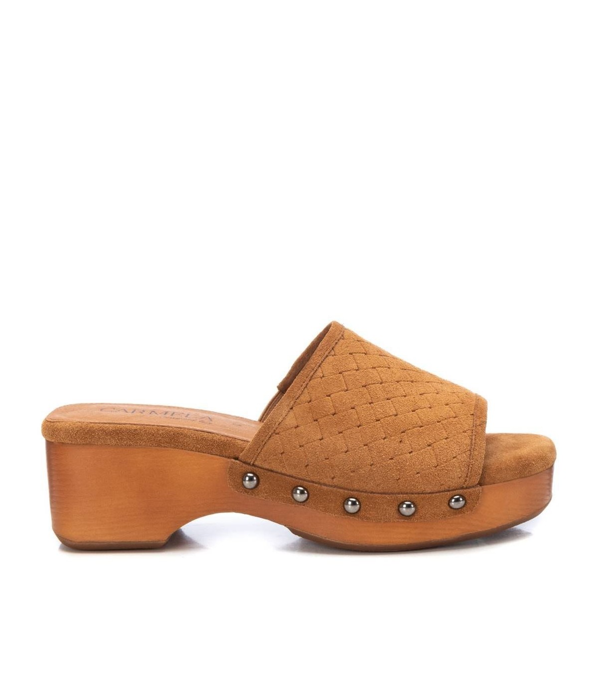 Sandalia de mujer, de la marca Carmela. Fabricada en serraje de alta calidad con diseño grabado. Modelo estilo zueco ideal para esta temporada. Piso con acabado madera y suela antideslizante.
