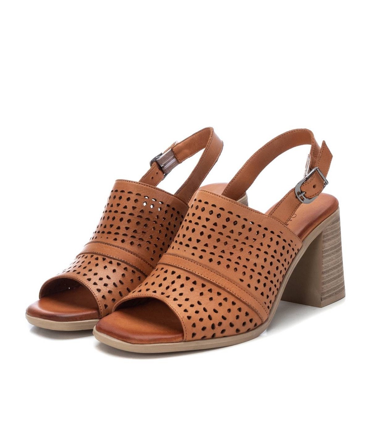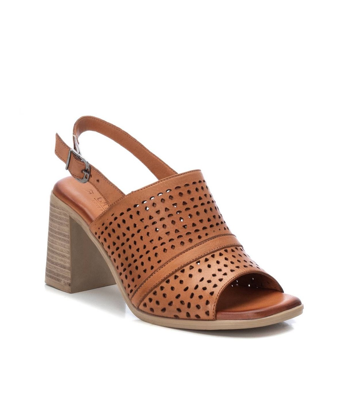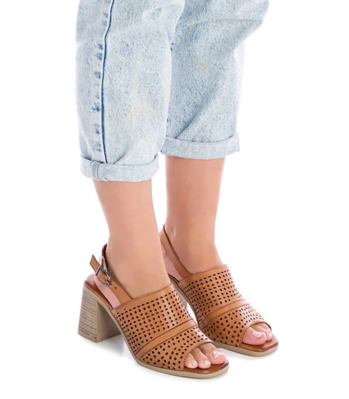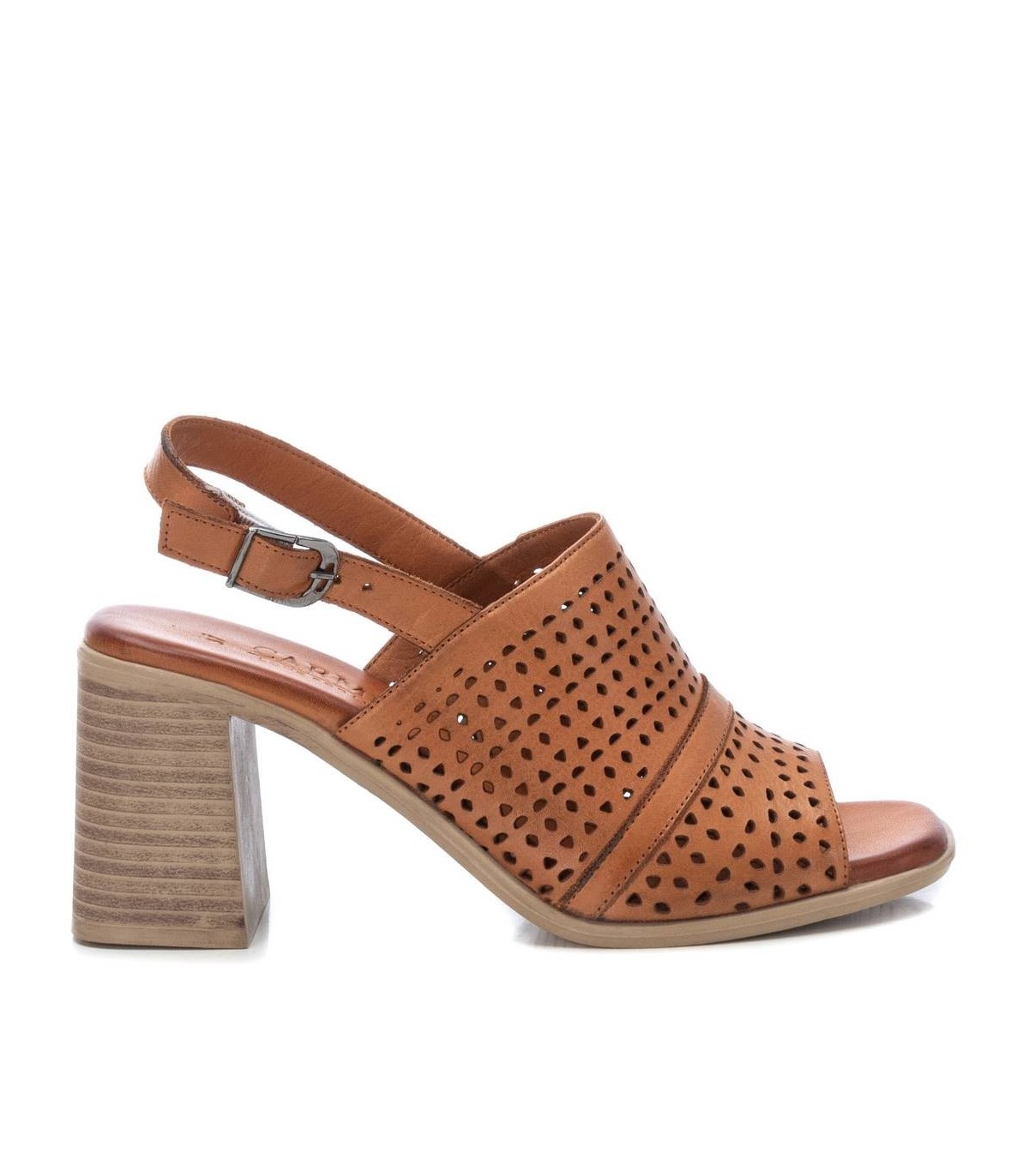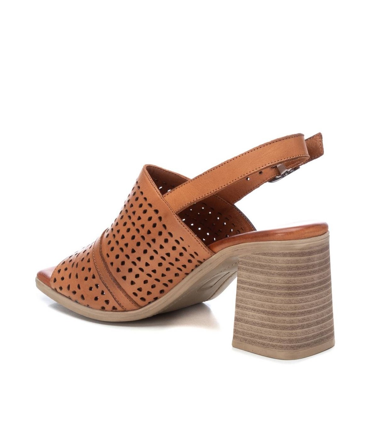 Sandalia de mujer, de la marca Carmela. Fabricada en piel de alta calidad con picados decorativos. Cierre mediante hebilla metálica. Tacón ancho de 9cm con acabado madera y suela antideslizante. Un modelo cómodo y con estilo ideal para esta temporada.