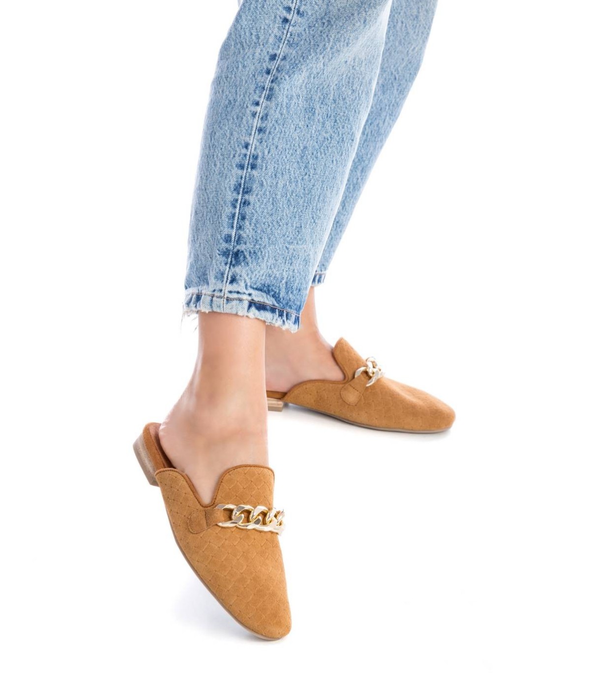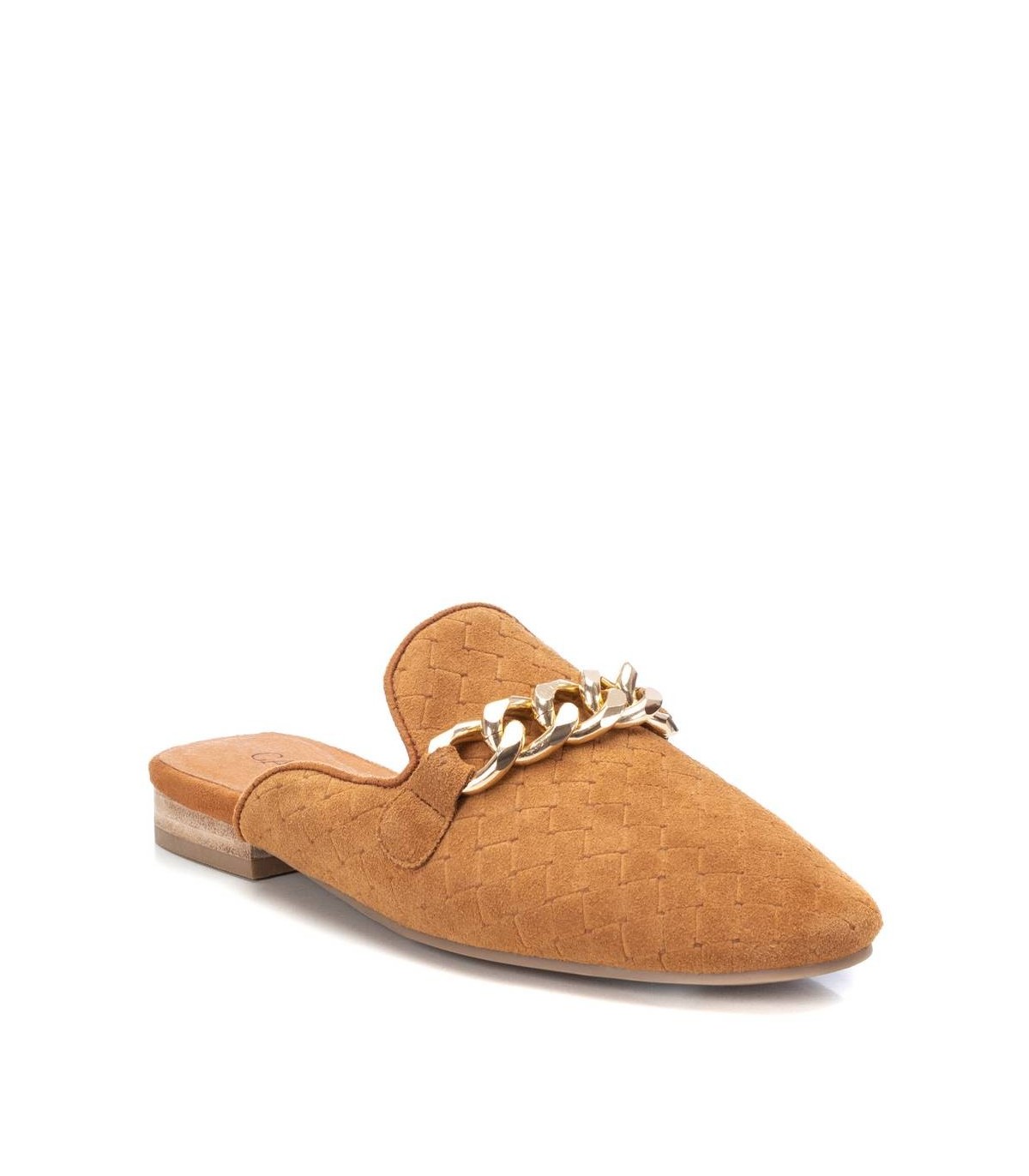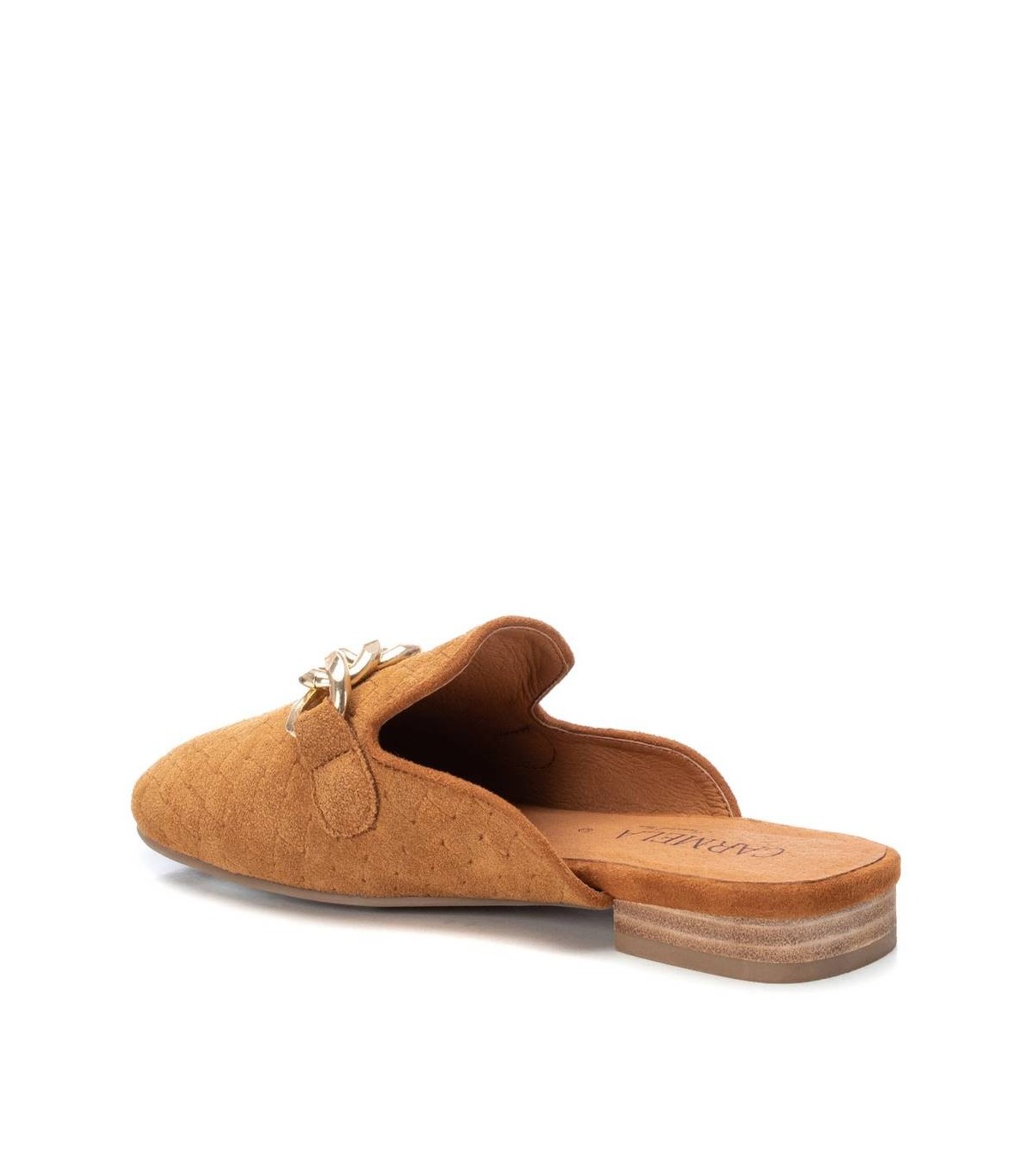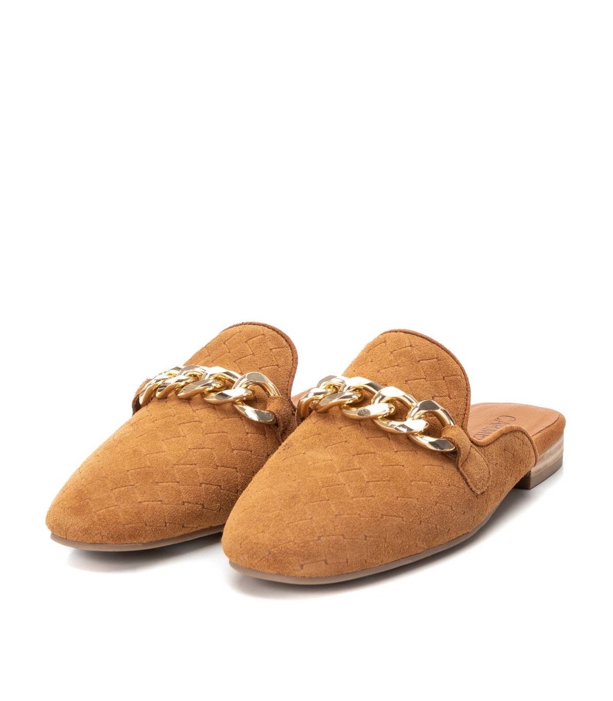 Zapato de mujer, de la marca Carmela. Fabricado en serraje de alta calidad con diseño geométrico. Diseño estilo mocasin destalonado con cadena metalizada decorativa en el frente. Suela de goma antideslizante.