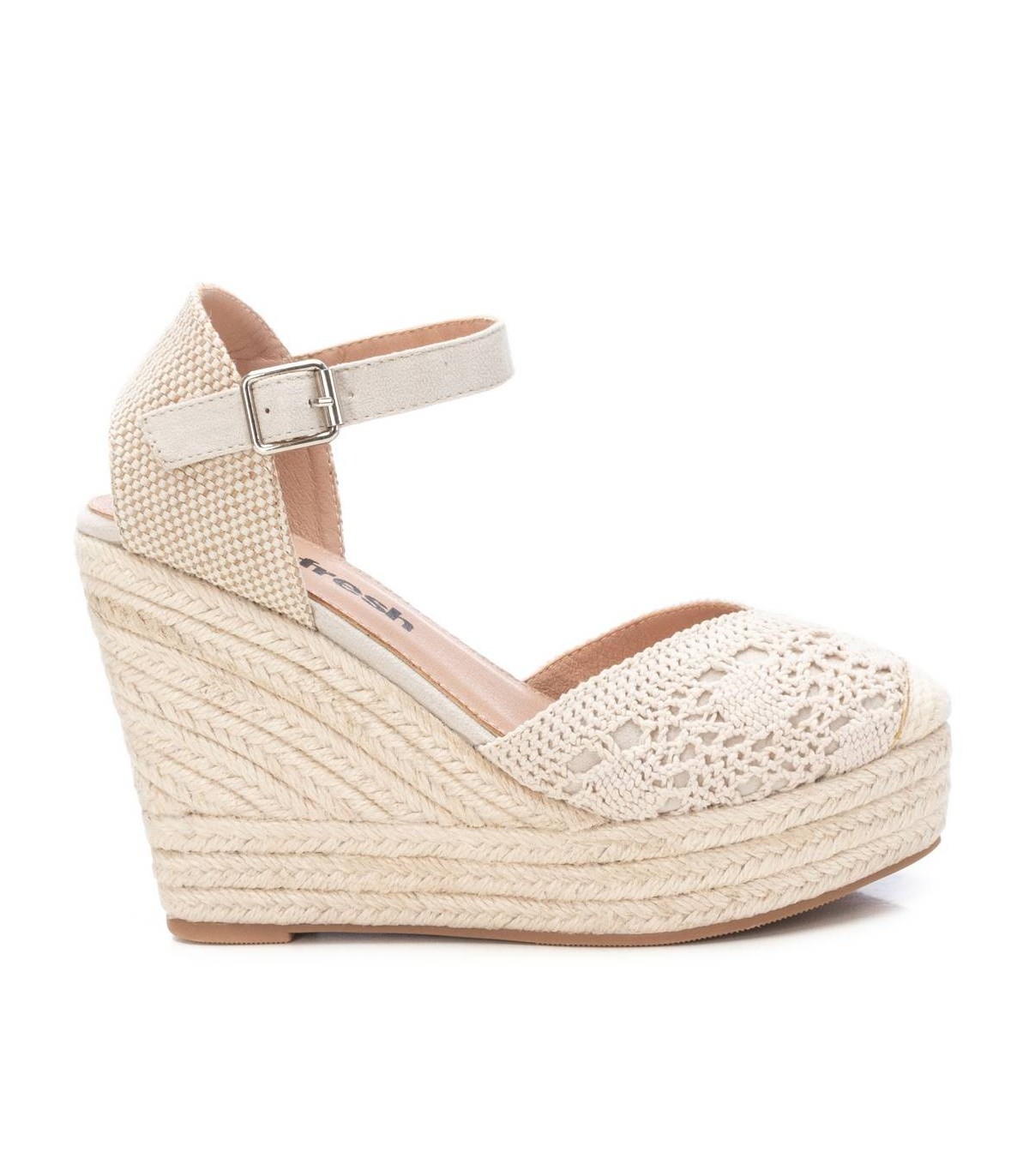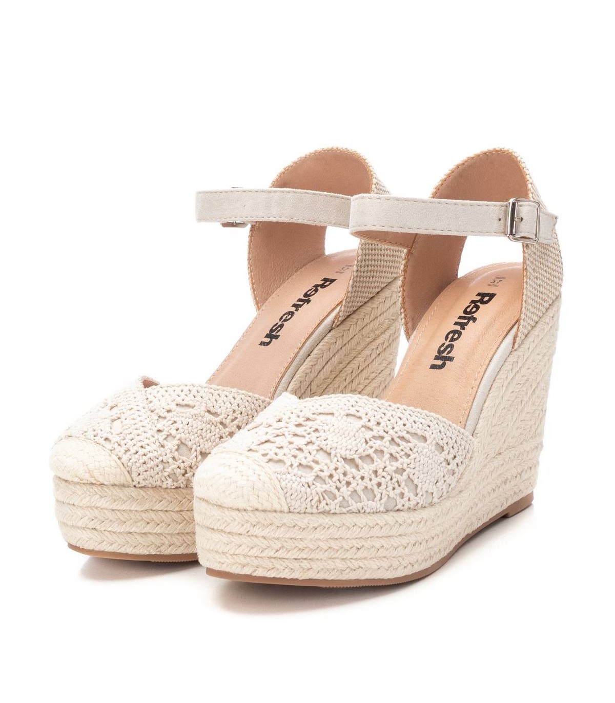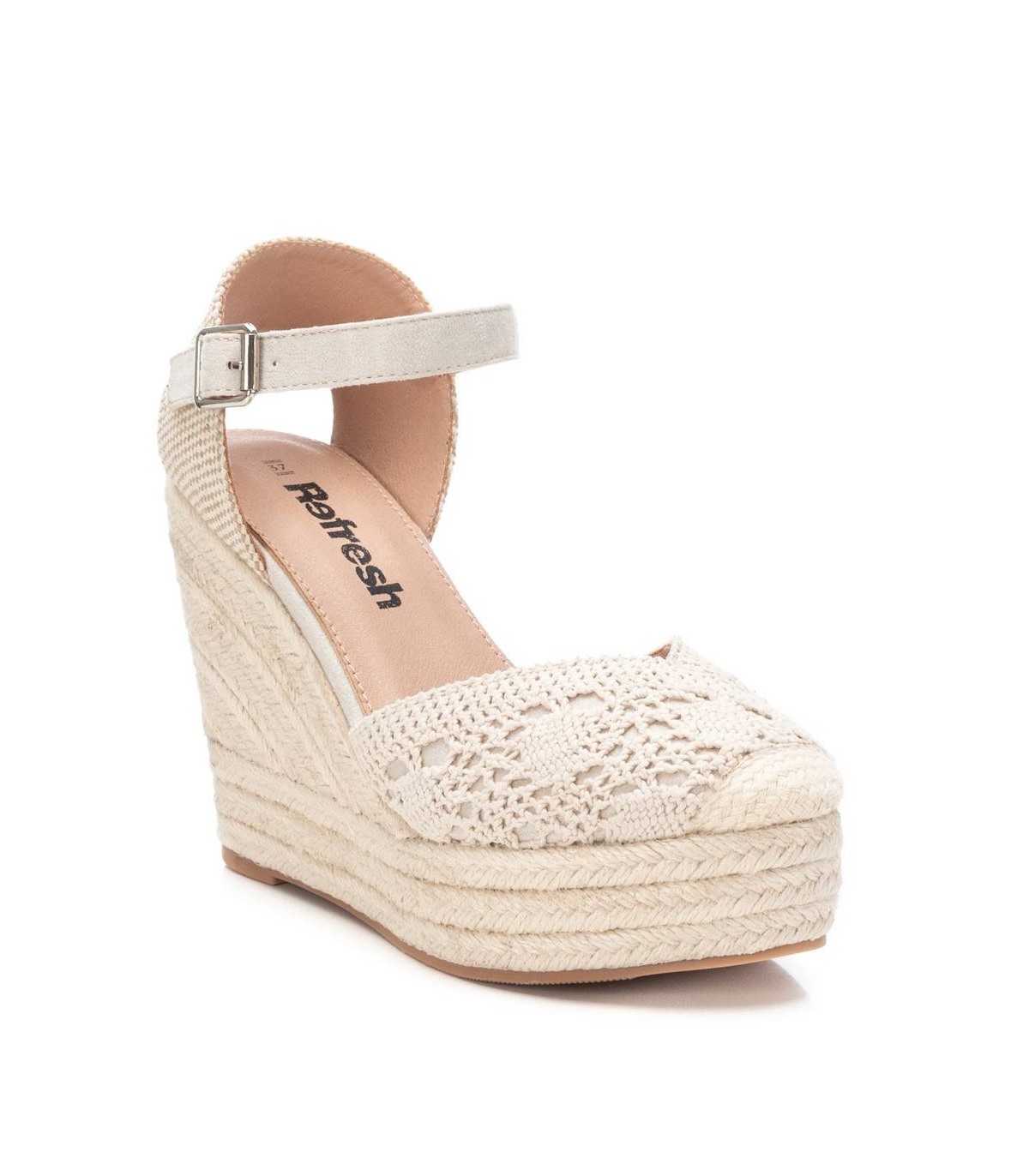 Valenciana de mujer, de la marca Refresh. Fabricada en tejido de ganchillo muy en tendencia esta temporada. Cierre mediante correa con hebilla. Cuña alta de 12 cm con plataforma delantera de yute y suela de goma antideslizante. Ideal para tus looks favoritos de verano. Este modelo ha obtenido el certificado vegano por la organización mundial PETA (Organización de los derechos de los animales).