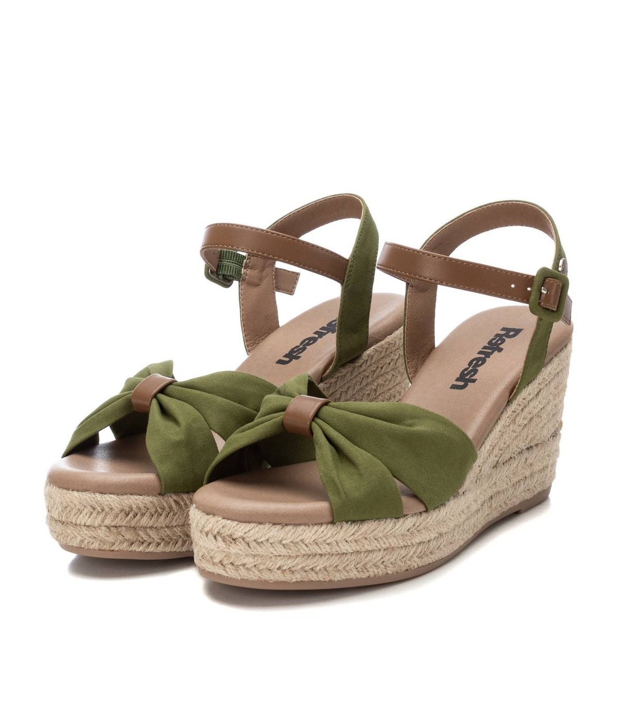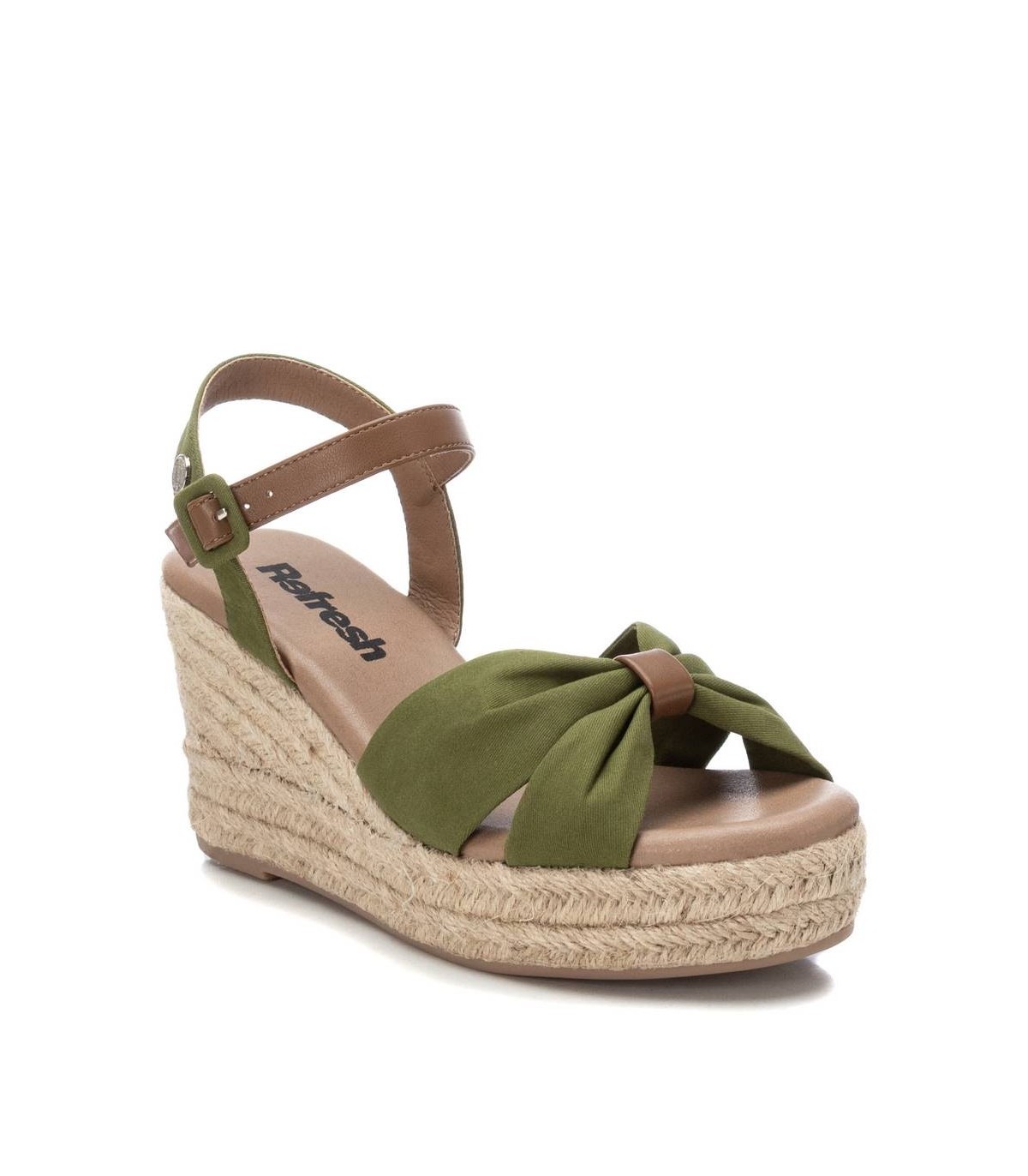 Sandalia de mujer, de la marca Refresh. Fabricada en lona. Cierre mediante correa con hebilla. Cuña de 9 cm con plataforma delantera de yute combinada con rafia. Suela de goma antideslizante. Pala con diseño de lazo ideal para combinar con tus mejores looks. Este modelo ha obtenido el certificado vegano por la organización mundial PETA (Organización de los derechos de los animales).