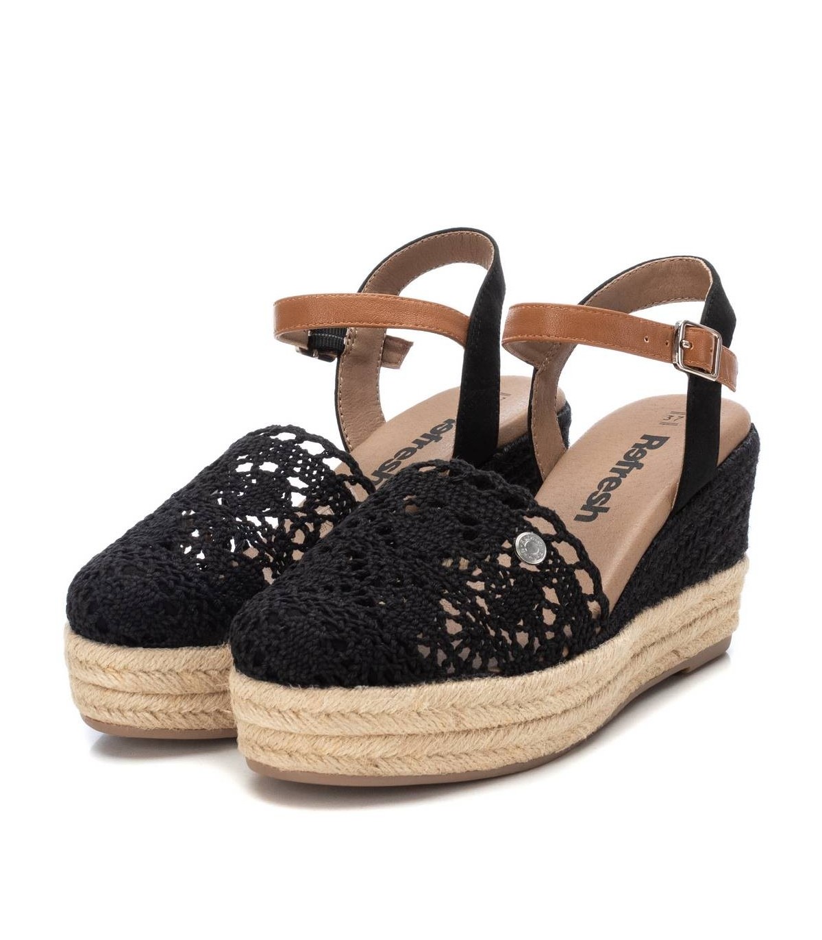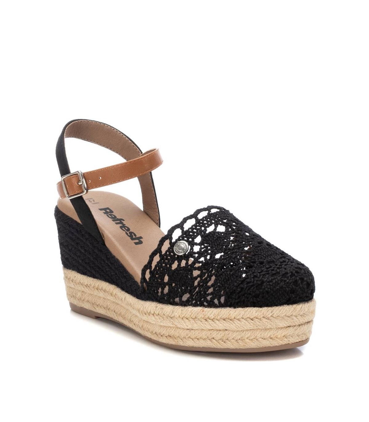 Valenciana de mujer, de la marca Refresh. Fabricada en tejido de ganchillo. Cierre mediante correa de material que imita la piel con hebilla. Cómoda cuña de 9 cm de yute con plataforma delantera. Suela de goma antideslizante. Combinalo con tus looks más veraniegos. Este modelo ha obtenido el certificado vegano por la organización mundial PETA (Organización de los derechos de los animales).
