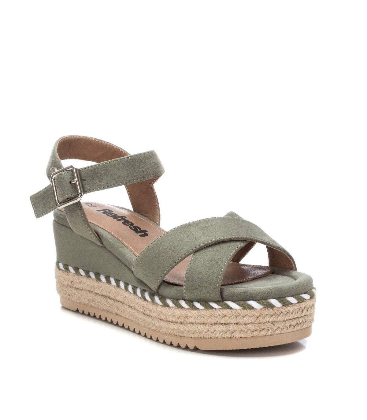 Sandalia de mujer, de la marca Refresh. Fabricada en suave antelina. Pala cruzada y correa al tobillo con hebilla. Cuña de 7 cm forrada de antelina y yute con detalle de cordón bicolor. Suela de goma antideslizante. Un modelo que combinará a la perfeccion con tus looks de esta temporada. Este modelo ha obtenido el certificado vegano por la organización mundial PETA (Organización de los derechos de los animales).