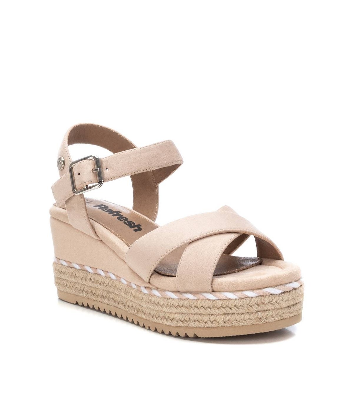 Sandalia de mujer, de la marca Refresh. Fabricada en suave antelina. Pala cruzada y correa al tobillo con hebilla. Cuña de 7 cm forrada de antelina y yute con detalle de cordón bicolor. Suela de goma antideslizante. Un modelo que combinará a la perfeccion con tus looks de esta temporada. Este modelo ha obtenido el certificado vegano por la organización mundial PETA (Organización de los derechos de los animales).