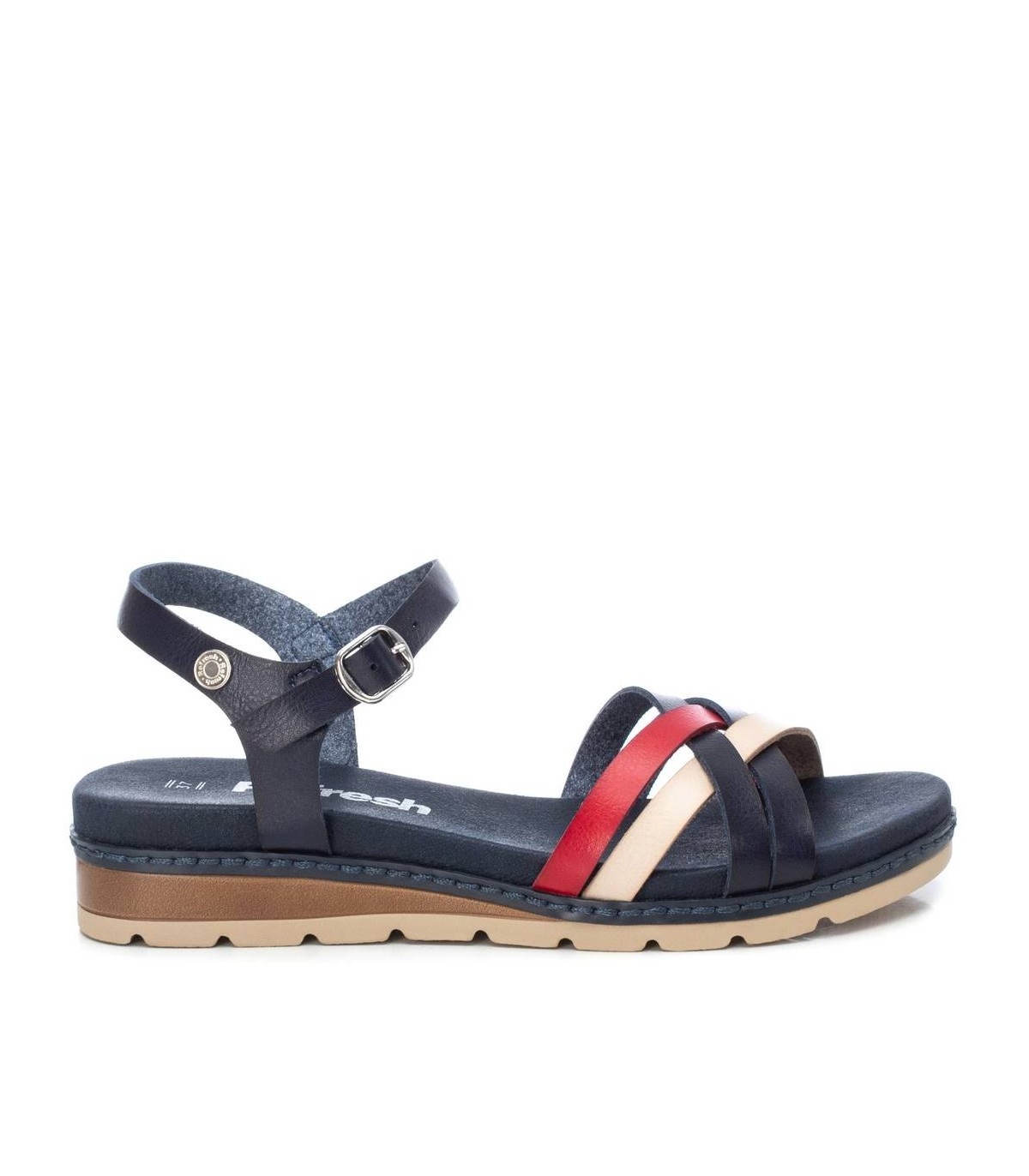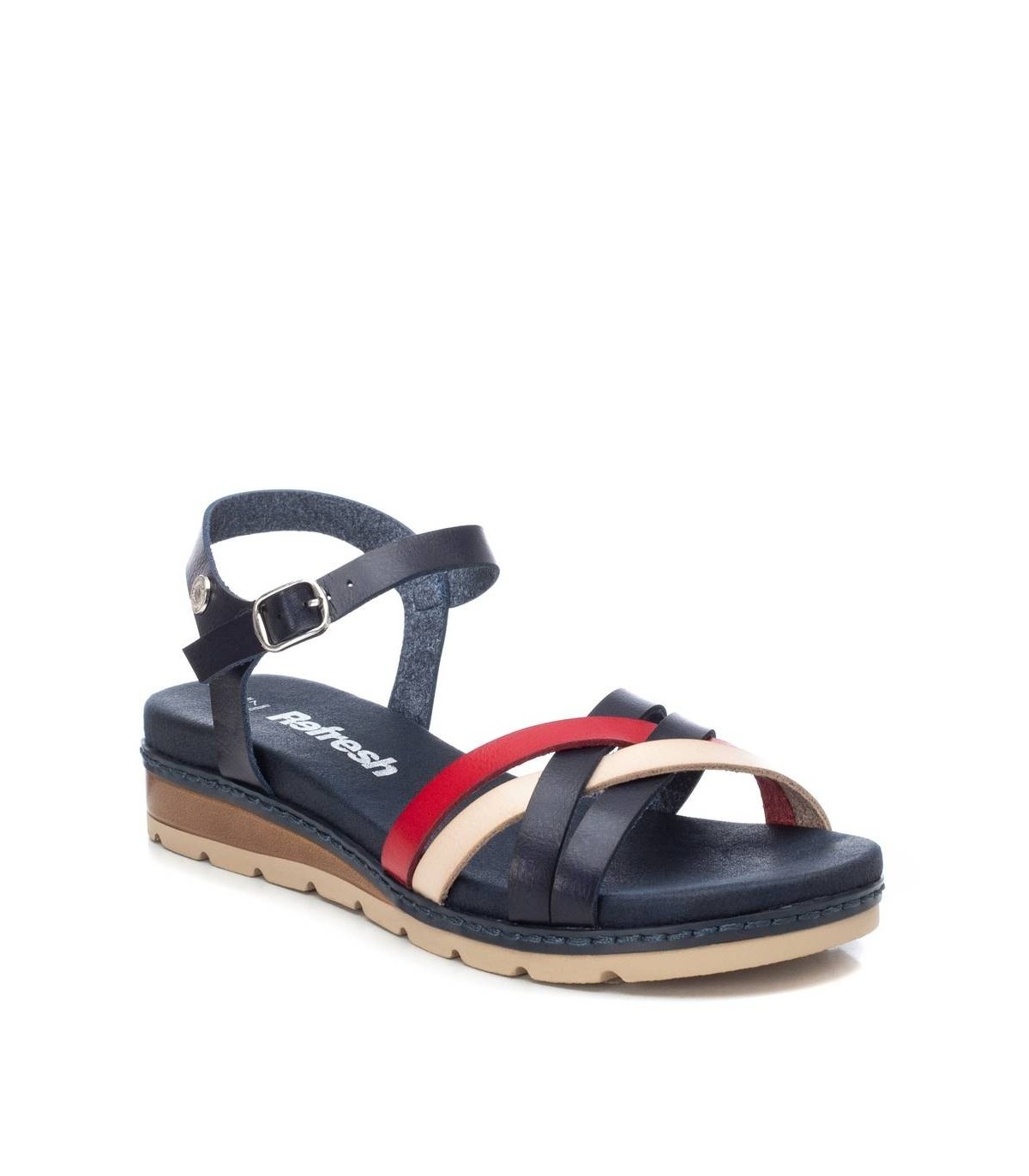 Sandalia de mujer, de la marca Refresh. Fabricada en material que imita la piel. Diseño de pala trenzada y correa al tobillo con hebilla. Modelo plano con pequeña cuña de 4 cm para mayor comodidad. Suela antideslizante. Ideal para el dia a dia. Este modelo ha obtenido el certificado vegano por la organización mundial PETA (Organización de los derechos de los animales).