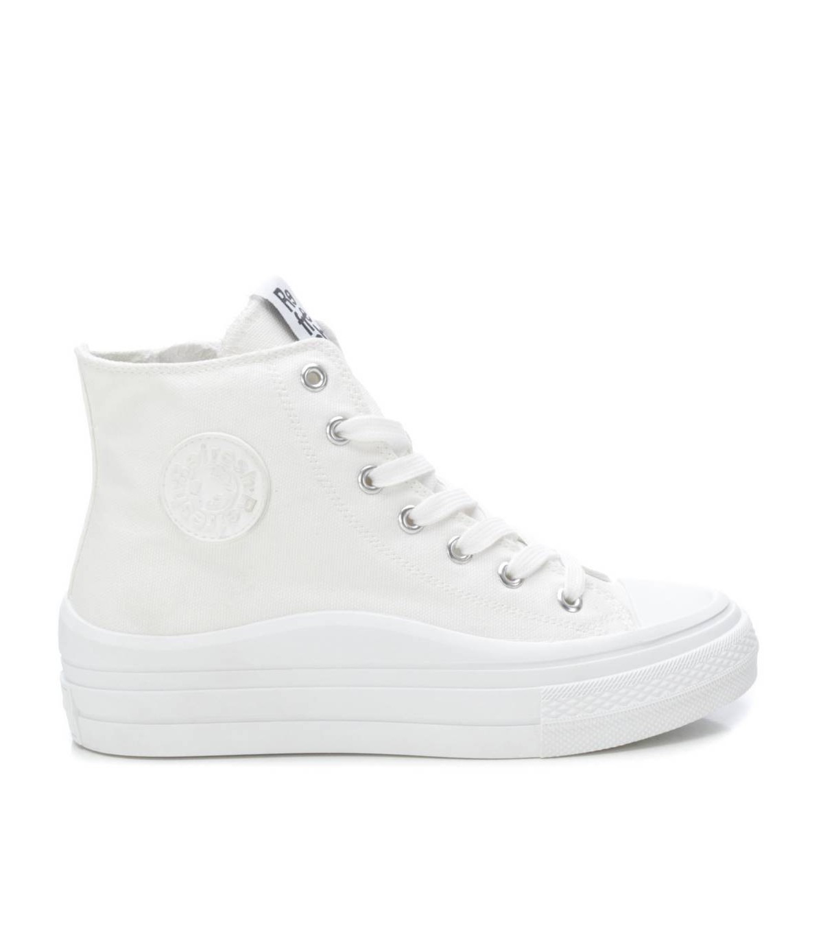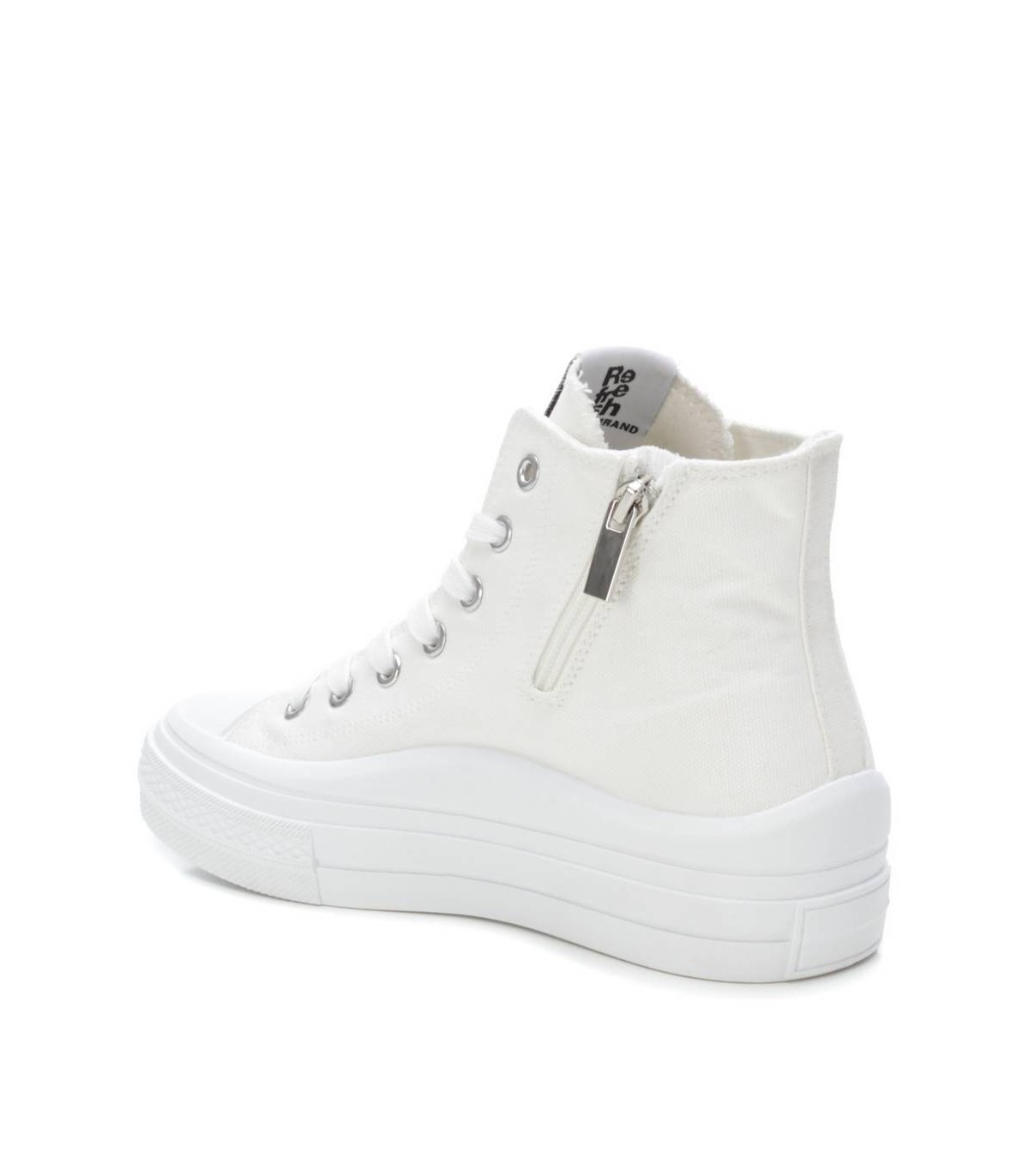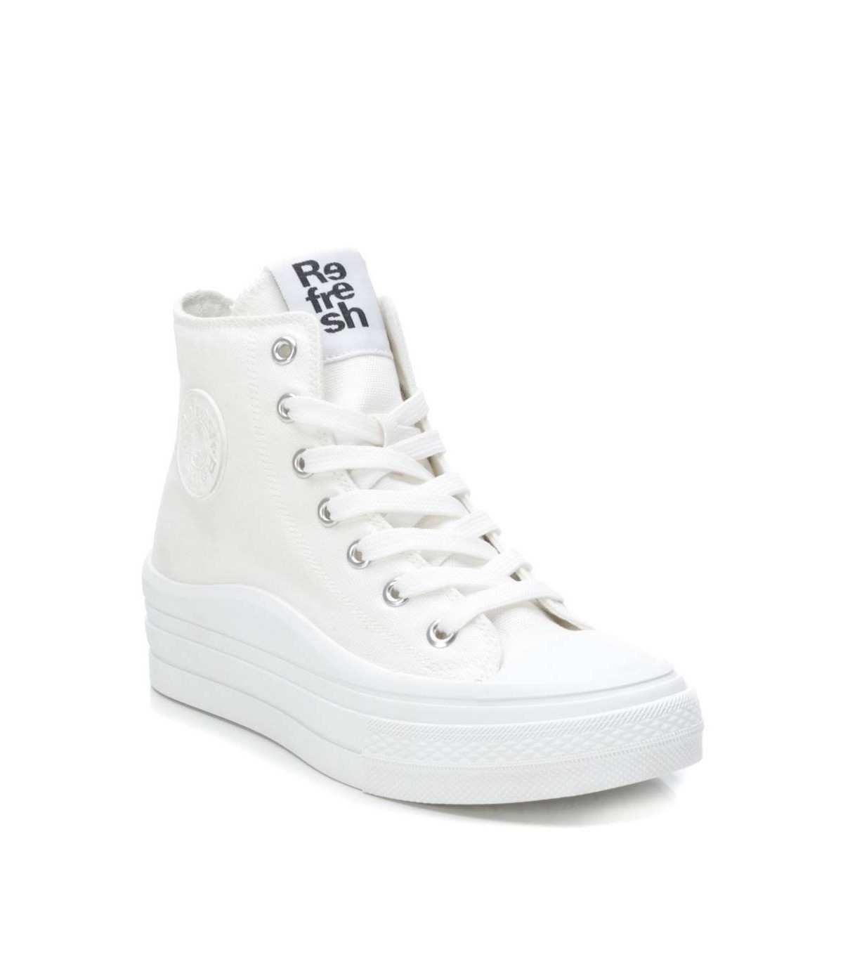 Botín deportivo de mujer, de la marca Refresh. Fabricado en lona ideal para el verano. Cierre mediante cremallera lateral y cordones ajustables. Doble piso con diseño de onda con suela de goma antideslizante. Este modelo ha obtenido el certificado vegano por la organización mundial PETA (Organización de los derechos de los animales).