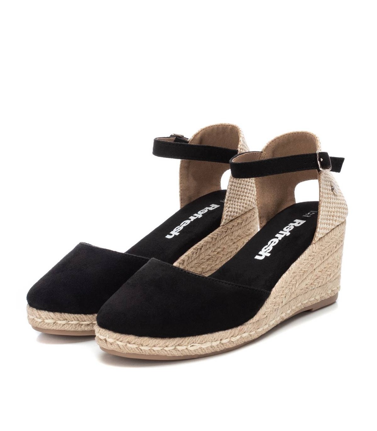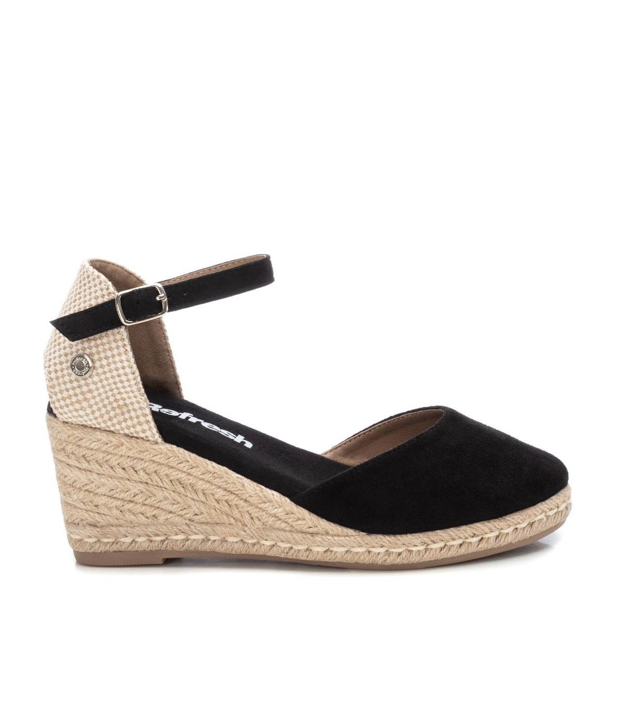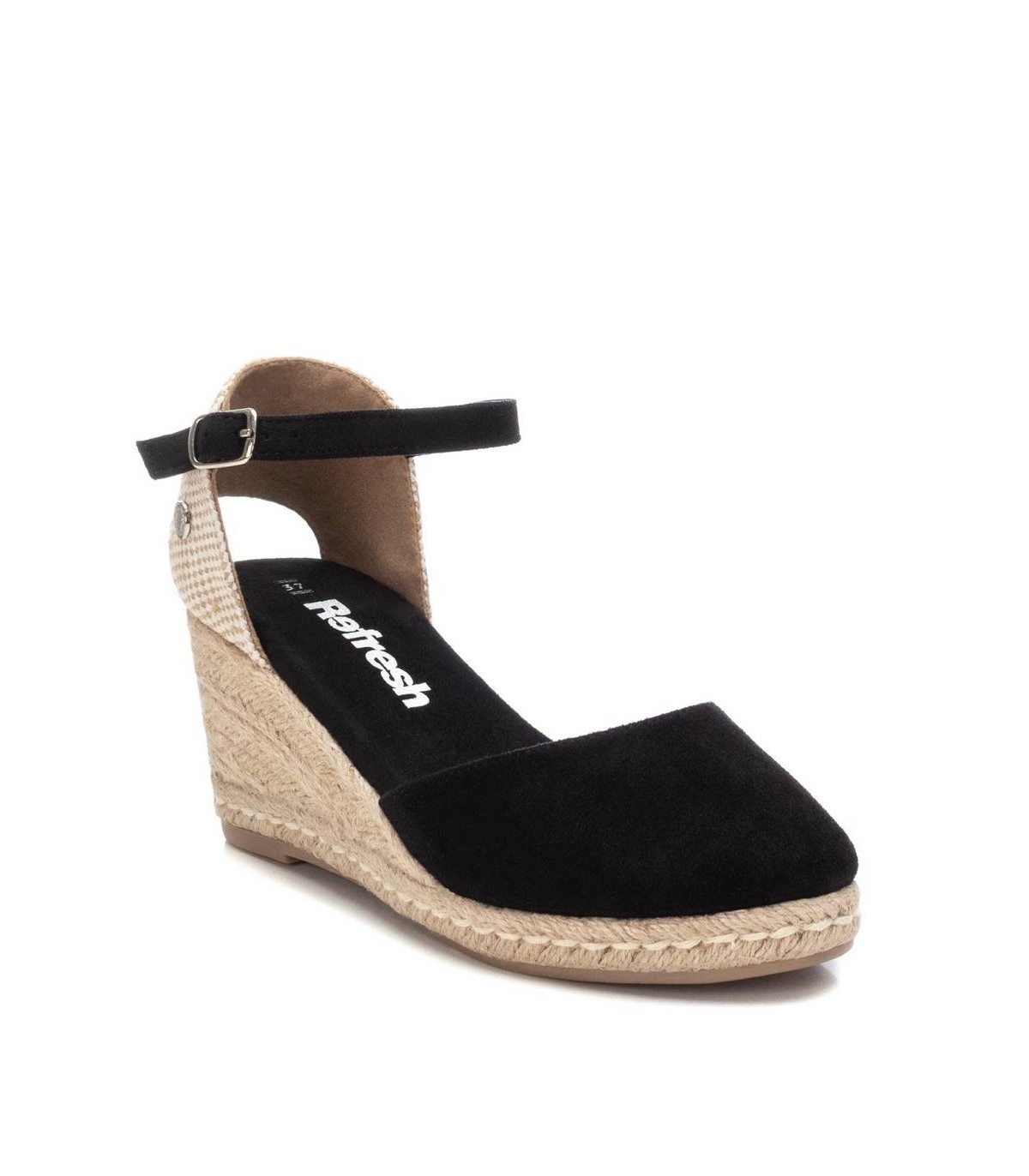 Alpargata tipo valenciana de mujer, de la marca Refresh. Fabricada en suave antelina. Pulsera al tobillo con hebilla. Cuña de 8 cm de yute y suela de goma antideslizante. Este modelo ha obtenido el certificado vegano por la organización mundial PETA (Organización de los derechos de los animales).