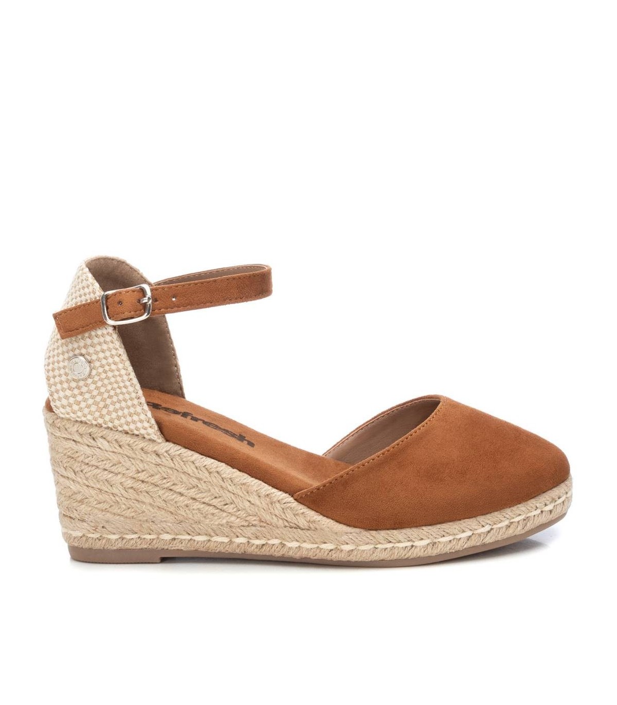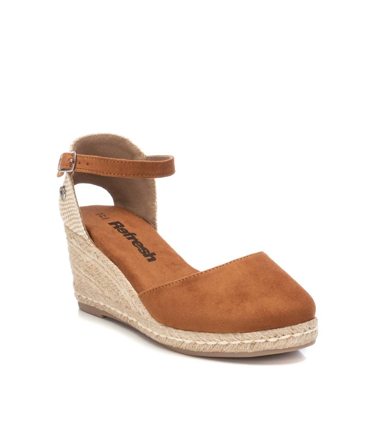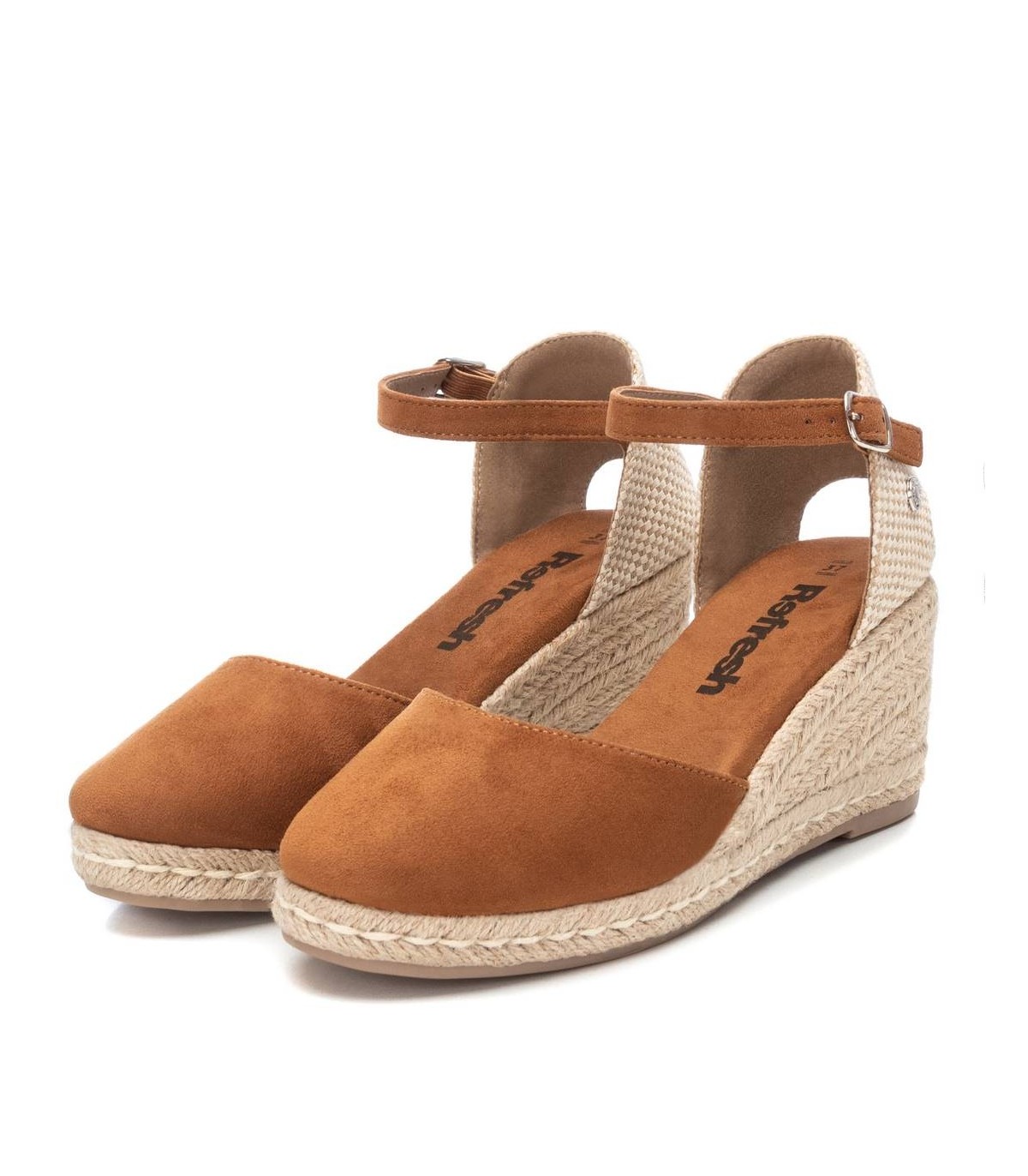 Alpargata tipo valenciana de mujer, de la marca Refresh. Fabricada en suave antelina. Pulsera al tobillo con hebilla. Cuña de 8 cm de yute y suela de goma antideslizante. Este modelo ha obtenido el certificado vegano por la organización mundial PETA (Organización de los derechos de los animales).