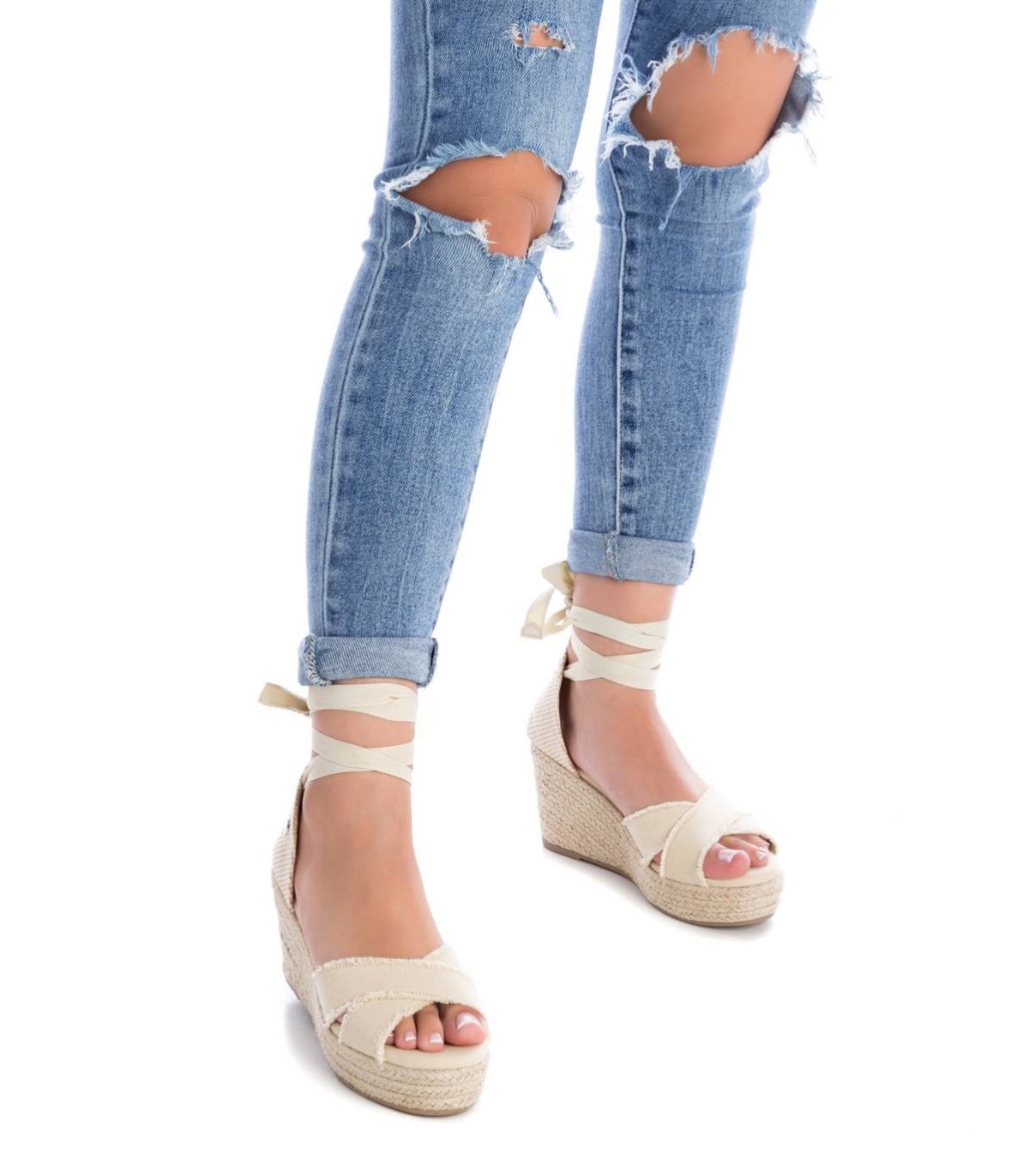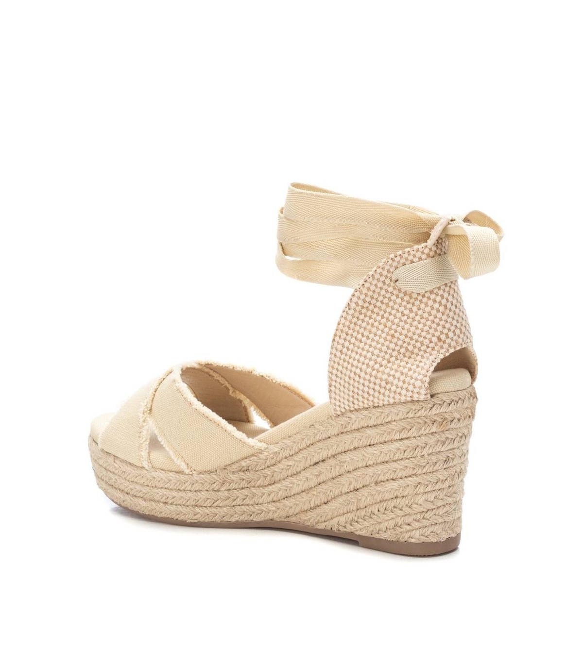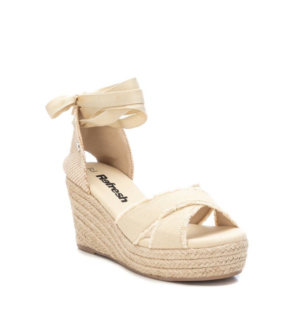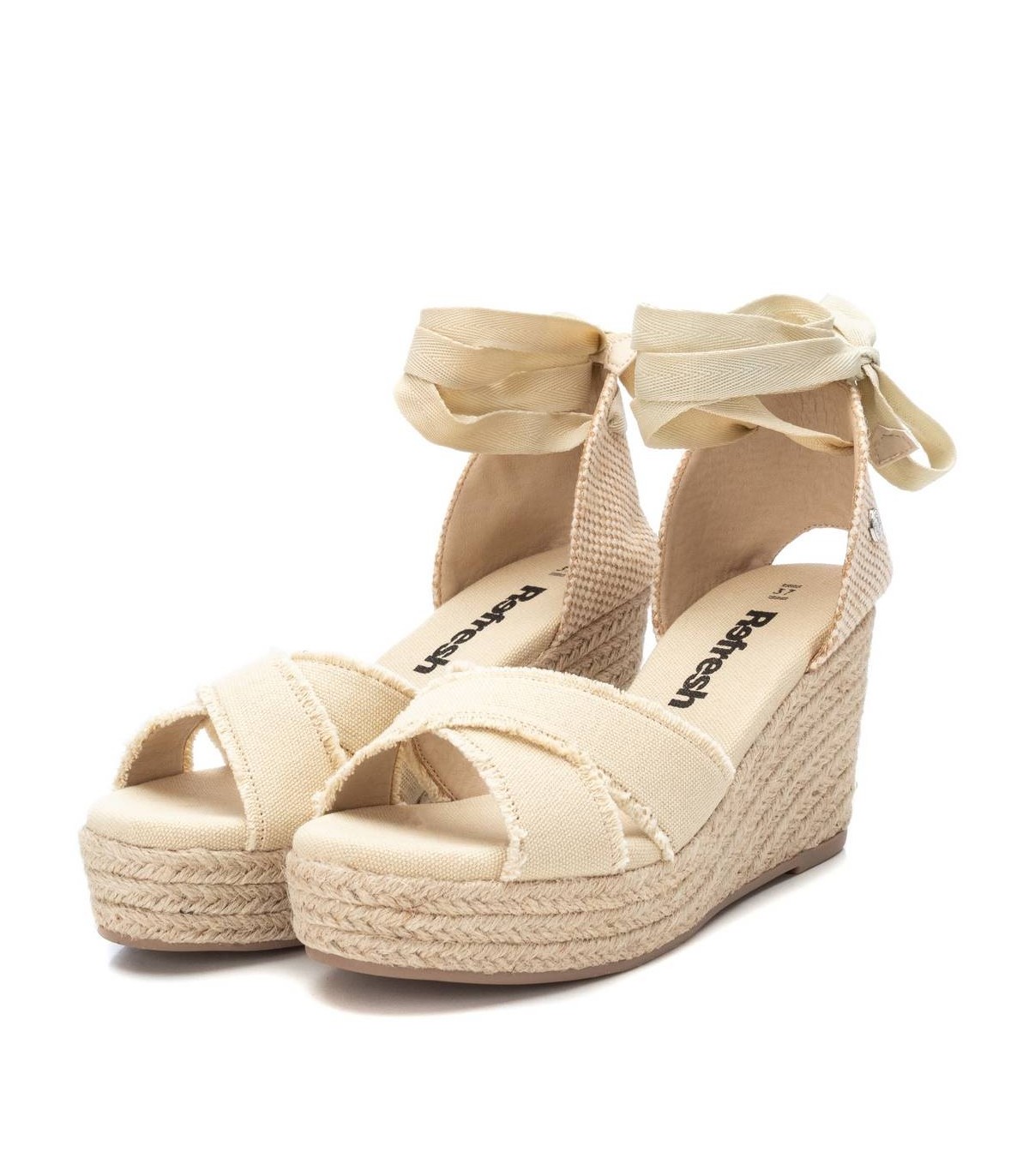 Sandalia de mujer, de la marca Refresh. Fabricada en lona con detalle deshilachado. Pala cruzada y cintas al tobillo. Cuña de 9 cm de yute con plataforma delantera. Suela de goma antideslizante. Este modelo ha obtenido el certificado vegano por la organización mundial PETA (Organización de los derechos de los animales).