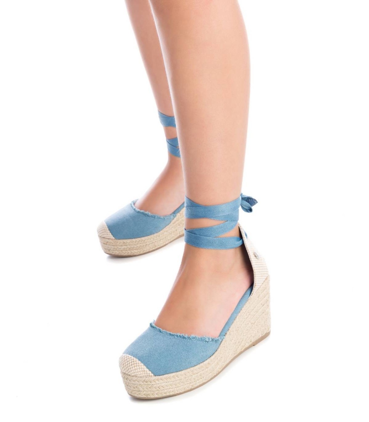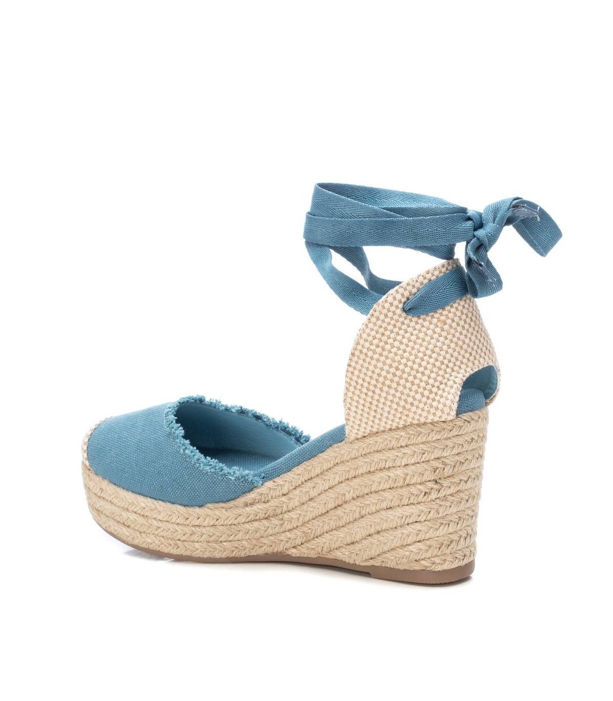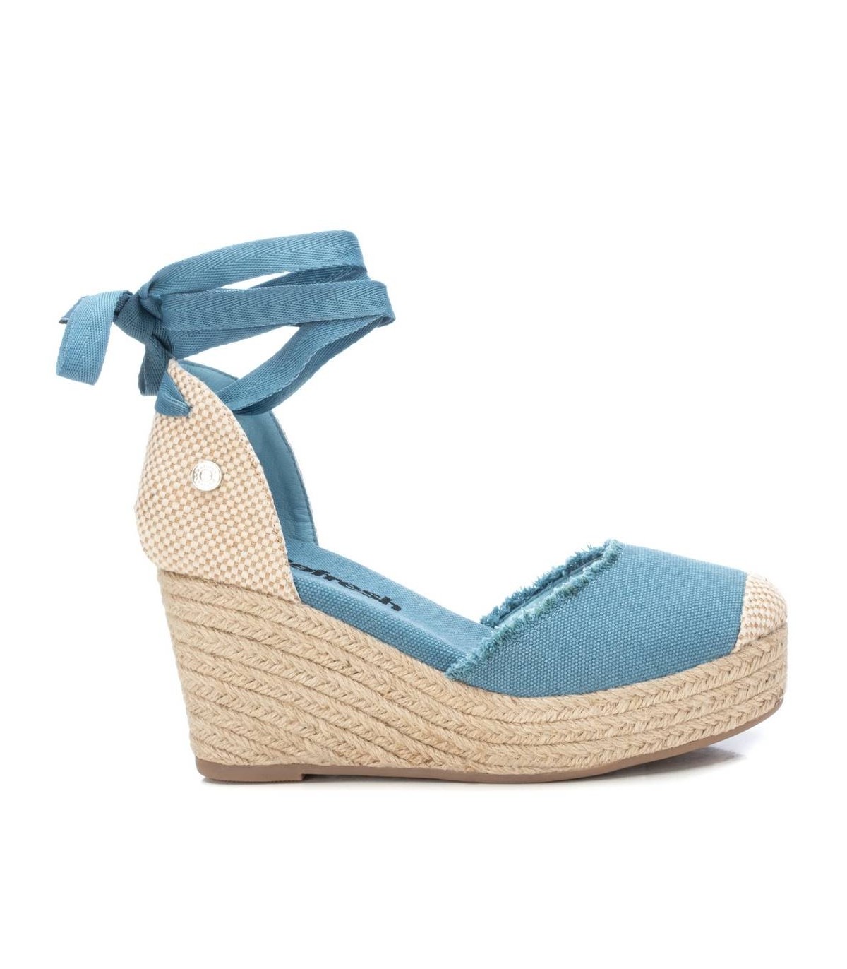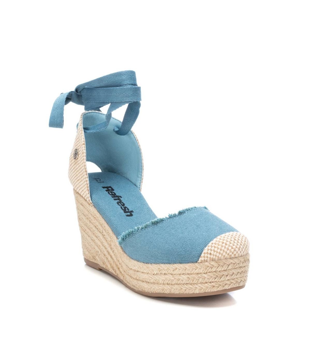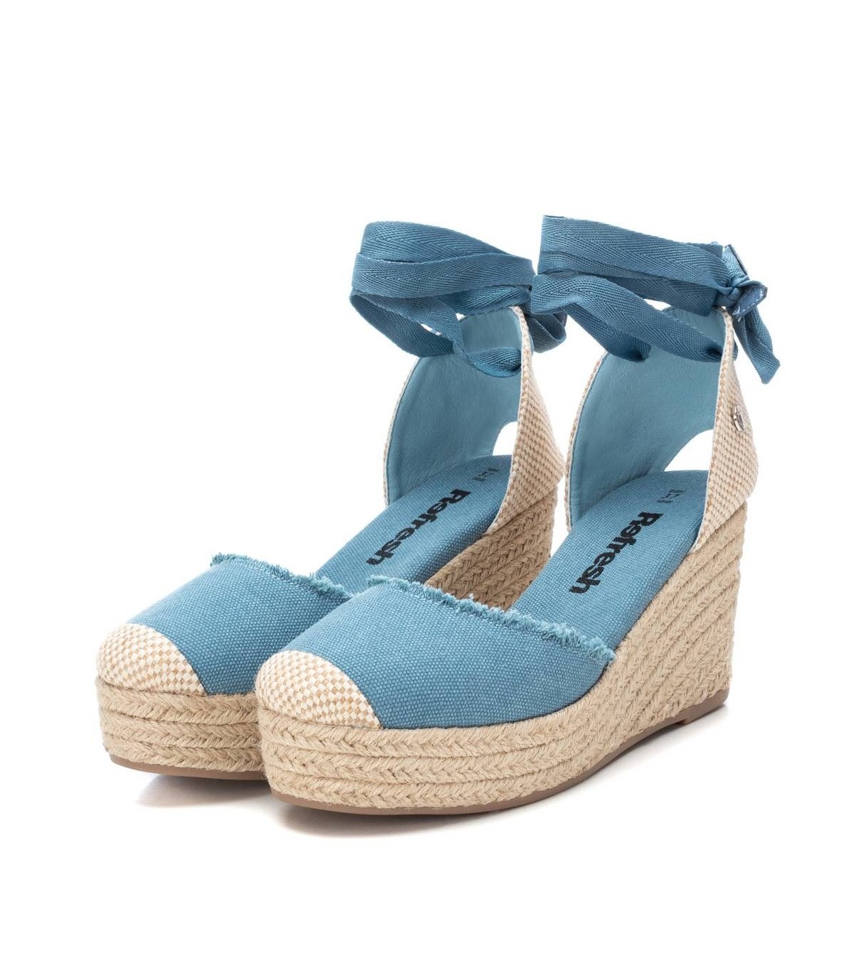 Valenciana de mujer, de la marca Refresh. Fabricada en lona con detalle deshilachado. Puntera reforzada y cintas atadas al tobillo. Cuña de 9 cm de yute con plataforma delantera. Suela de goma antideslizante. Este modelo ha obtenido el certificado vegano por la organización mundial PETA (Organización de los derechos de los animales).