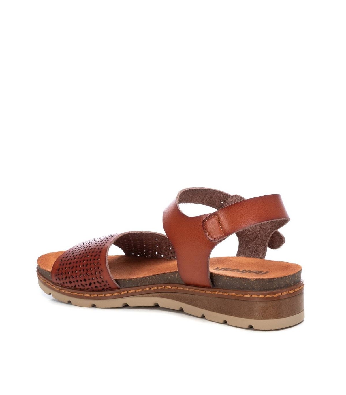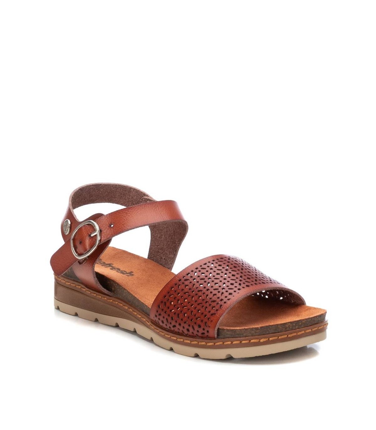 Sandalia de mujer, de la marca Refresh. Fabricada en material que imita la piel con diseño calado. Diseño de pala y pulsera con hebilla para una buena sujeción. Cómoda cuña de 4 cm con suela antideslizante. Este modelo ha obtenido el certificado vegano por la organización mundial PETA (Organización de los derechos de los animales).