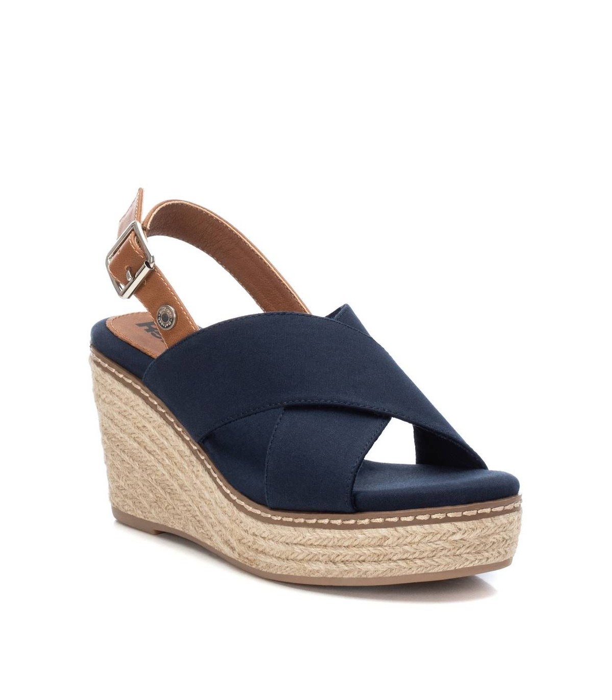 Sandalia de mujer, de la marca Refresh. Fabricada en lona con correa de material que imita la piel. Diseño de pala ancha cruzada. Cierre mediante hebilla. Cuña de 9 cm con plataforma delantera de yute y suela de goma antideslizante. Este modelo ha obtenido el certificado vegano por la organización mundial PETA (Organización de los derechos de los animales).
