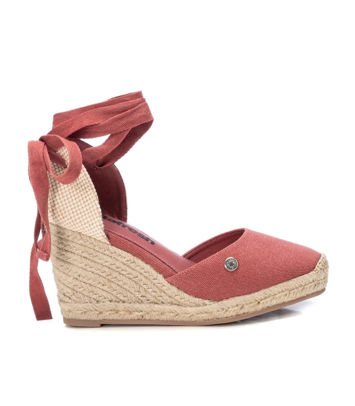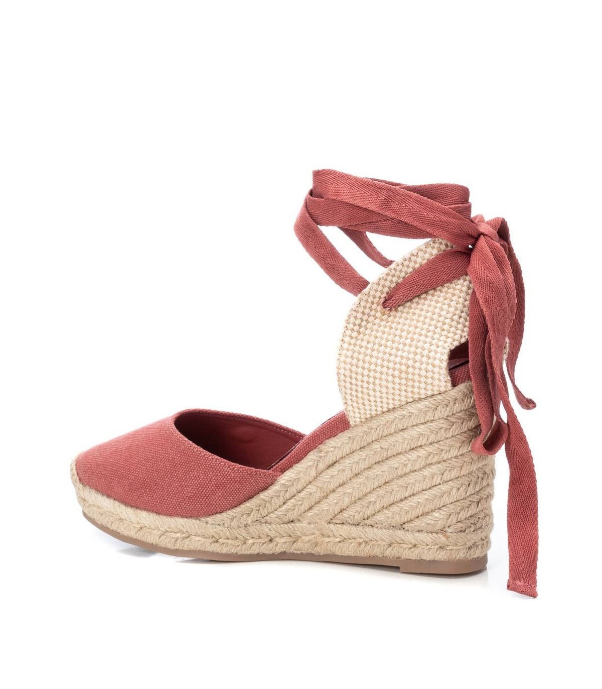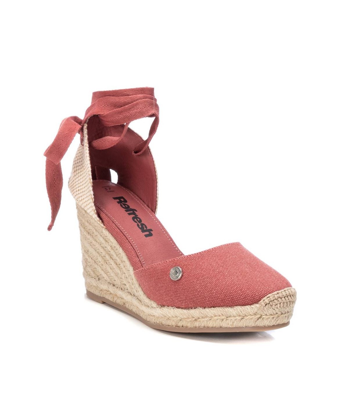 Alpargata de mujer tipo valenciana, de la marca Refresh. Fabricada en material textil. Un modelo ideal para tus looks veraniegos por sus cintas atadas al tobillo. Puntera reforzada. Cuña de 9 cm con plataforma delantera de yute y suela de goma antideslizante. Este modelo ha obtenido el certificado vegano por la organización mundial PETA (Organización de los derechos de los animales).