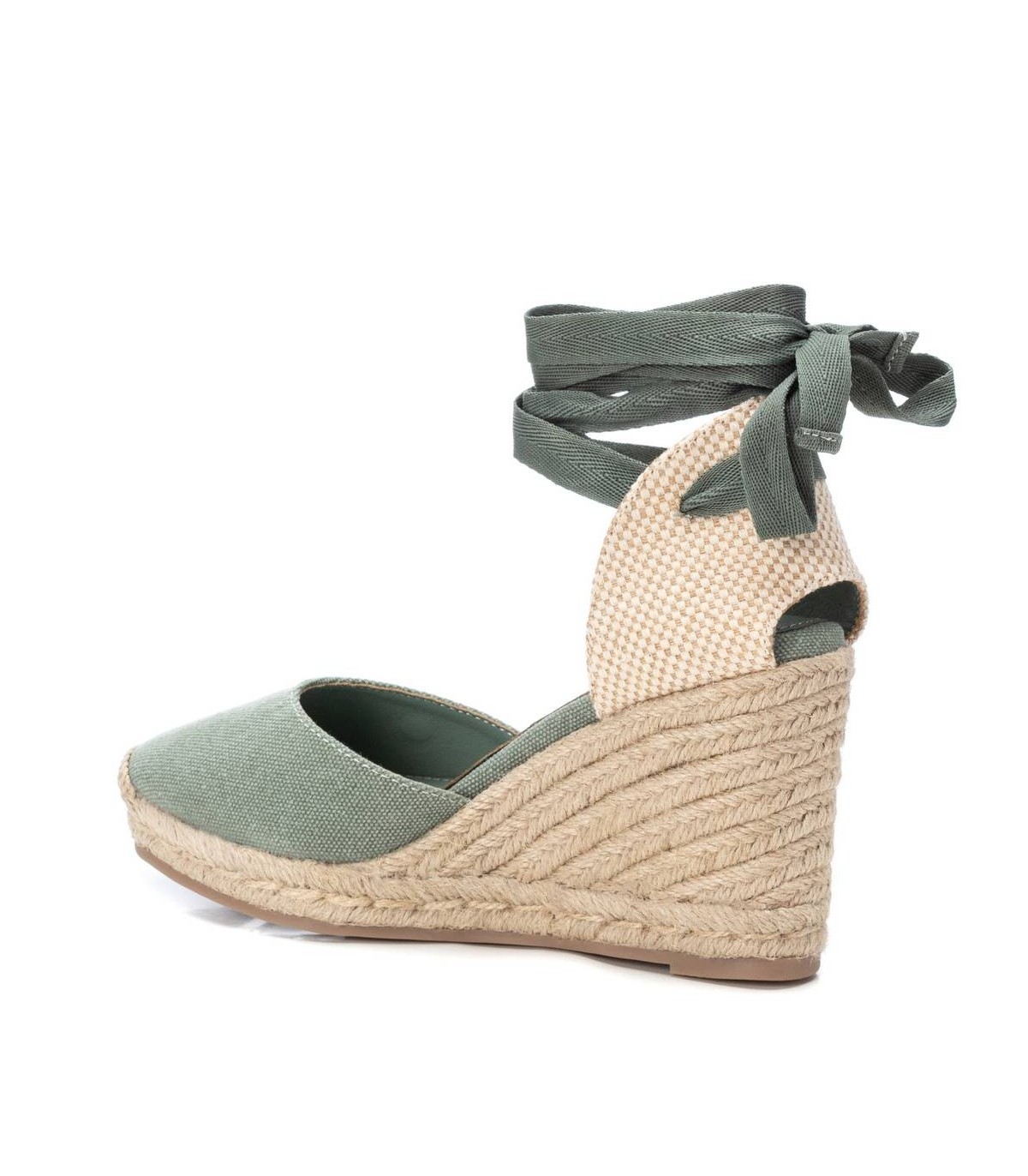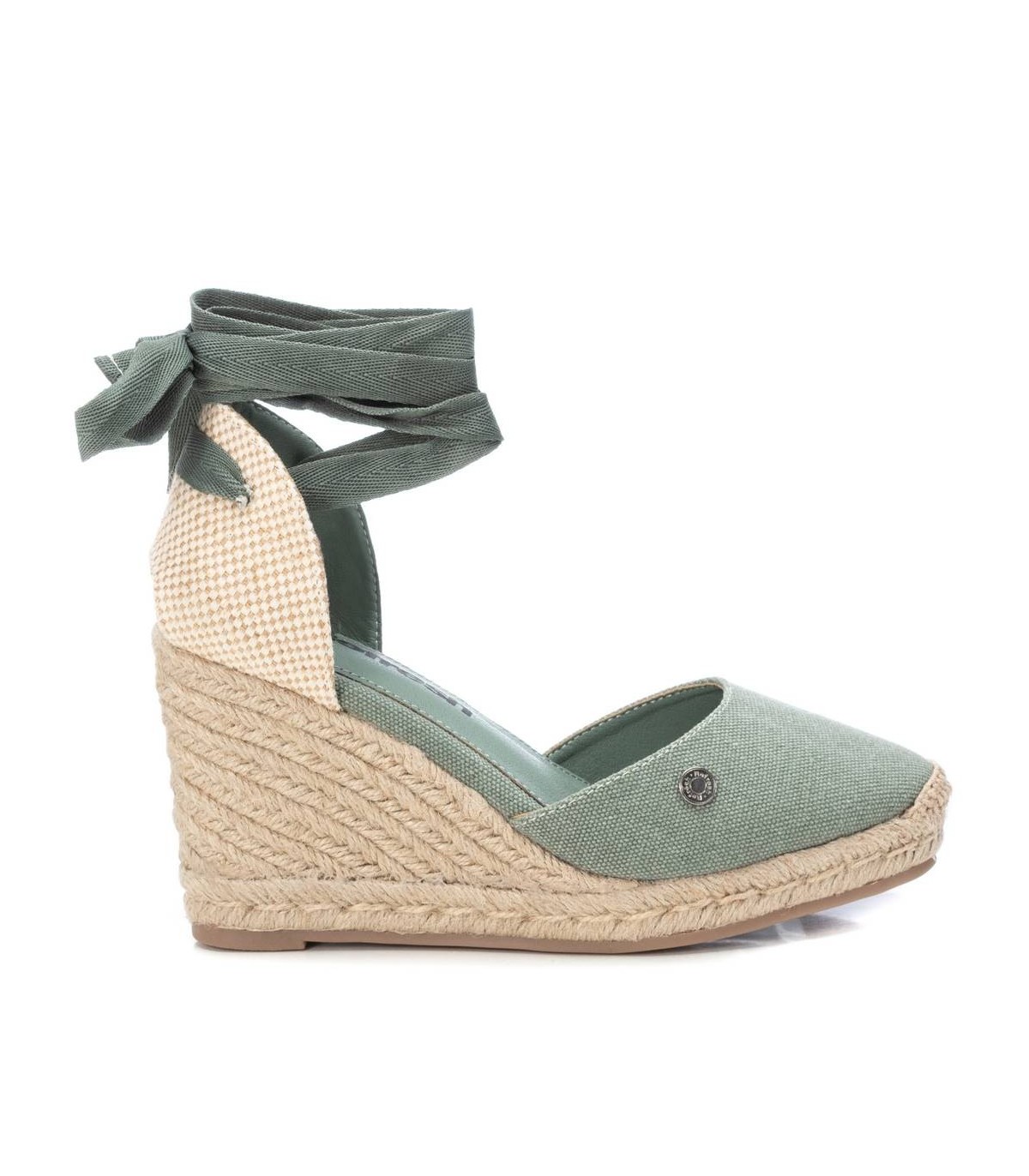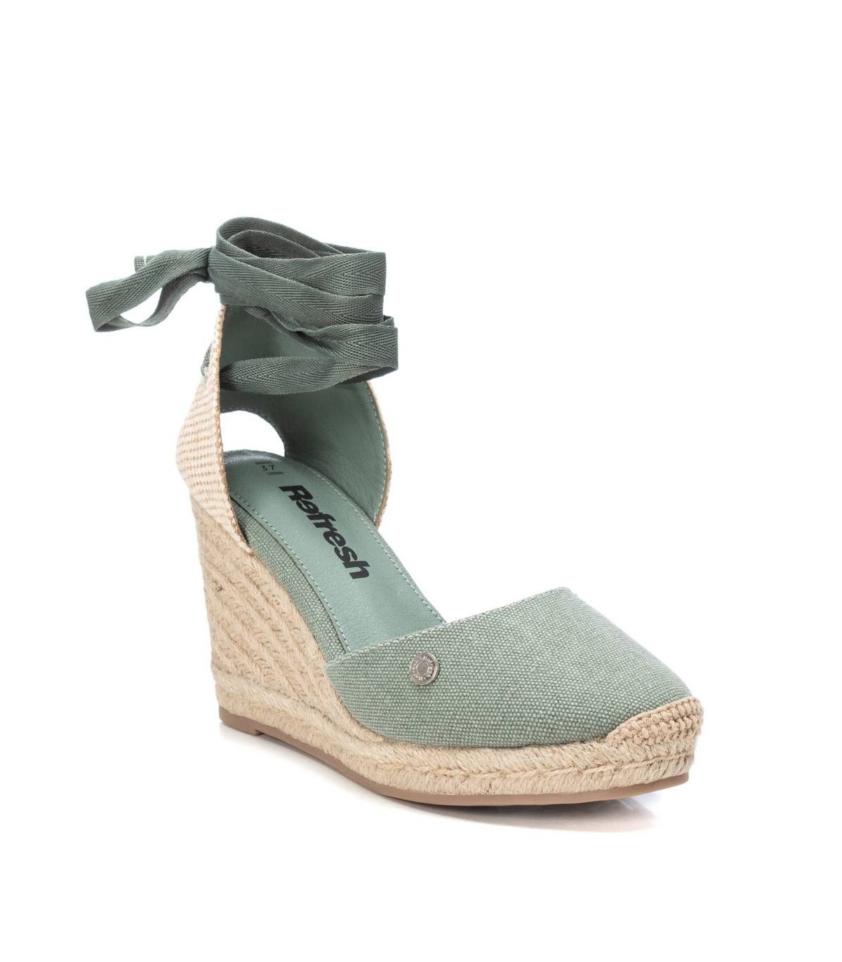 Alpargata de mujer tipo valenciana, de la marca Refresh. Fabricada en material textil. Un modelo ideal para tus looks veraniegos por sus cintas atadas al tobillo. Puntera reforzada. Cuña de 9 cm con plataforma delantera de yute y suela de goma antideslizante. Este modelo ha obtenido el certificado vegano por la organización mundial PETA (Organización de los derechos de los animales).