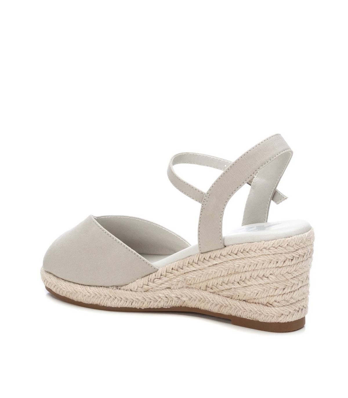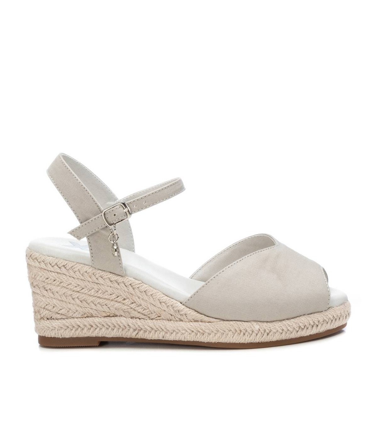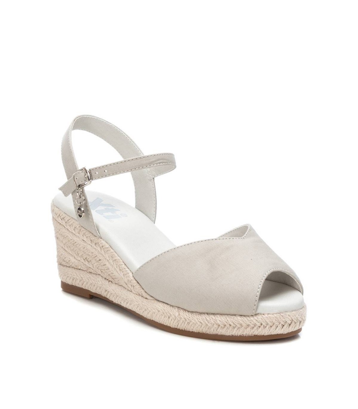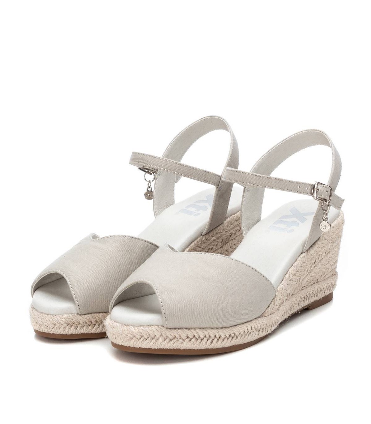 Sandalia de mujer con cuña, tipo valenciana, de la marca Xti. Fabricado en textil, se convertirá en el centro de tus looks de verano. Cierre de tira al tobillo con hebilla. Cuña de yute de 8 cm con plataforma delantera y suela de goma antideslizante. Este modelo ha obtenido el certificado vegano por la organización mundial PETA (Organización de los derechos de los animales).