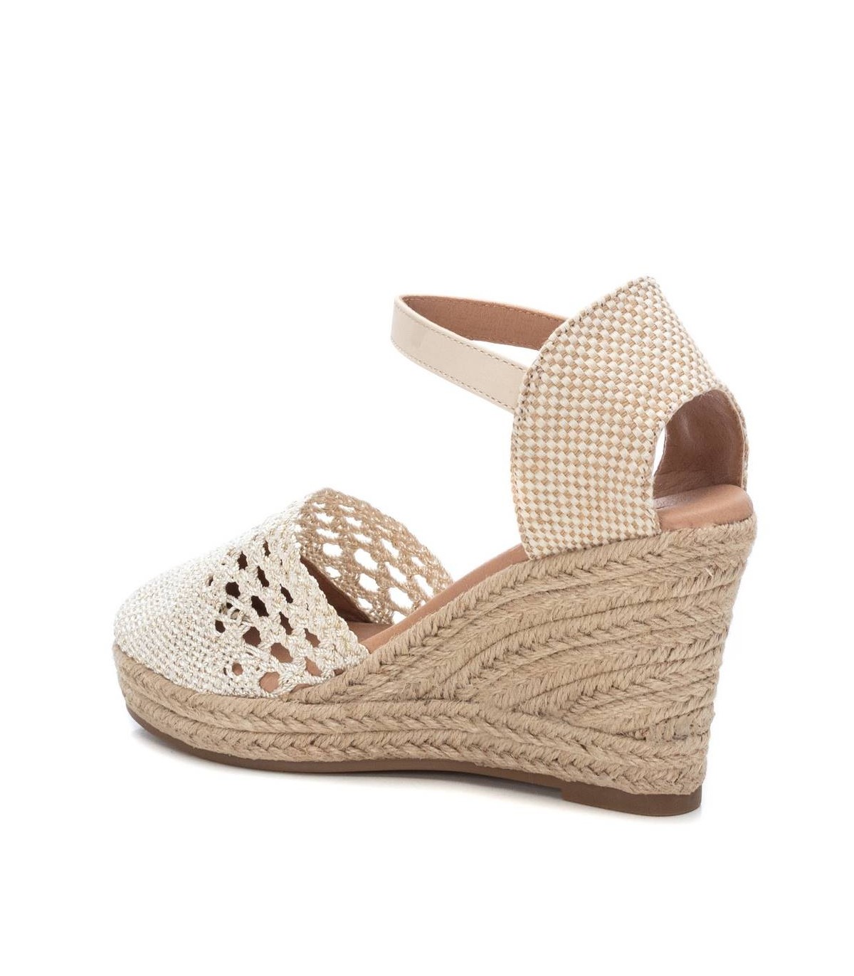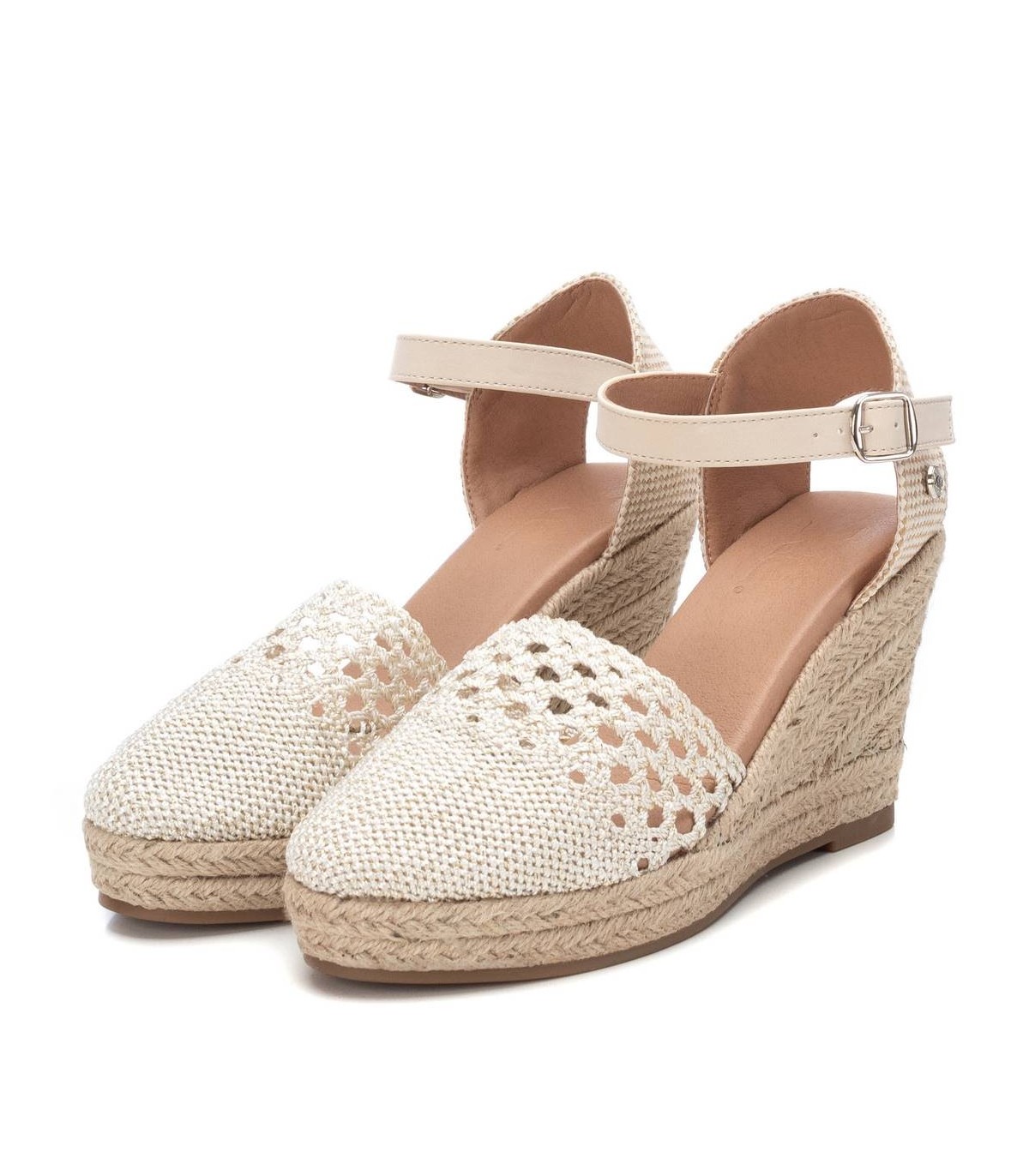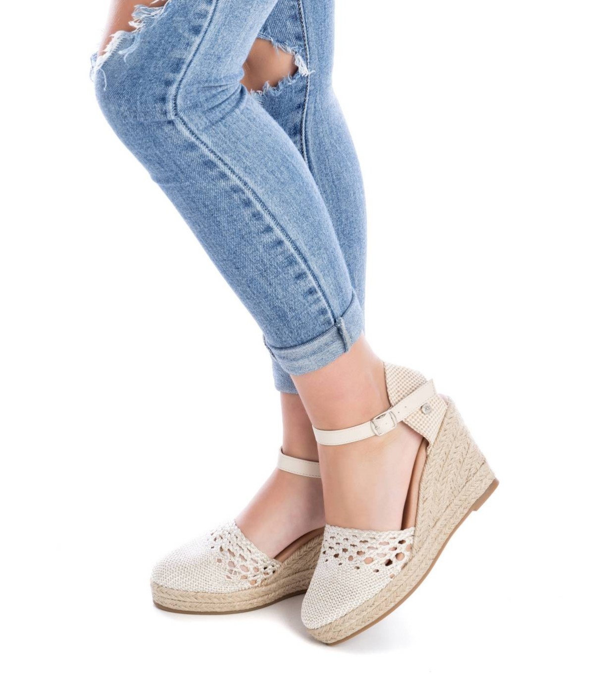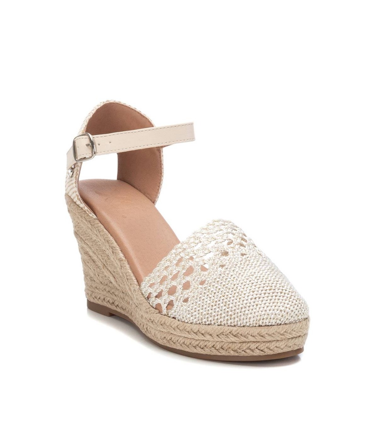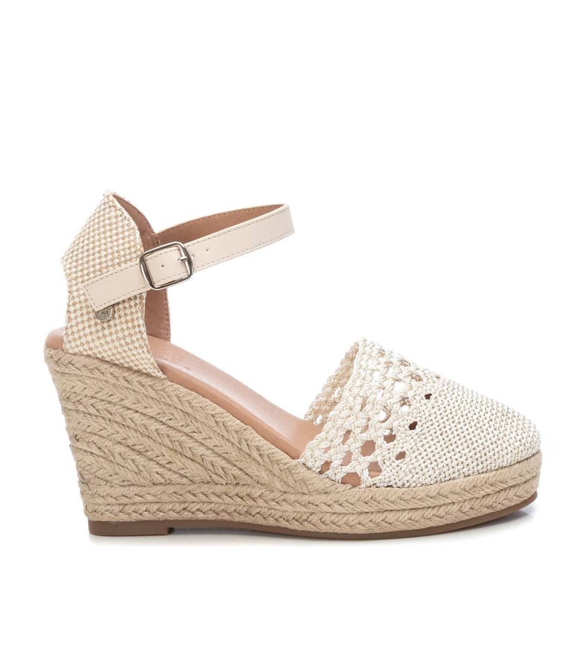 Zapato de mujer con cuña, tipo valenciana, de la marca Xti. Fabricado en tejido de ganchillo, este modelo te acompañará en todos tus looks del verano. Pulsera al tobillo con cierre de hebilla. Cuña de 10cm forrada en yute y suela de goma antideslizante. Este modelo ha obtenido el certificado vegano por la organización mundial PETA (Organización de los derechos de los animales).