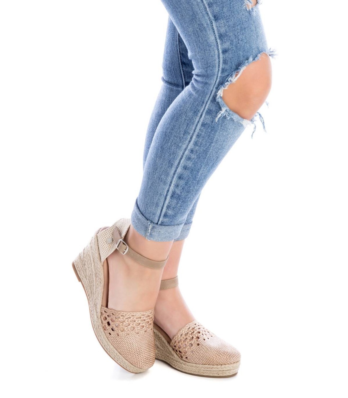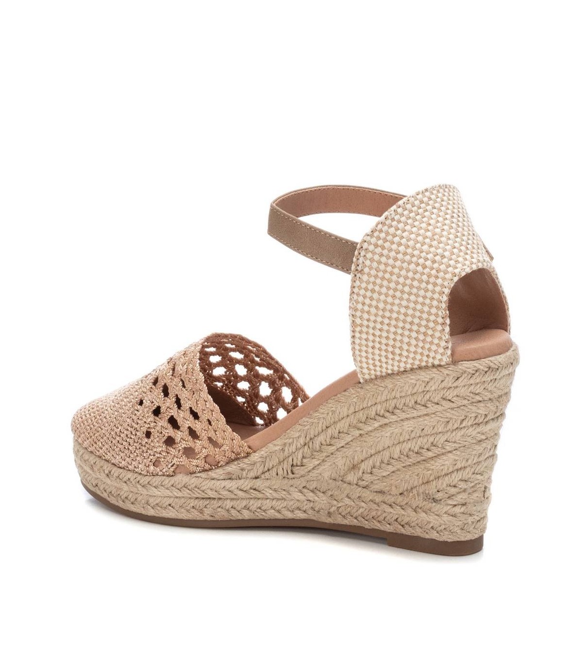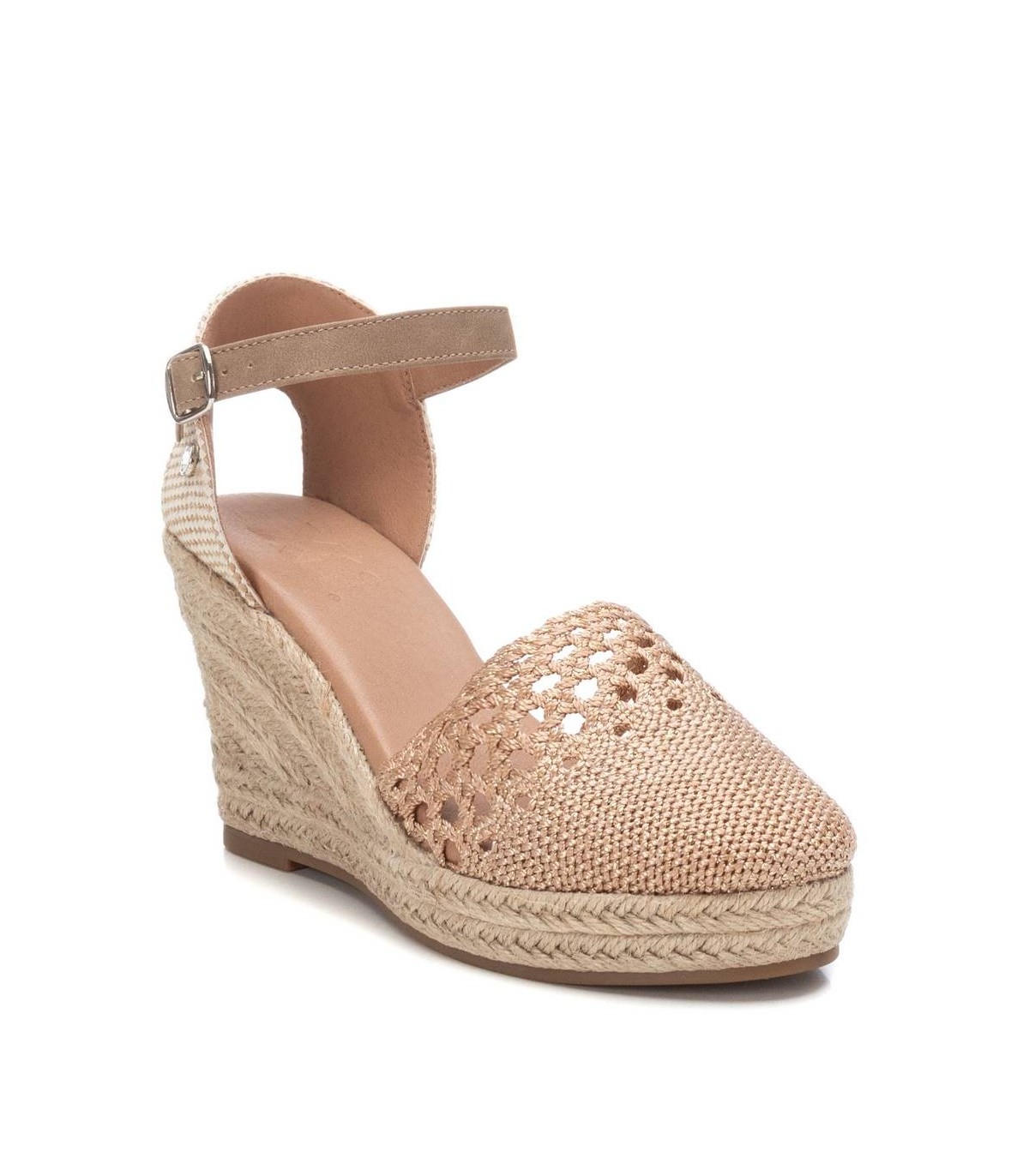 Zapato de mujer con cuña, tipo valenciana, de la marca Xti. Fabricado en tejido de ganchillo, este modelo te acompañará en todos tus looks del verano. Pulsera al tobillo con cierre de hebilla. Cuña de 10cm forrada en yute y suela de goma antideslizante. Este modelo ha obtenido el certificado vegano por la organización mundial PETA (Organización de los derechos de los animales).