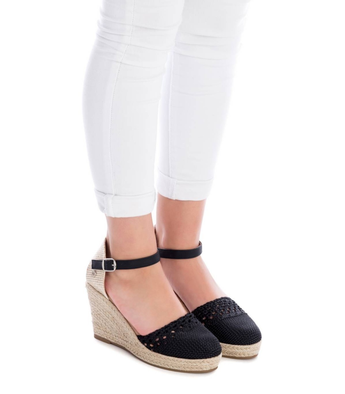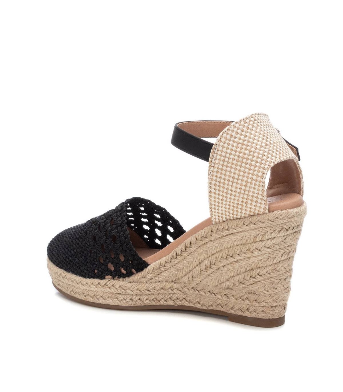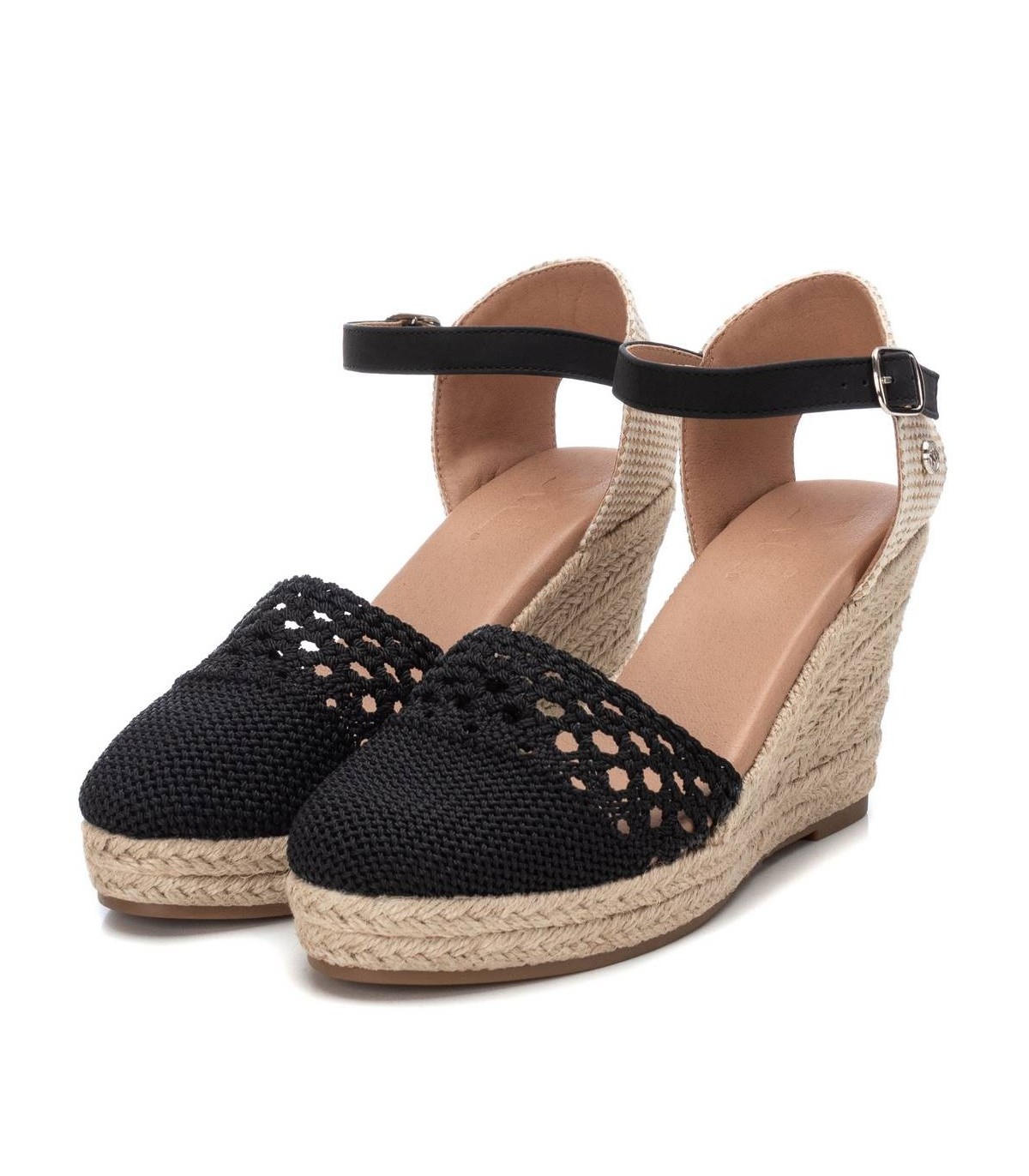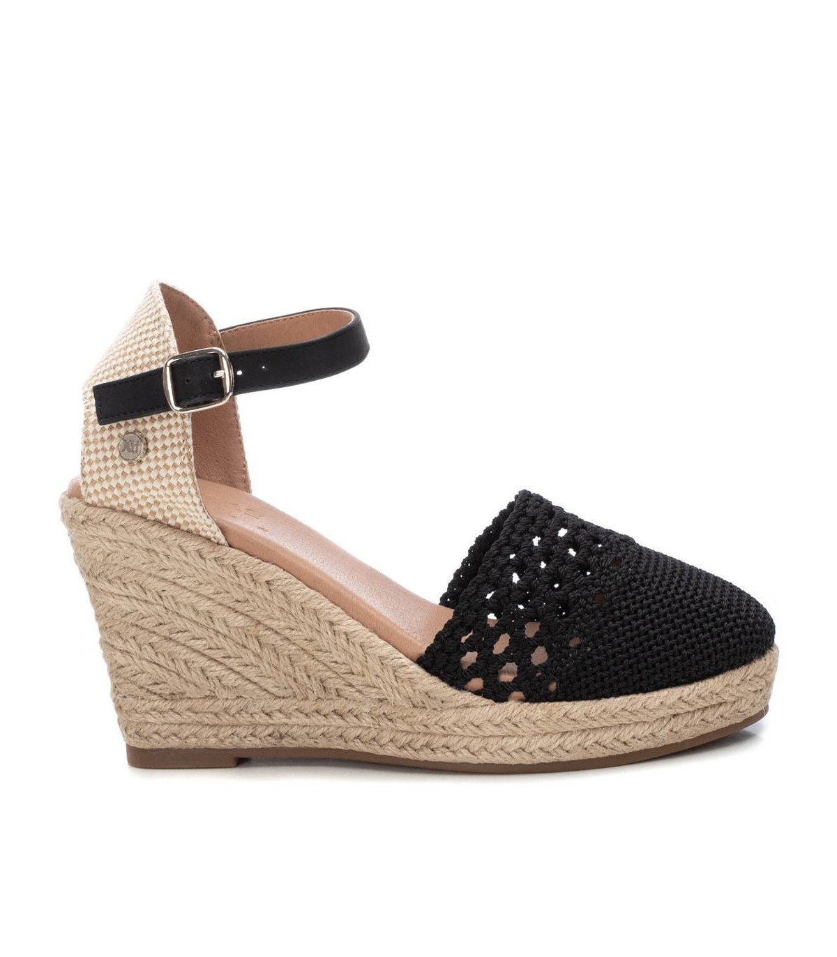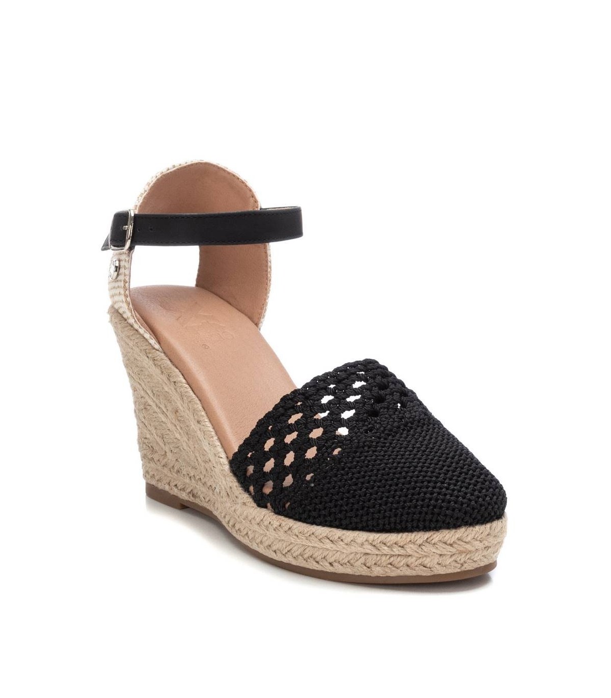 Zapato de mujer con cuña, tipo valenciana, de la marca Xti. Fabricado en tejido de ganchillo, este modelo te acompañará en todos tus looks del verano. Pulsera al tobillo con cierre de hebilla. Cuña de 10cm forrada en yute y suela de goma antideslizante. Este modelo ha obtenido el certificado vegano por la organización mundial PETA (Organización de los derechos de los animales).