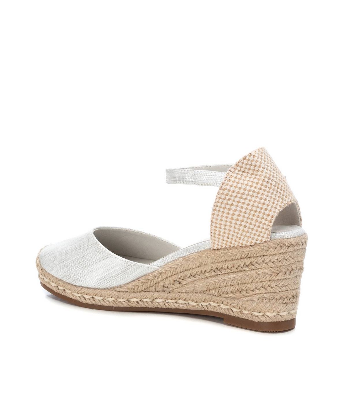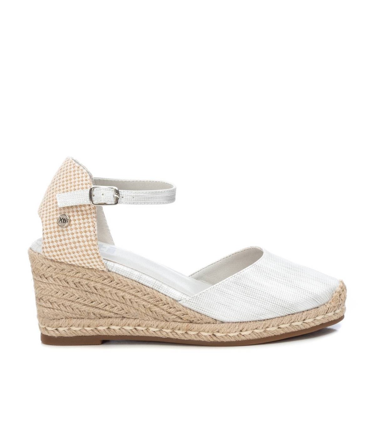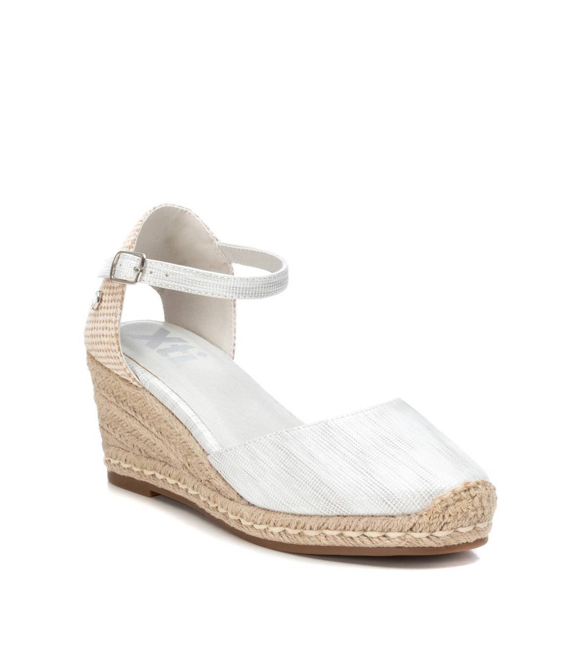 Alpargata de mujer tipo valenciana, de la marca Xti. Fabricada en material que imita la piel con grabado y un ligero brillo, combinado con una trasera de textil para mayor comodidad. Cierre con hebilla metálica. Cuña de 7cm de yute y suela de goma antideslizante. Este modelo ha obtenido el certificado vegano por la organización mundial PETA (Organización de los derechos de los animales).