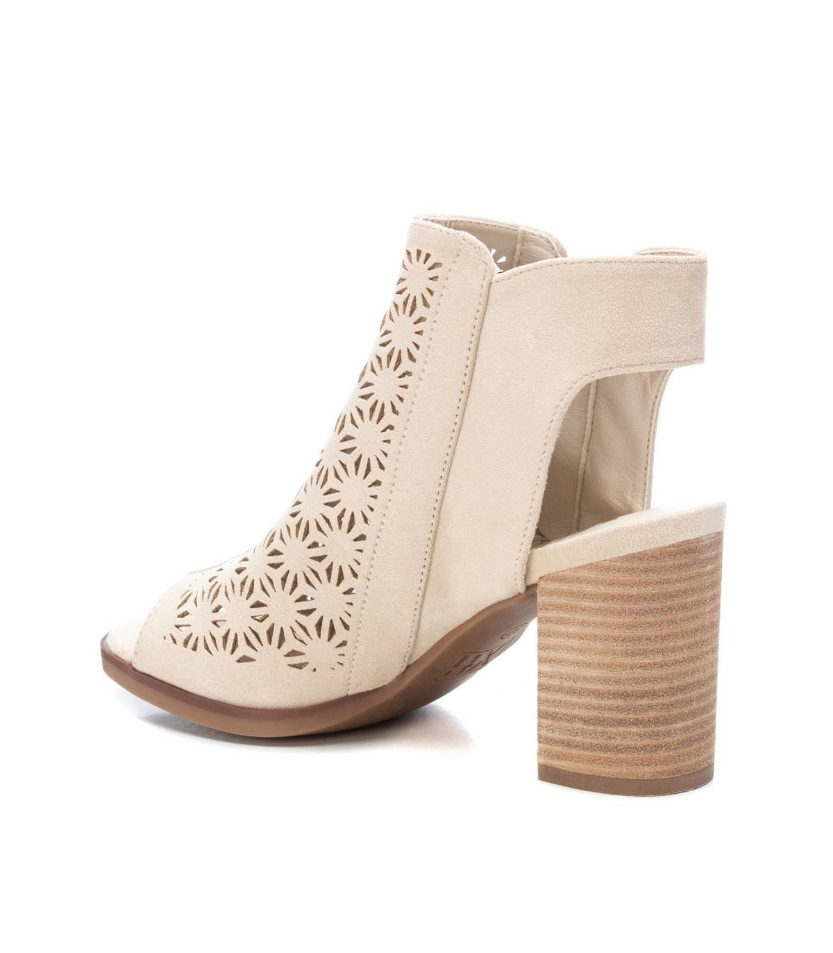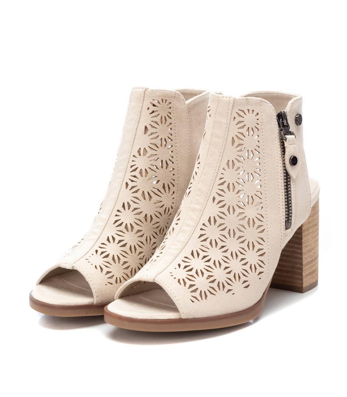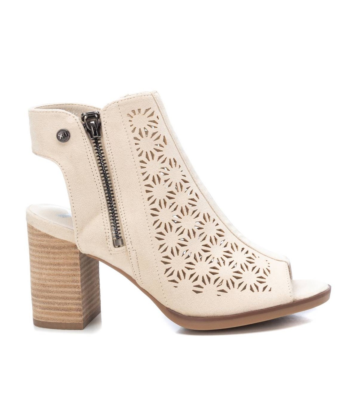 Sandalia abotinada de mujer, de la marca Xti. Fabricada en antelina, con un precioso motivo troquelado que te ayudará a dar un toque a tus looks de esta temporada. Cierre al tobillo con hebilla. Tacón ancho de 9 cm con suela de goma antideslizante. Este modelo ha obtenido el certificado vegano por la organización mundial PETA (Organización de los derechos de los animales).