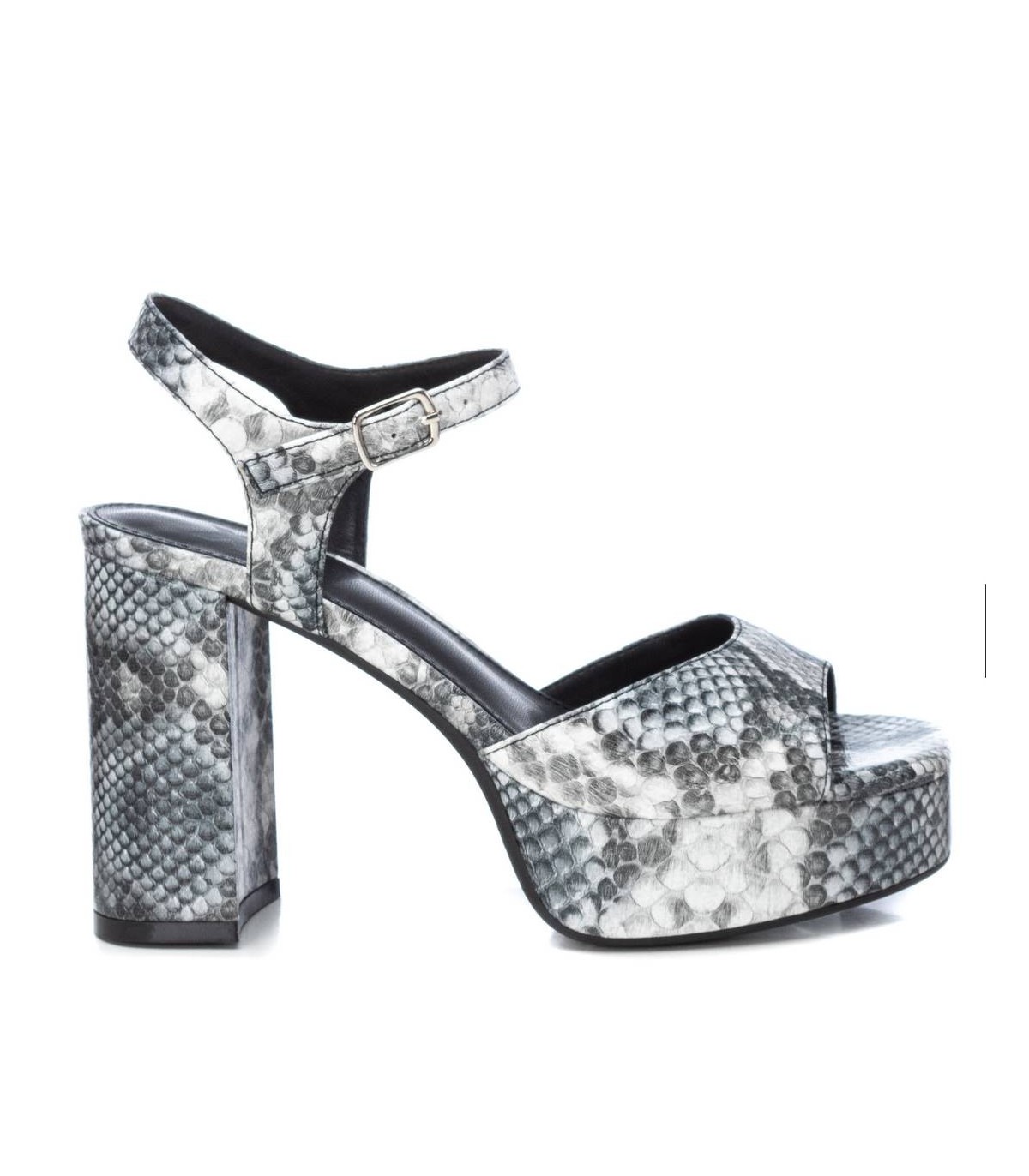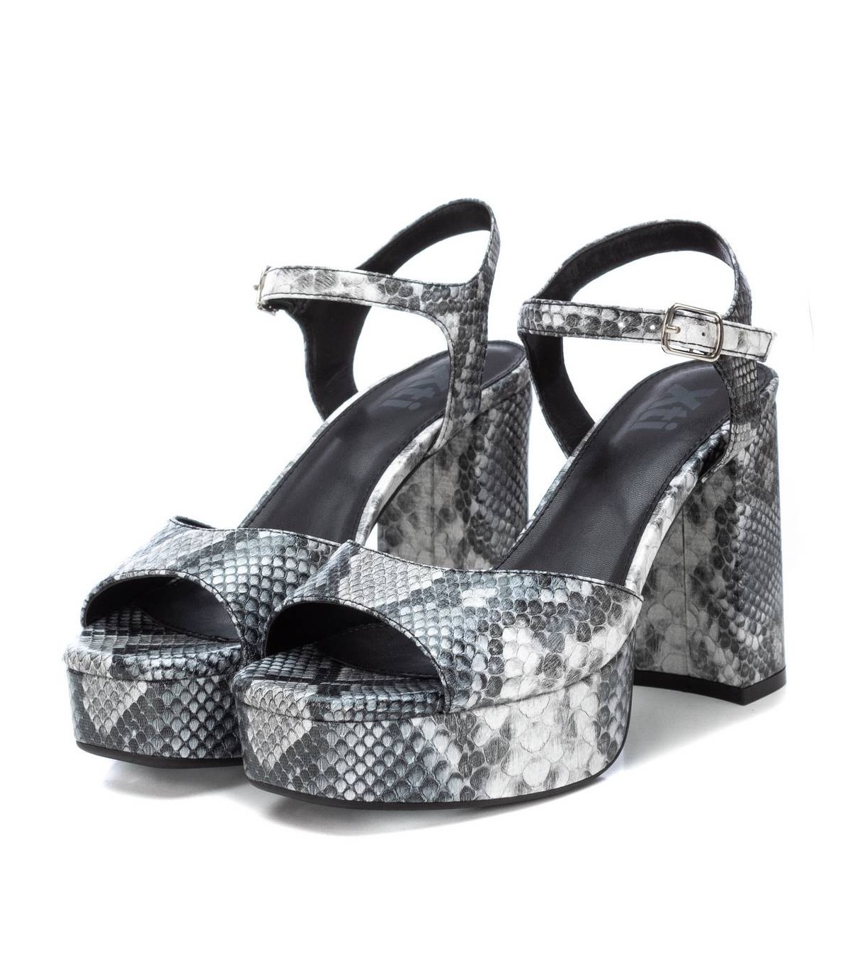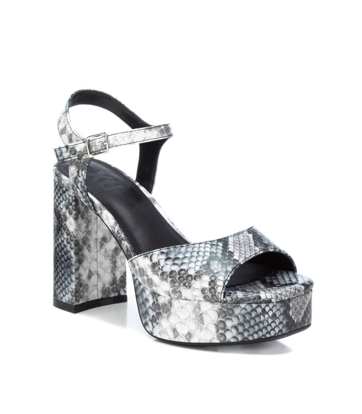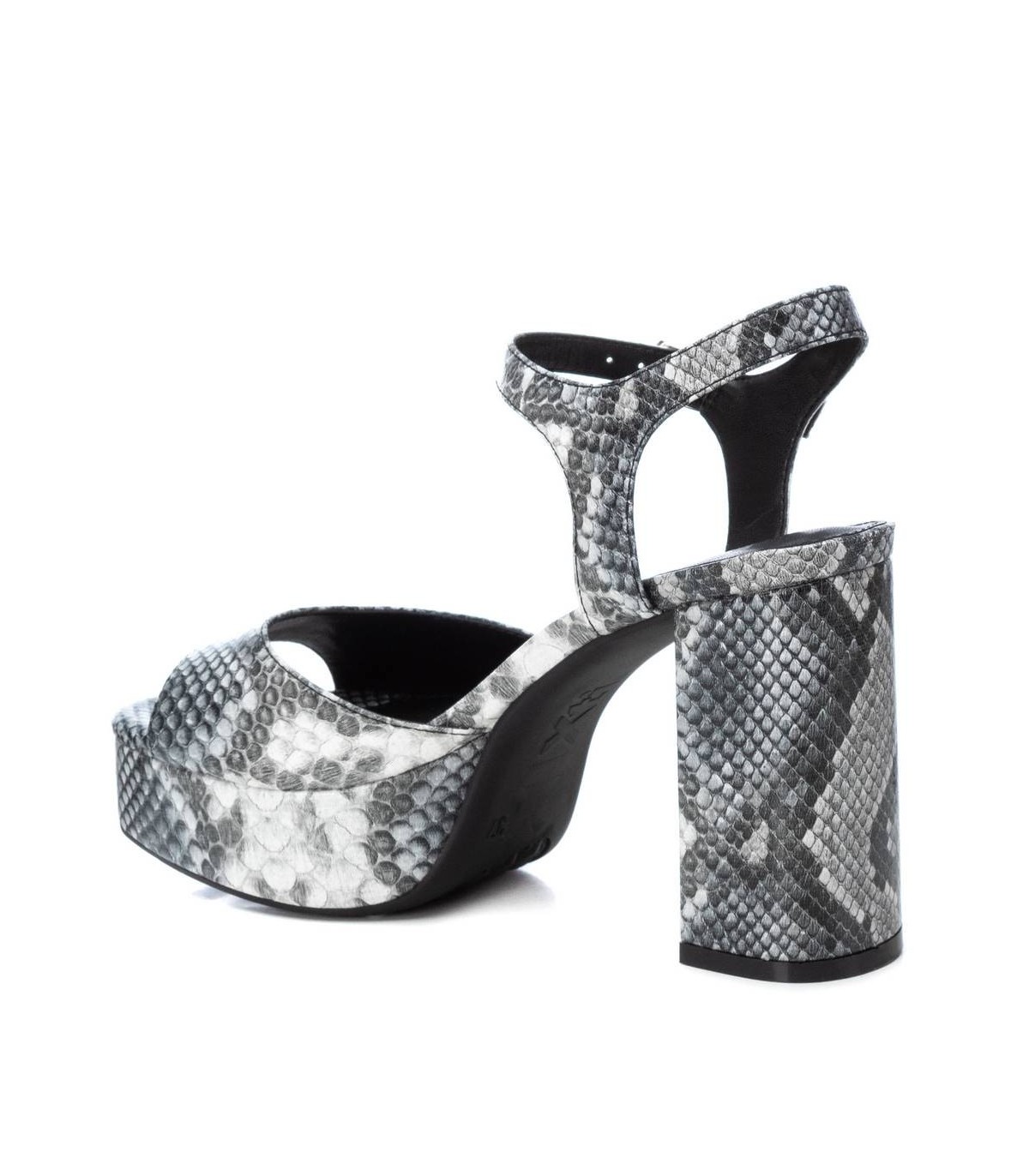 Sandalia de tacón de mujer, de la marca Xti. Fabricada en material que imita la piel, con grabado animal tipo serpiente. Cierre mediante hebilla. Tacón ancho de 11 cm con plataforma delantera y suela de goma antideslizante. Este modelo ha obtenido el certificado vegano por la organización mundial PETA (Organización de los derechos de los animales).