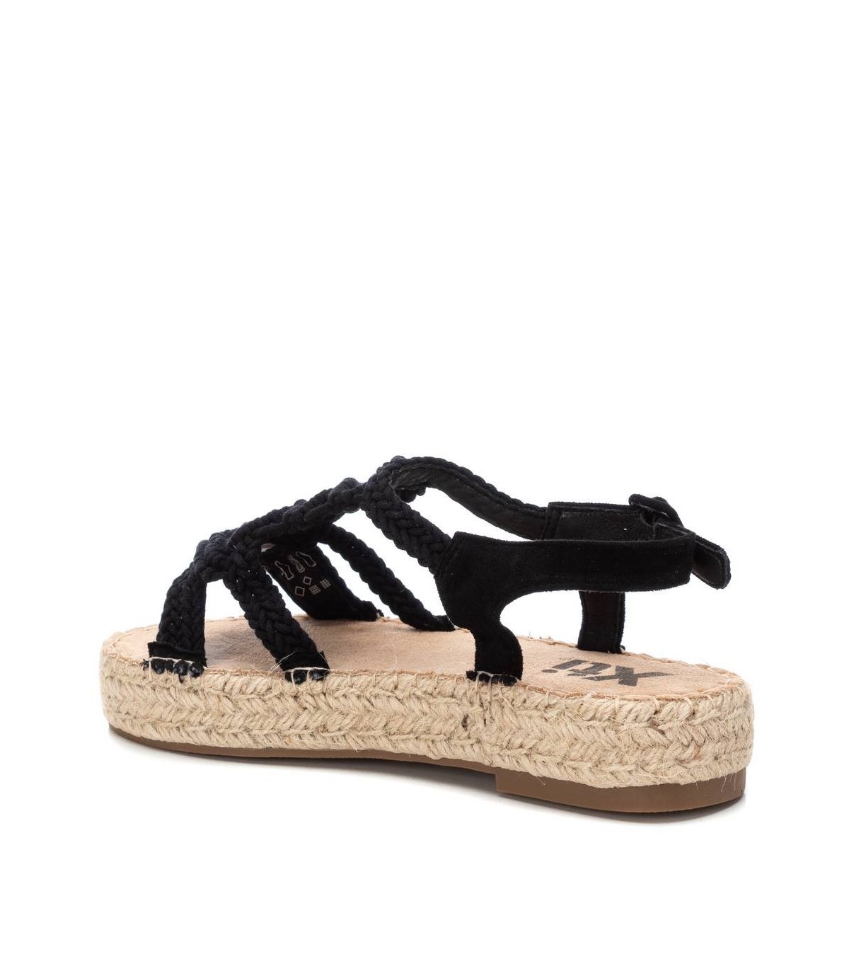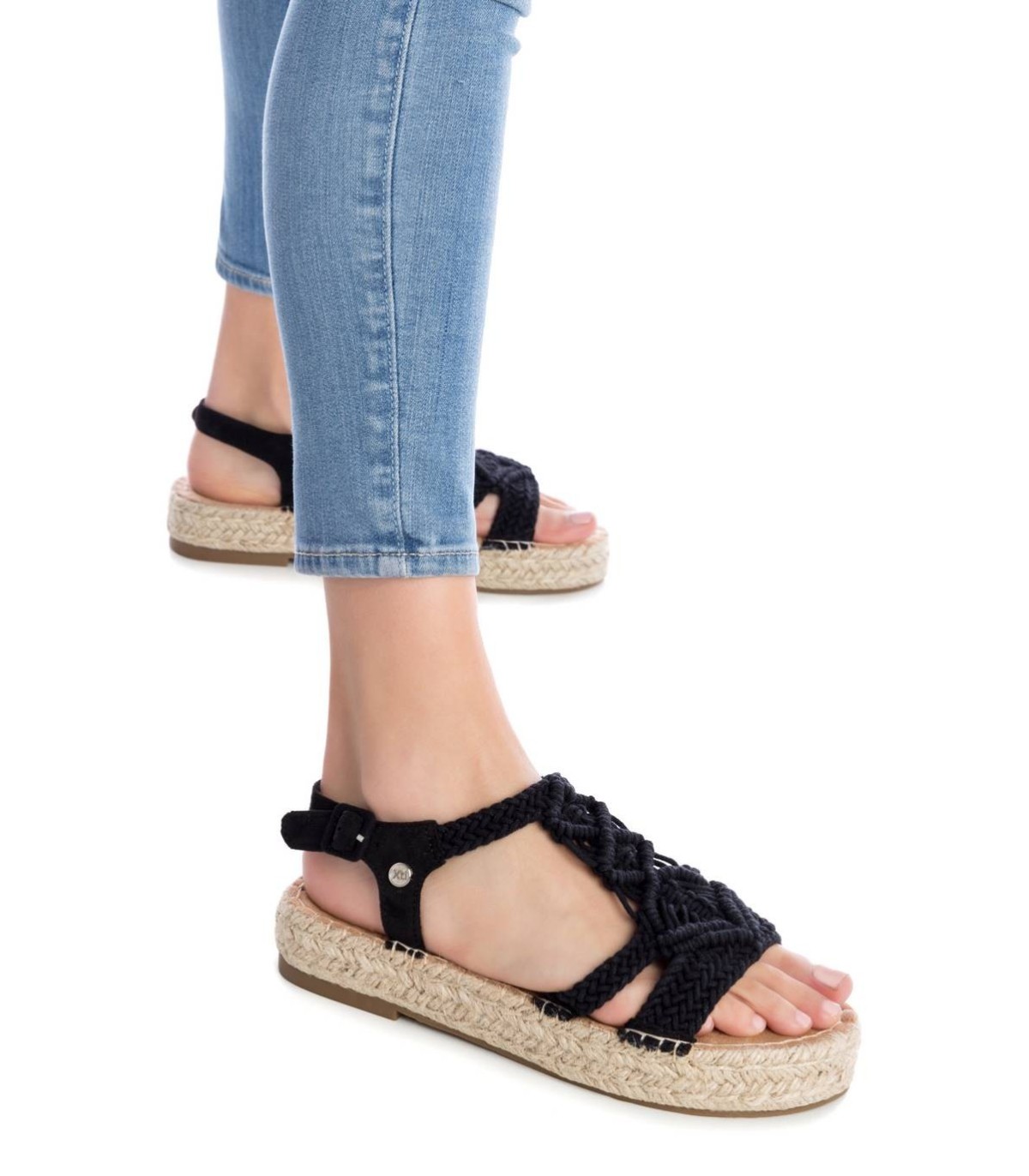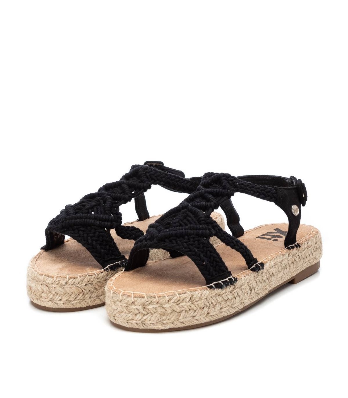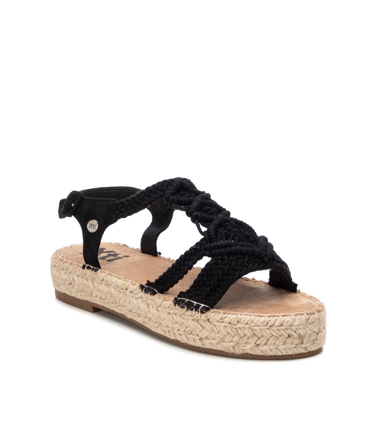 Sandalia de mujer, de la marca Xti. Fabricada en tejido estilo macramé. Pulsera trasera de material que imita la piel con hebilla en el lateral para sujetar al tobillo. Plataforma de yute con suela de goma antideslizante. Este modelo ha obtenido el certificado vegano por la organización mundial PETA (Organización de los derechos de los animales).