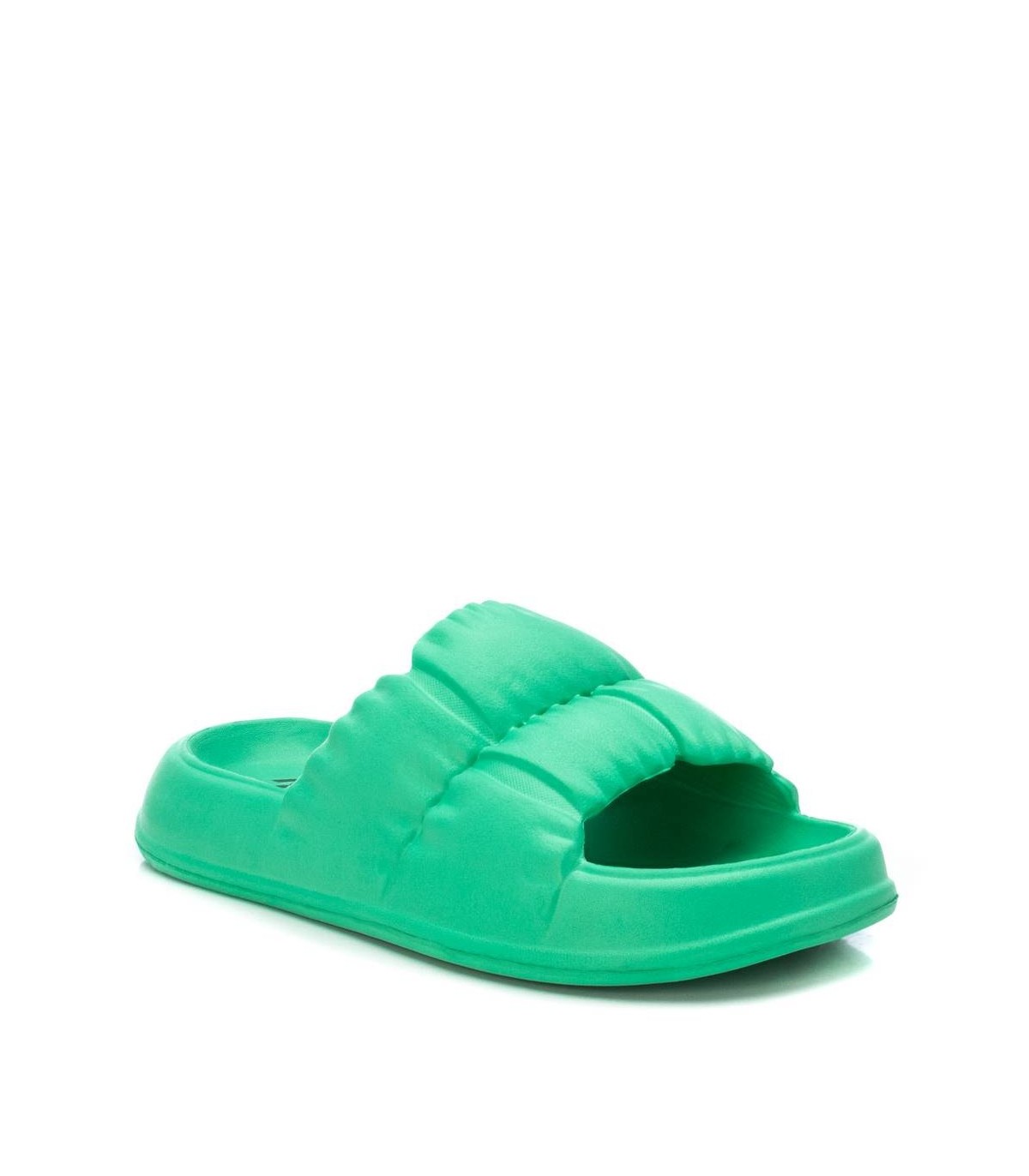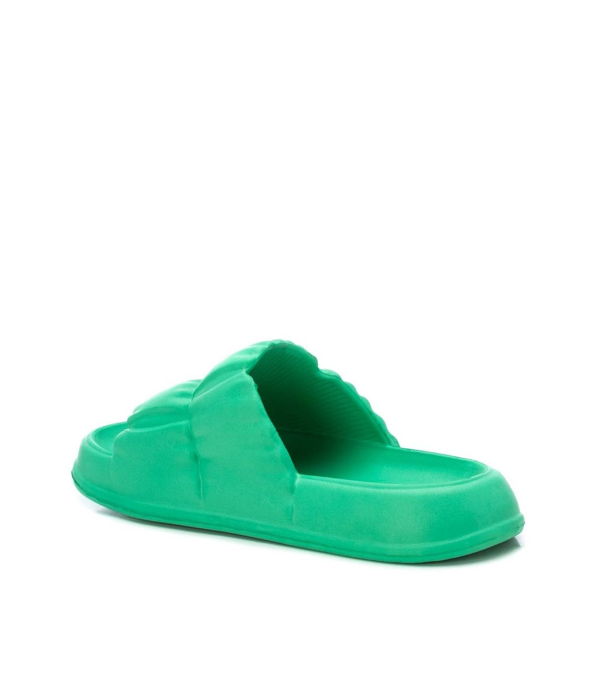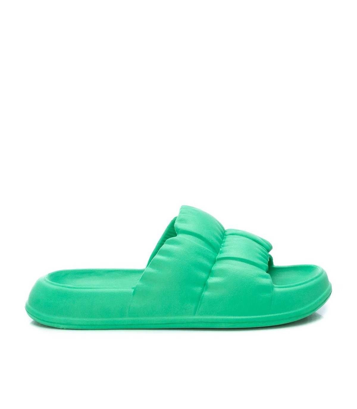 Chancla de mujer, de la marca Xti. Fabricada en caucho con diseño acolchado. Suela gruesa antideslizante. Ideal para el verano. Este modelo ha obtenido el certificado vegano por la organización mundial PETA (Organización de los derechos de los animales).