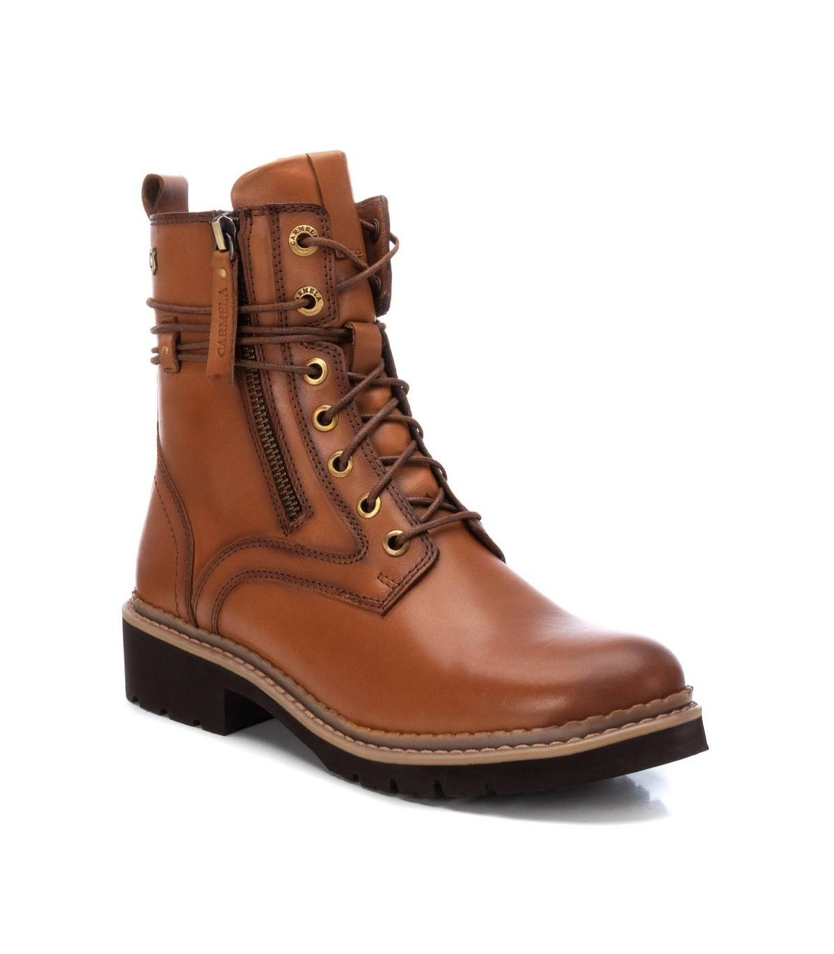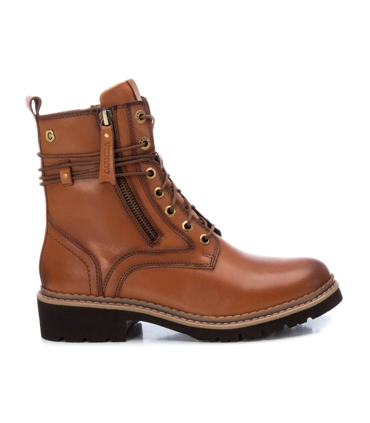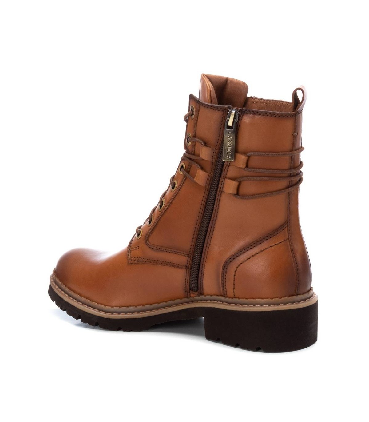 Botín de mujer, de la marca Carmela. Fabricado en piel de alta calidad. Cierre mediante cremallera lateral y cordones para un buen ajuste. Tirador trasero para facilitar la puesta. Cremallera decorativa en el lateral exterior. Suela de goma antideslizante.