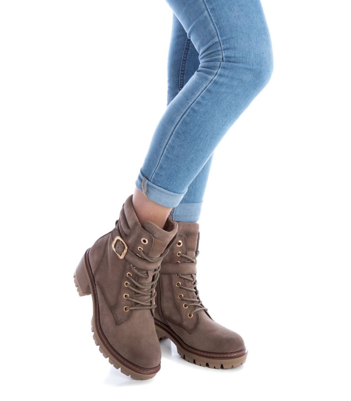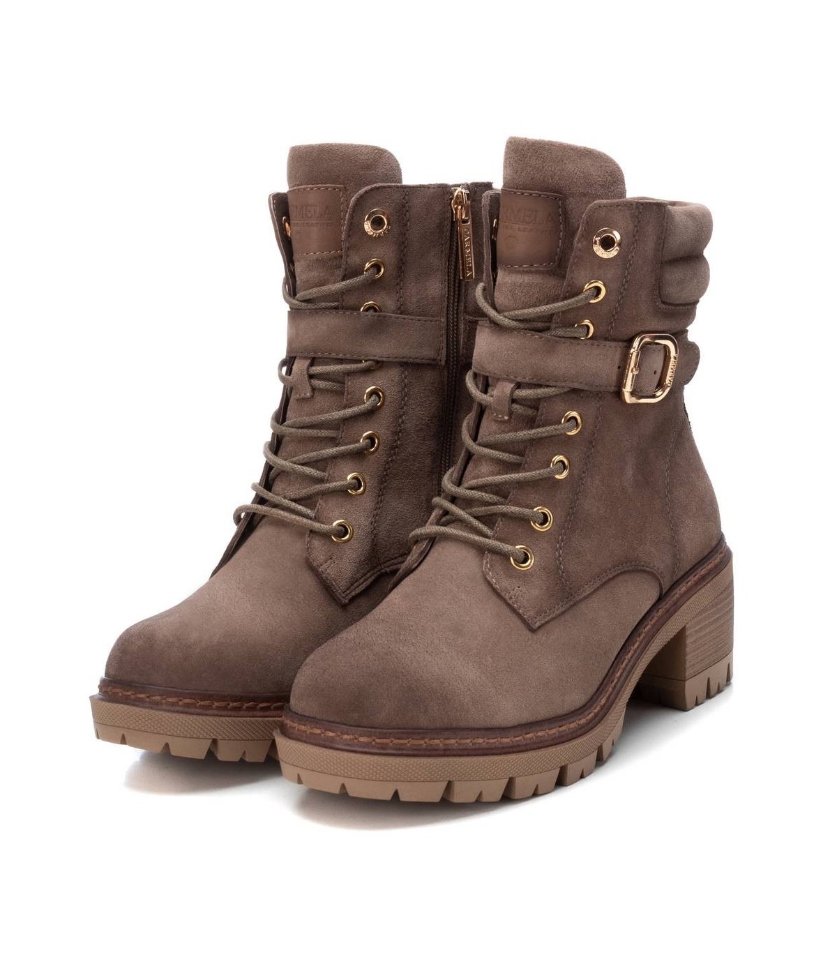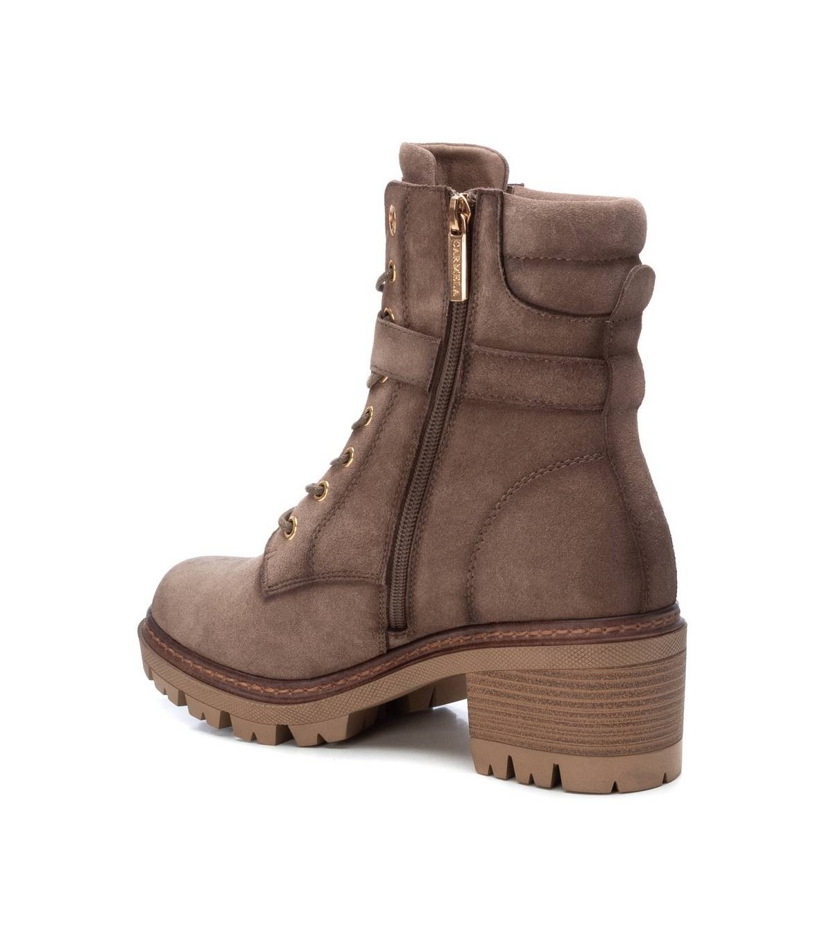 Botín de mujer, de la marca Carmela. Fabricado en serraje de alta calidad. Cierre mediante cremallera lateral y cordones ajustables. Correa con hebilla decorativa. Collarín acolchado que da un toque montañero junto al piso track con tacón de 6 cm. Suela antideslizante.