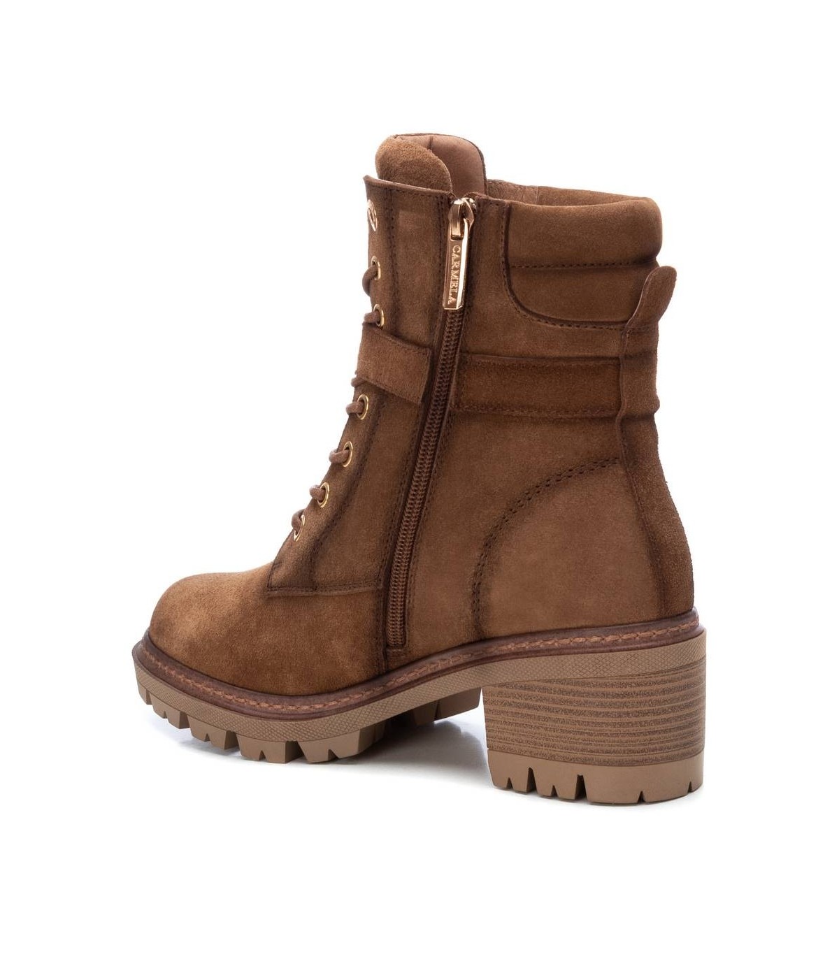Botín de mujer, de la marca Carmela. Fabricado en serraje de alta calidad. Cierre mediante cremallera lateral y cordones ajustables. Correa con hebilla decorativa. Collarín acolchado que da un toque montañero junto al piso track con tacón de 6 cm. Suela antideslizante.