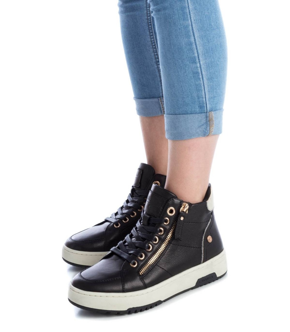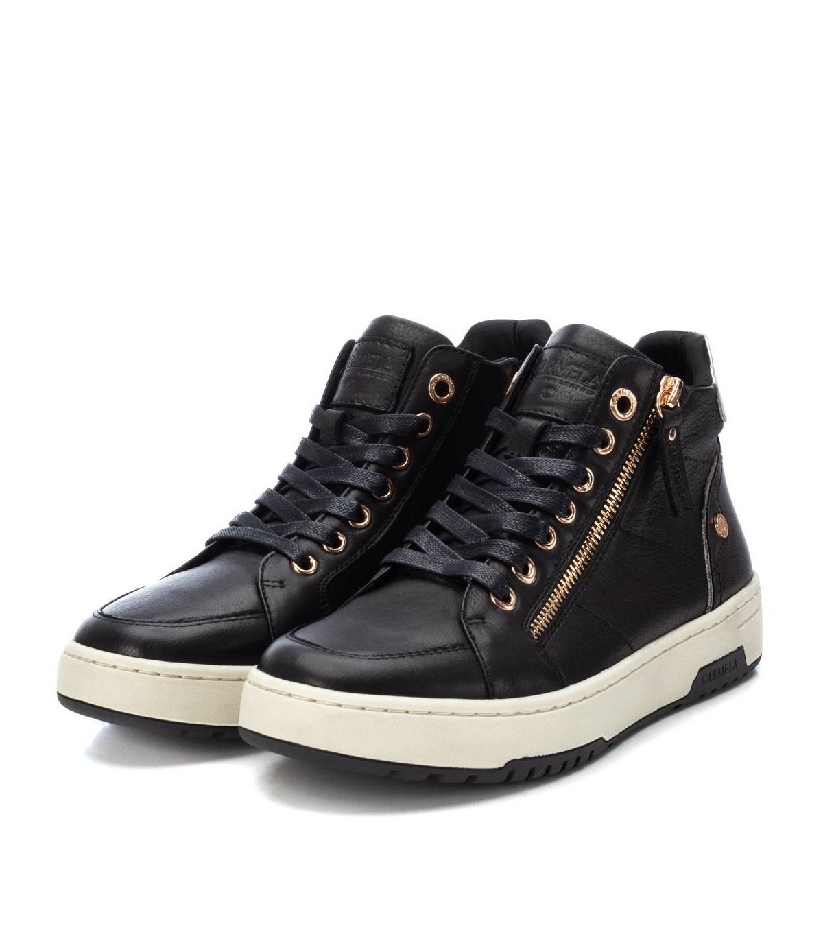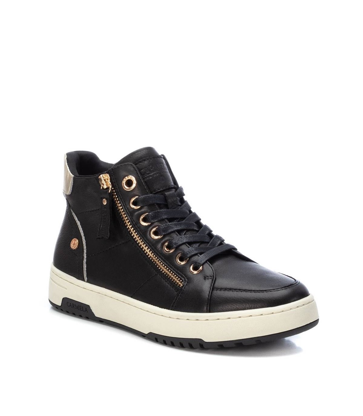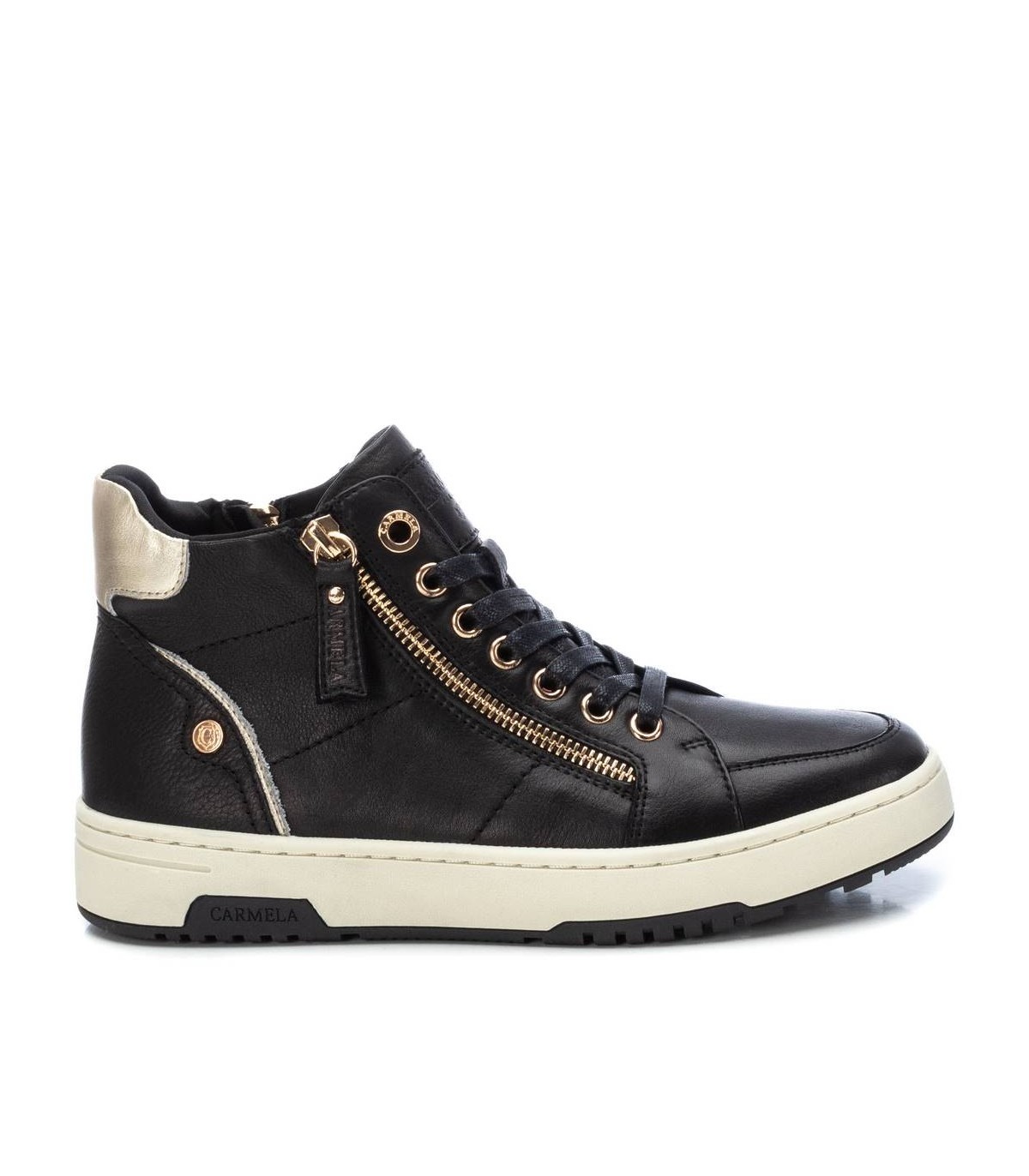 Botín deportivo de mujer, de la marca Carmela. Fabricado en piel de alta calidad. Cierre mediante cremallera lateral y cordones ajustables. Cremallera decorativa en el lateral exterior. Suela de goma antideslizante.