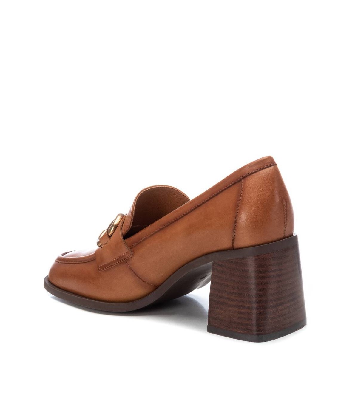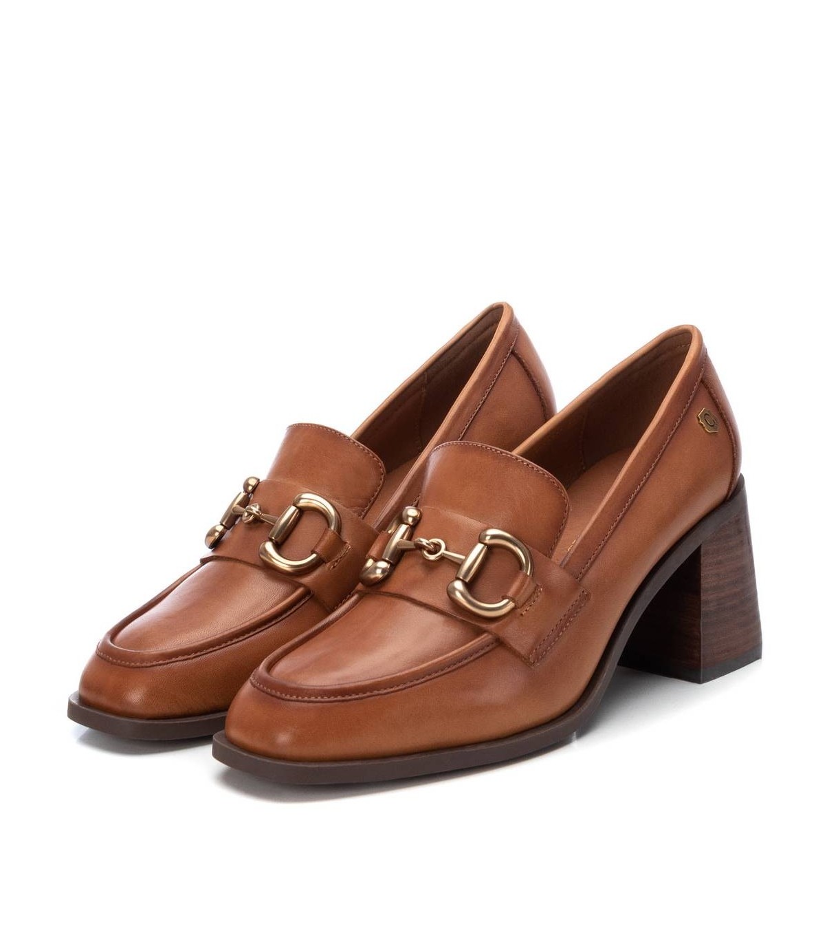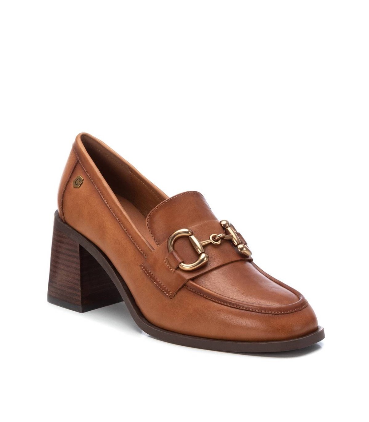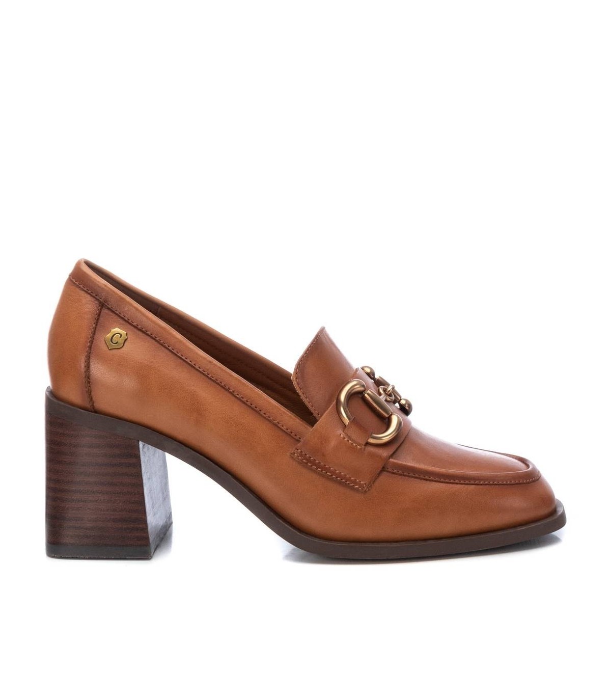 Mocasín de mujer, de la marca Carmela. Fabricado en piel de alta calidad. Detalle metálico en el frente. Tacón ancho de 7 cm y suela antideslizante.