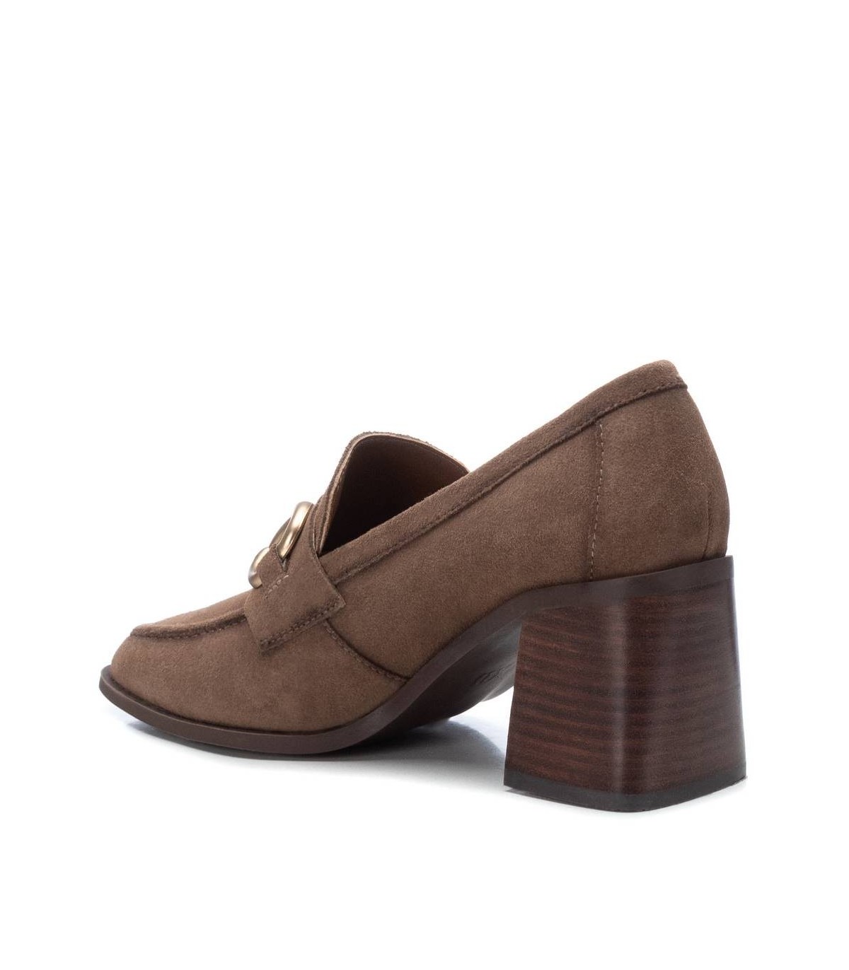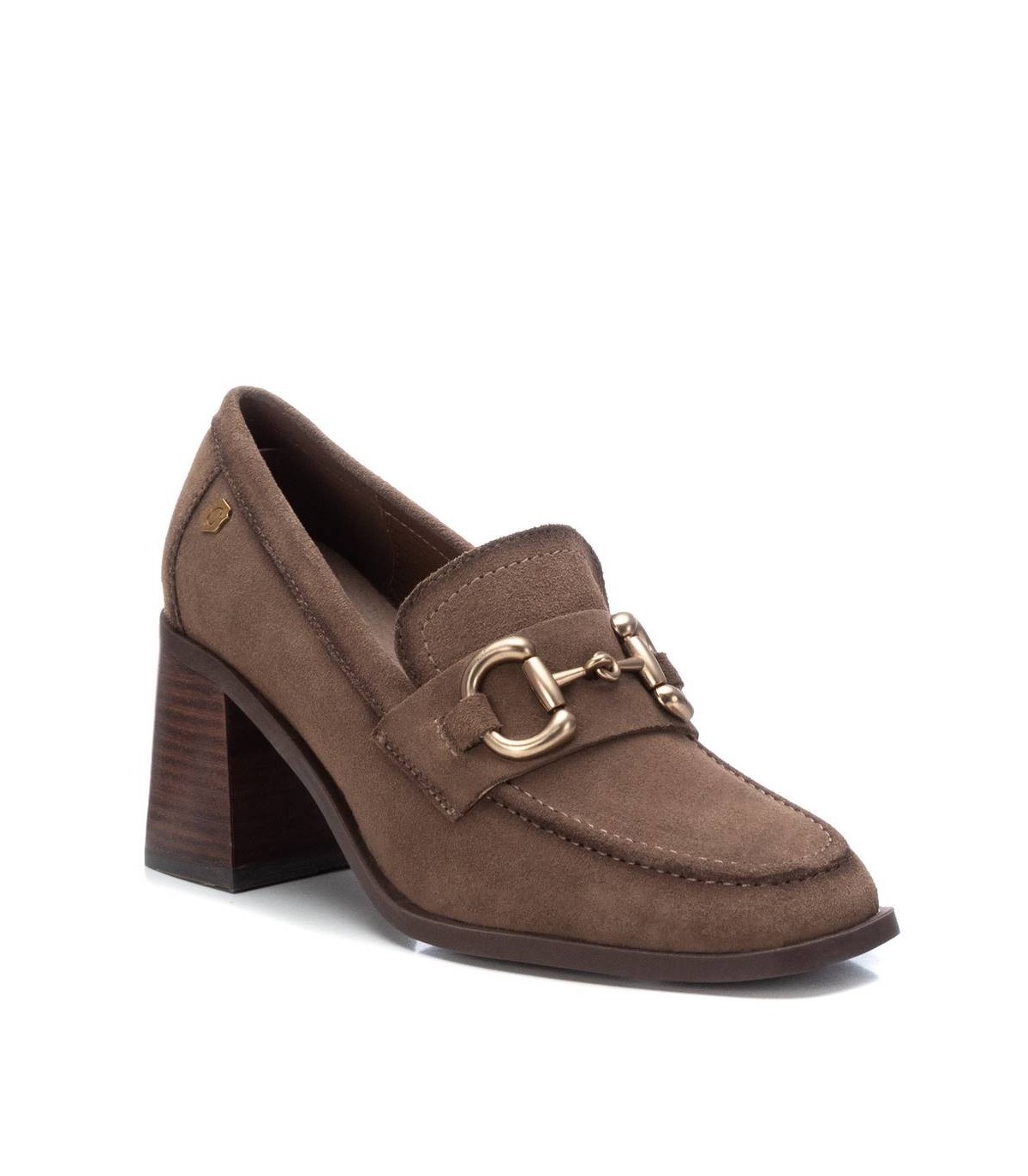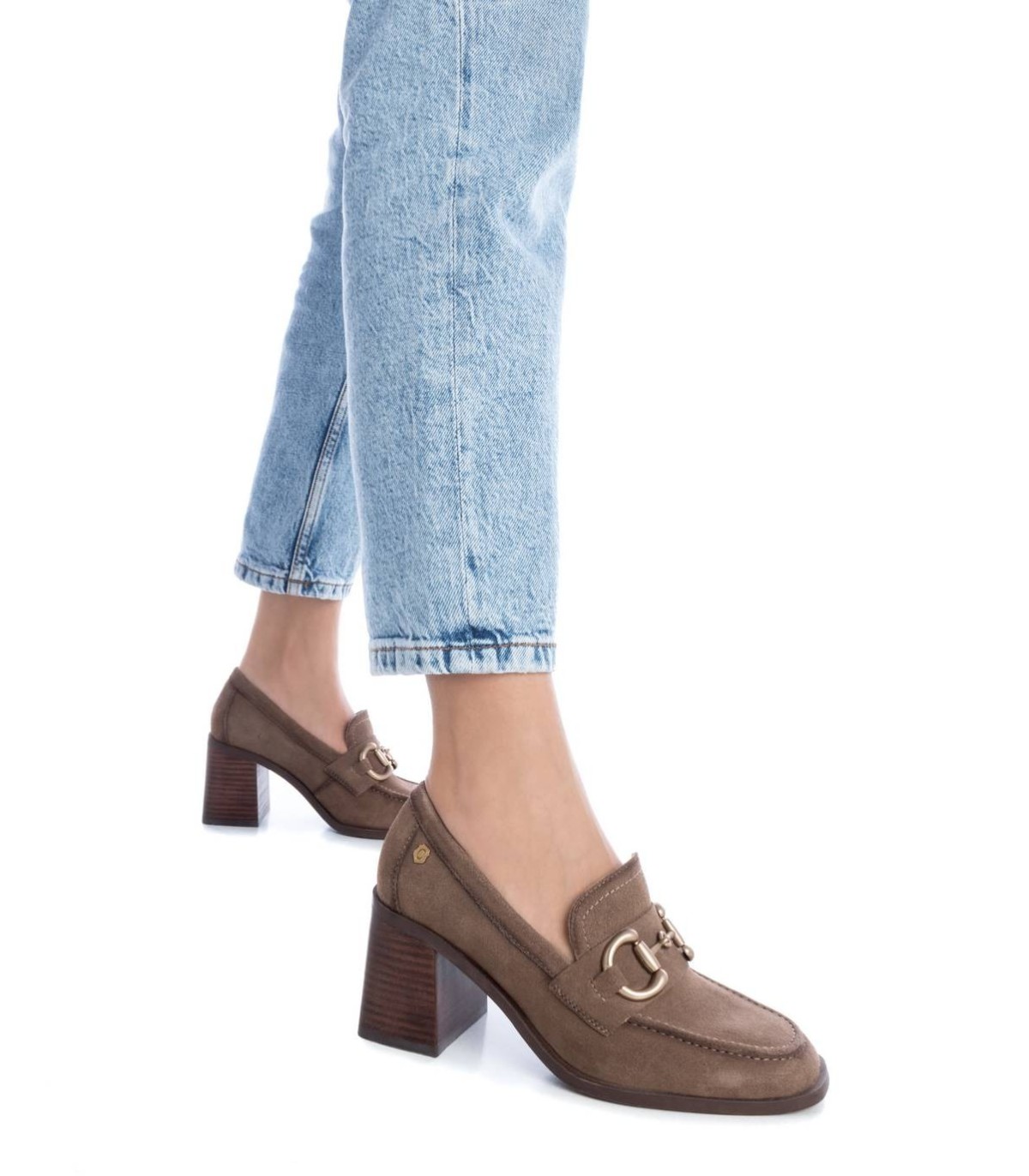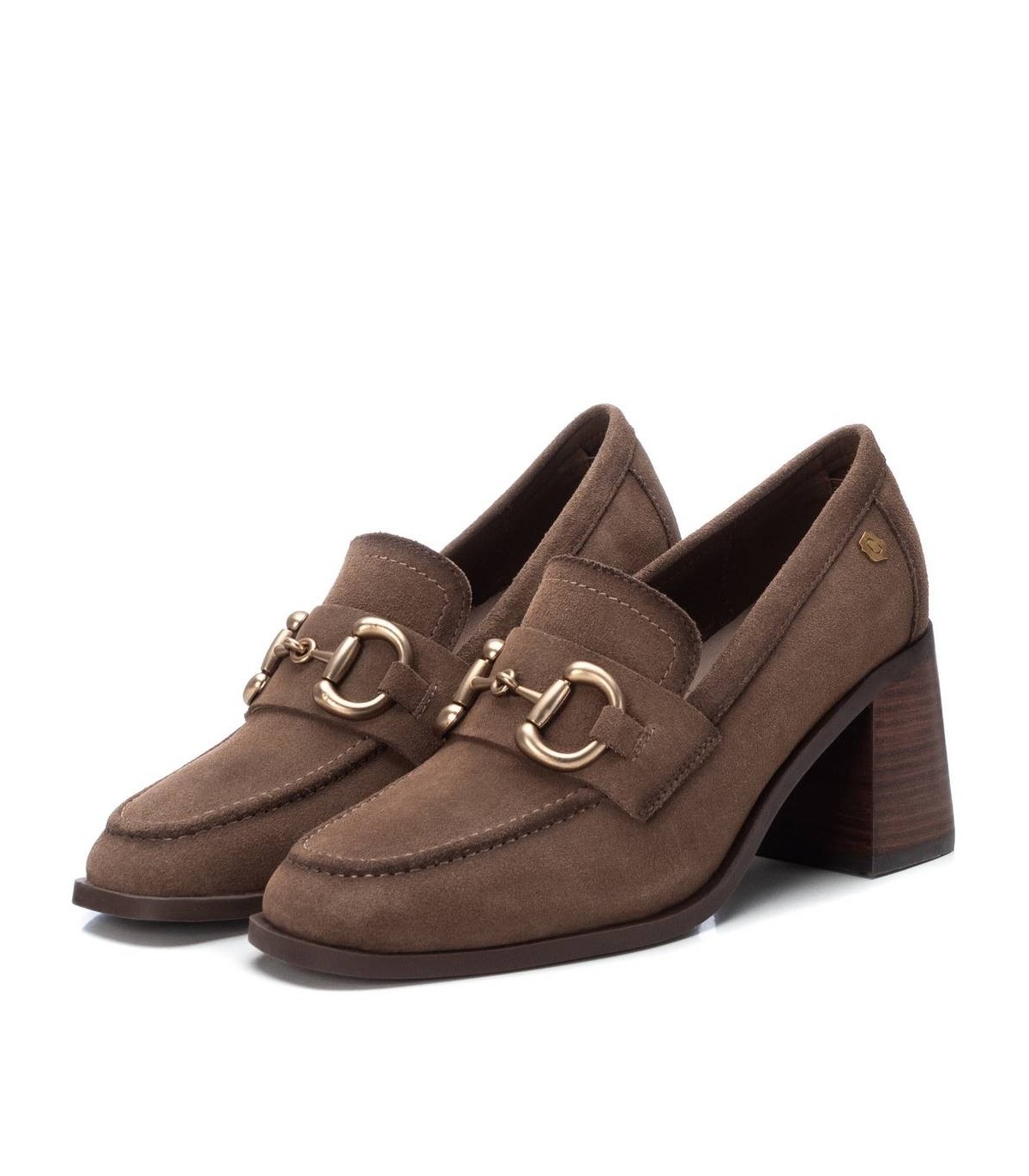 Mocasín de mujer, de la marca Carmela. Fabricado en serraje de alta calidad. Antifaz decorativo en el frente con detalle metálico. Tacón ancho de 7 cm y suela antideslizante.