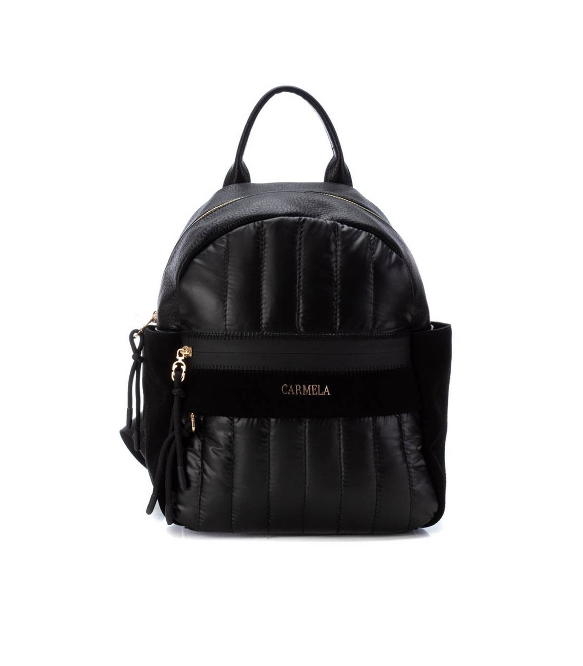 Mochila mediana de mujer, de la marca Carmela. Fabricada en nylon metalizado y serraje. Cierre mediante cremallera en el bolsillo principal y 5 bolsillo más que te permitirán llevar todo lo necesario bien ordenado. Medidas: 31 x 23 x 12 cm.