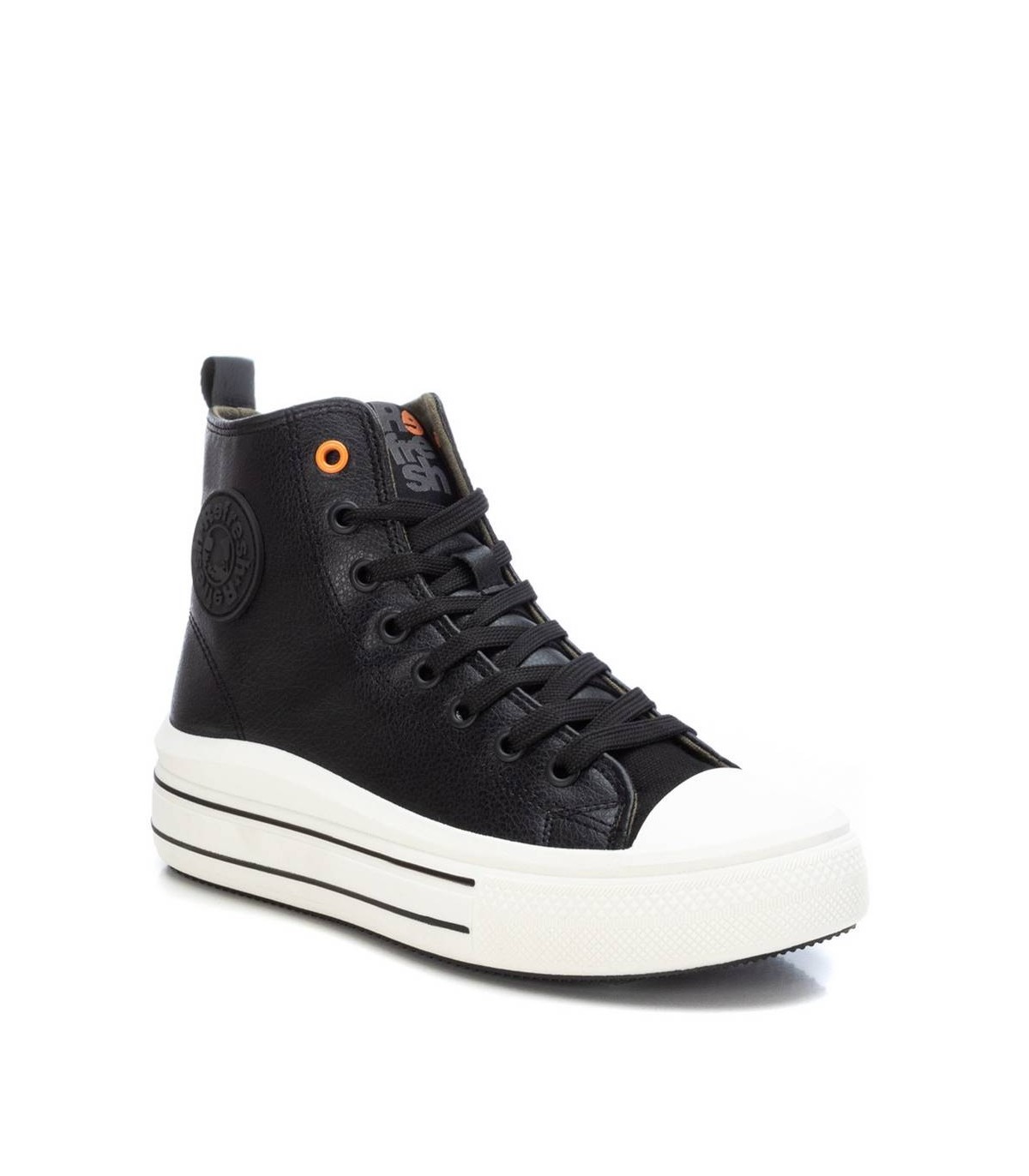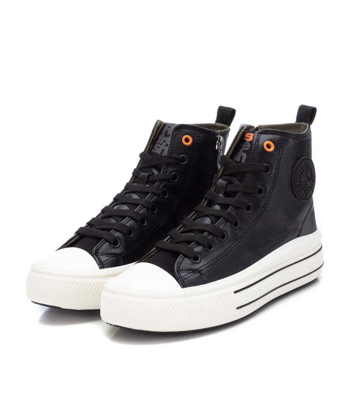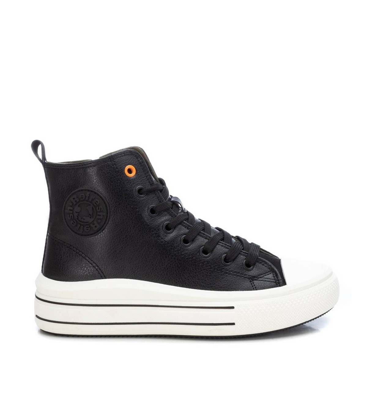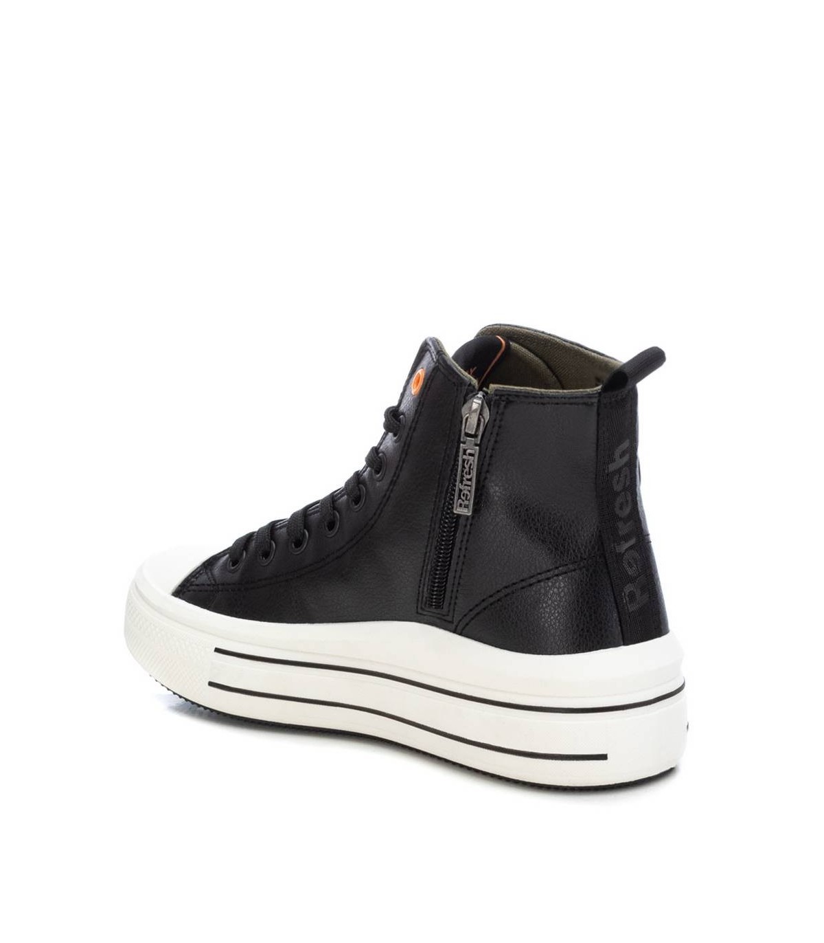 Botín deportivo de mujer, de la marca Refresh. Fabricado en material que imita la piel. Cierre mediante cremallera lateral y cordones ajustables. Tirador trasero para facilitar la puesta. Forro en contraste. Doble piso con suela de goma antideslizante. Este modelo ha obtenido el certificado vegano por la organización mundial PETA (Organización de los derechos de los animales).
