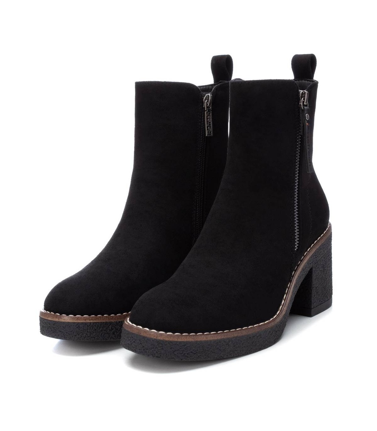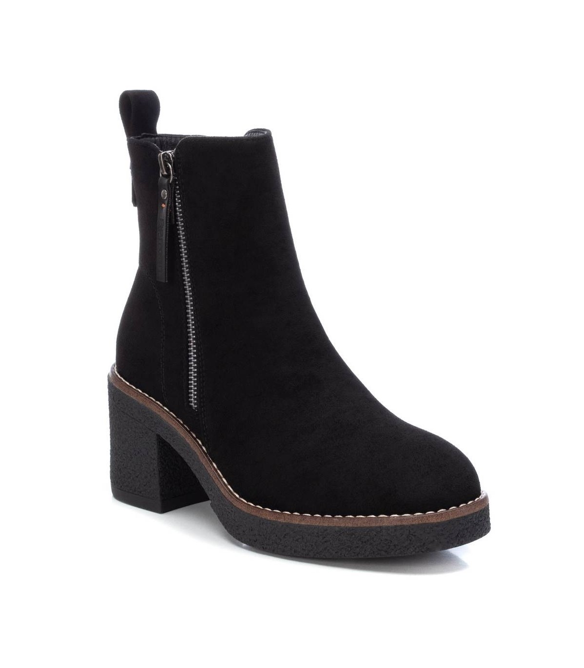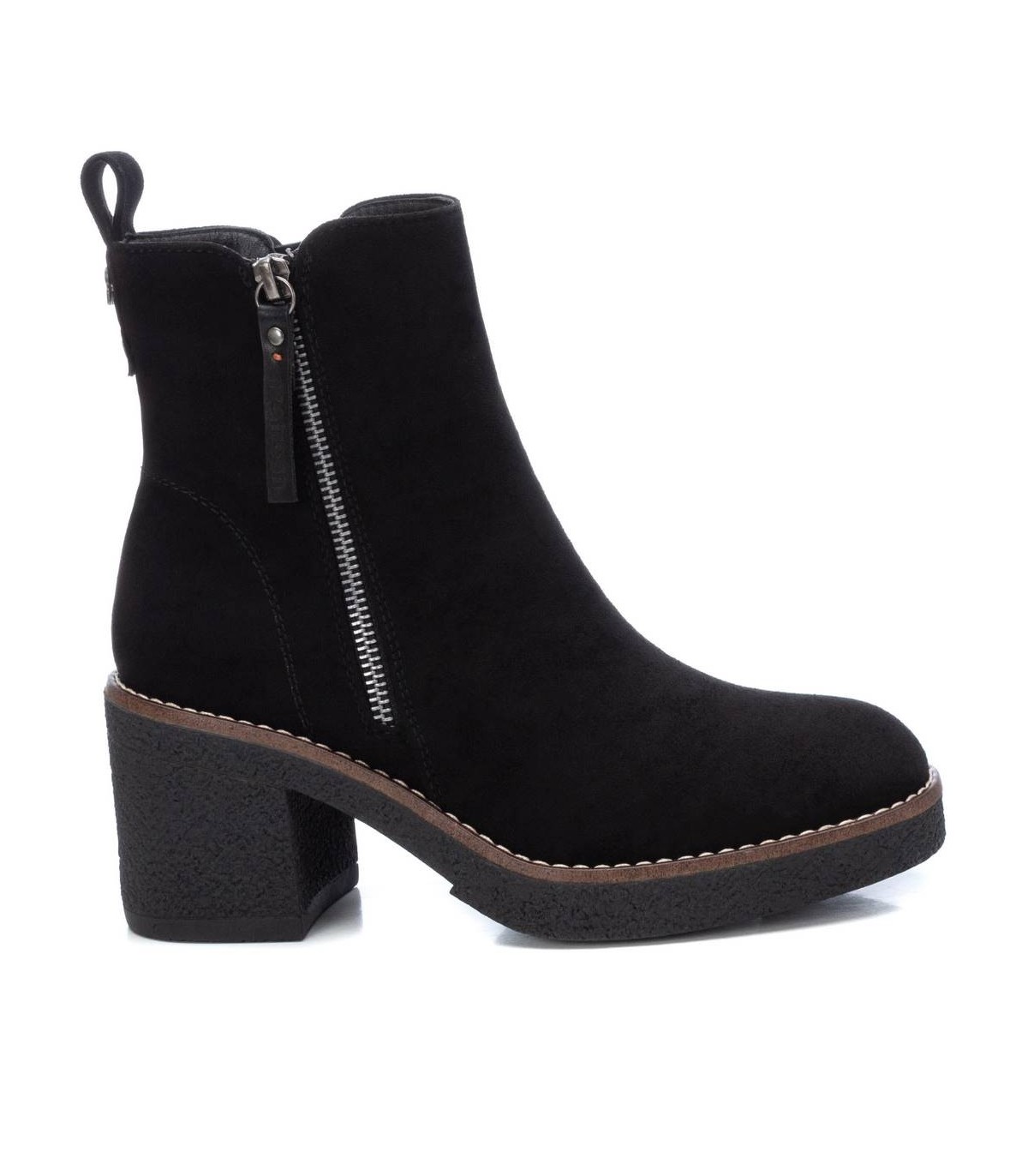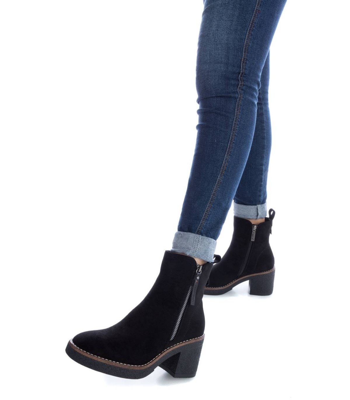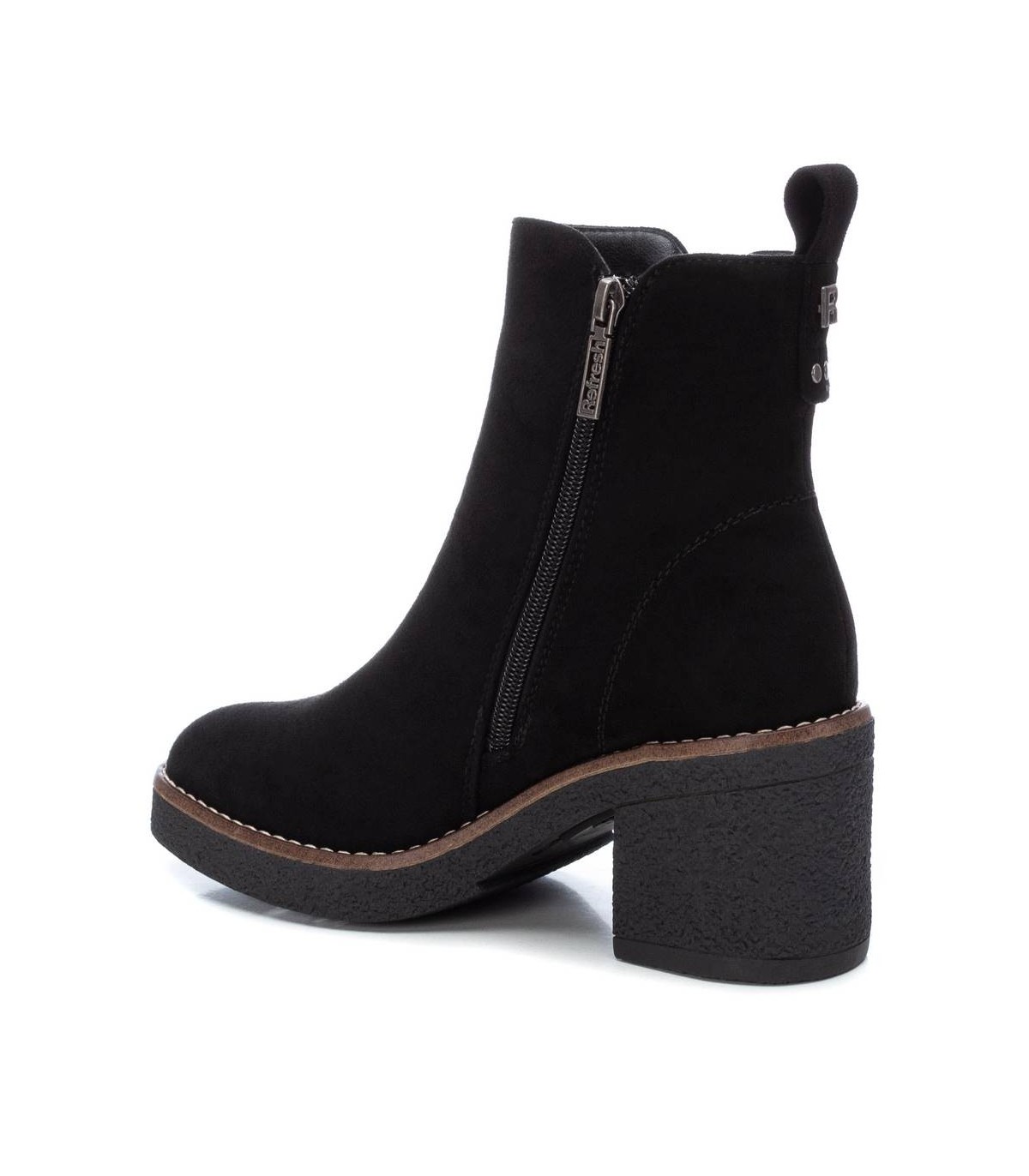 Botín de mujer, de la marca Refresh. Fabricado en antelina. Cierre mediante cremallera lateral. Tirador trasero para facilitar la puesta. Cremallera decorativa en el lateral exterior. Tacón ancho de 7 cm con plataforma delantera para mayor comodidad. Suela de goma antideslizante. Este modelo ha obtenido el certificado vegano por la organización mundial PETA (Organización de los derechos de los animales).