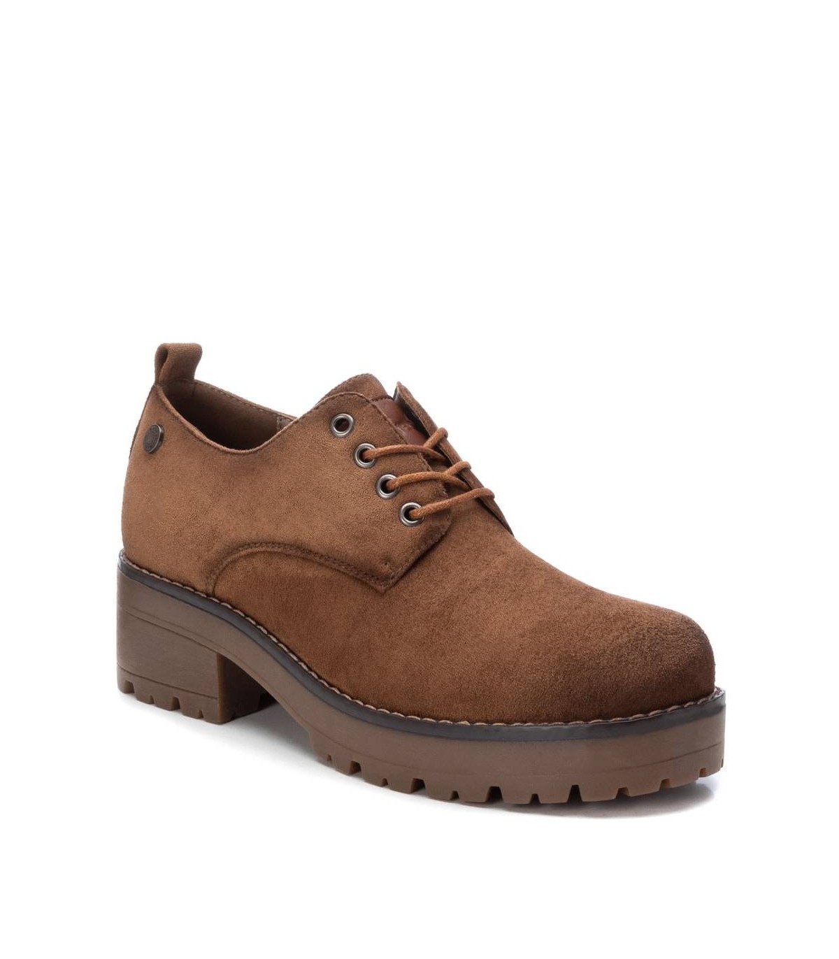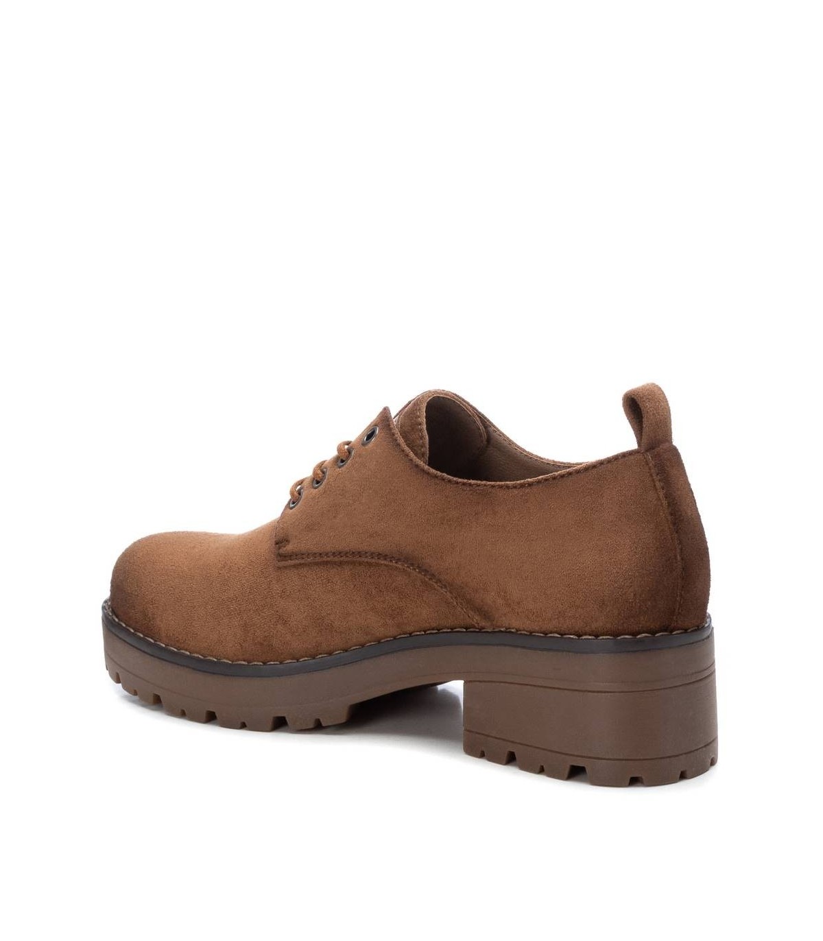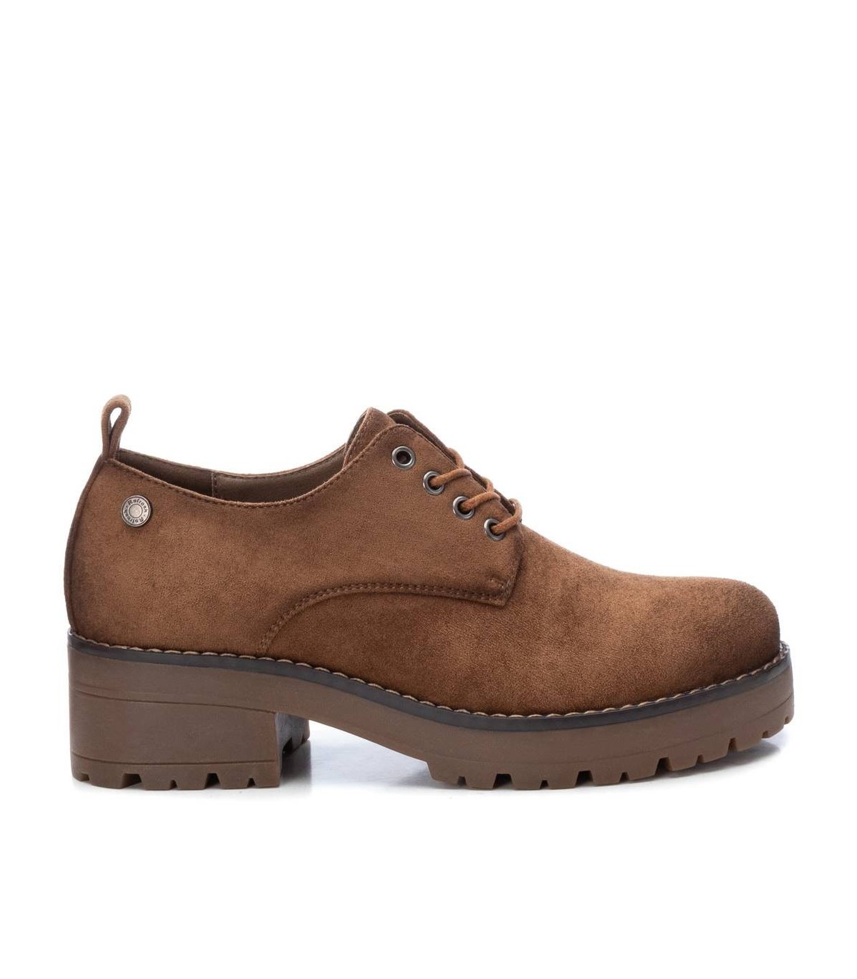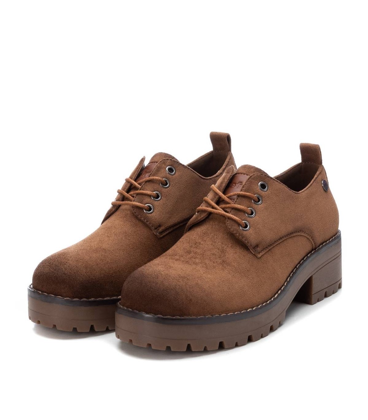 Zapato de mujer, de la marca Refresh. Fabricado en antelina. Cordones ajustables. Tirador trasero para facilitar la puesat. Tacón ancho de 5 cm con plataforma delantera. Suela dentada de goma antideslizante. Este modelo ha obtenido el certificado vegano por la organización mundial PETA (Organización de los derechos de los animales).