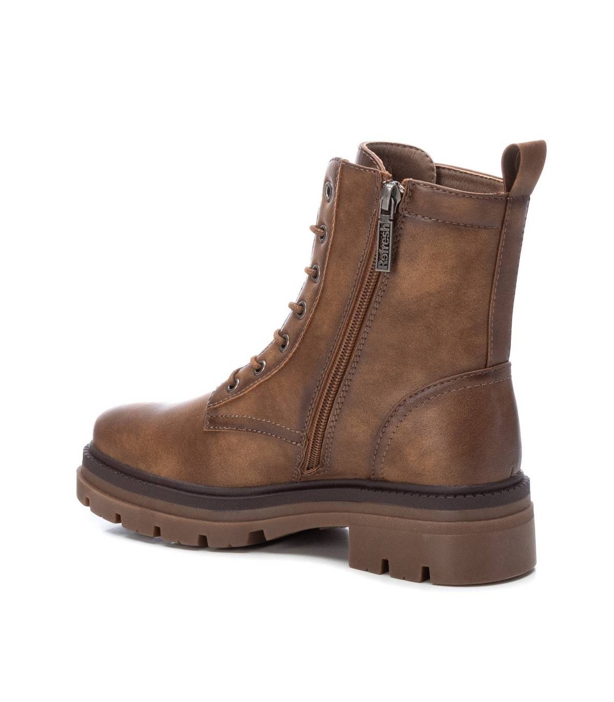 Botín militar de mujer, de la marca Refresh. Fabricado en material que imita la piel. Cierre mediante cremallera lateral y cordones para un buen ajuste. Tirador trasero para facilitar la puesta. Suela track de goma antideslizante. Arrasa esta temporada con este modelo en tendencia. Este modelo ha obtenido el certificado vegano por la organización mundial PETA (Organización de los derechos de los animales).