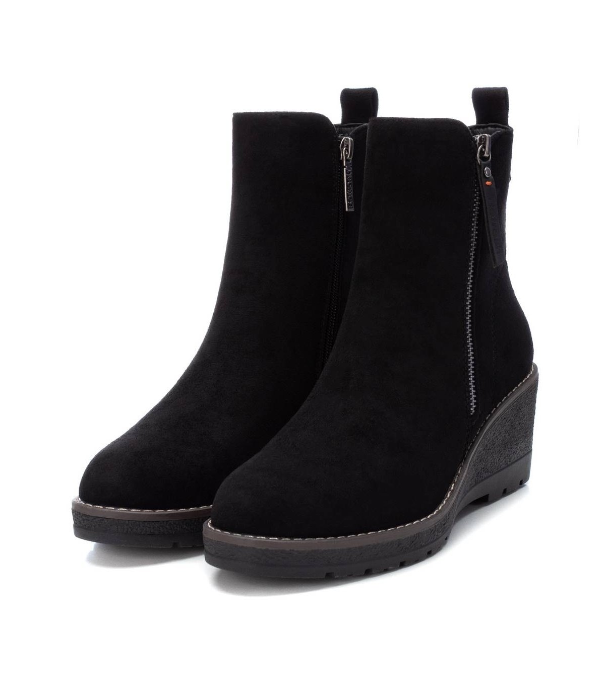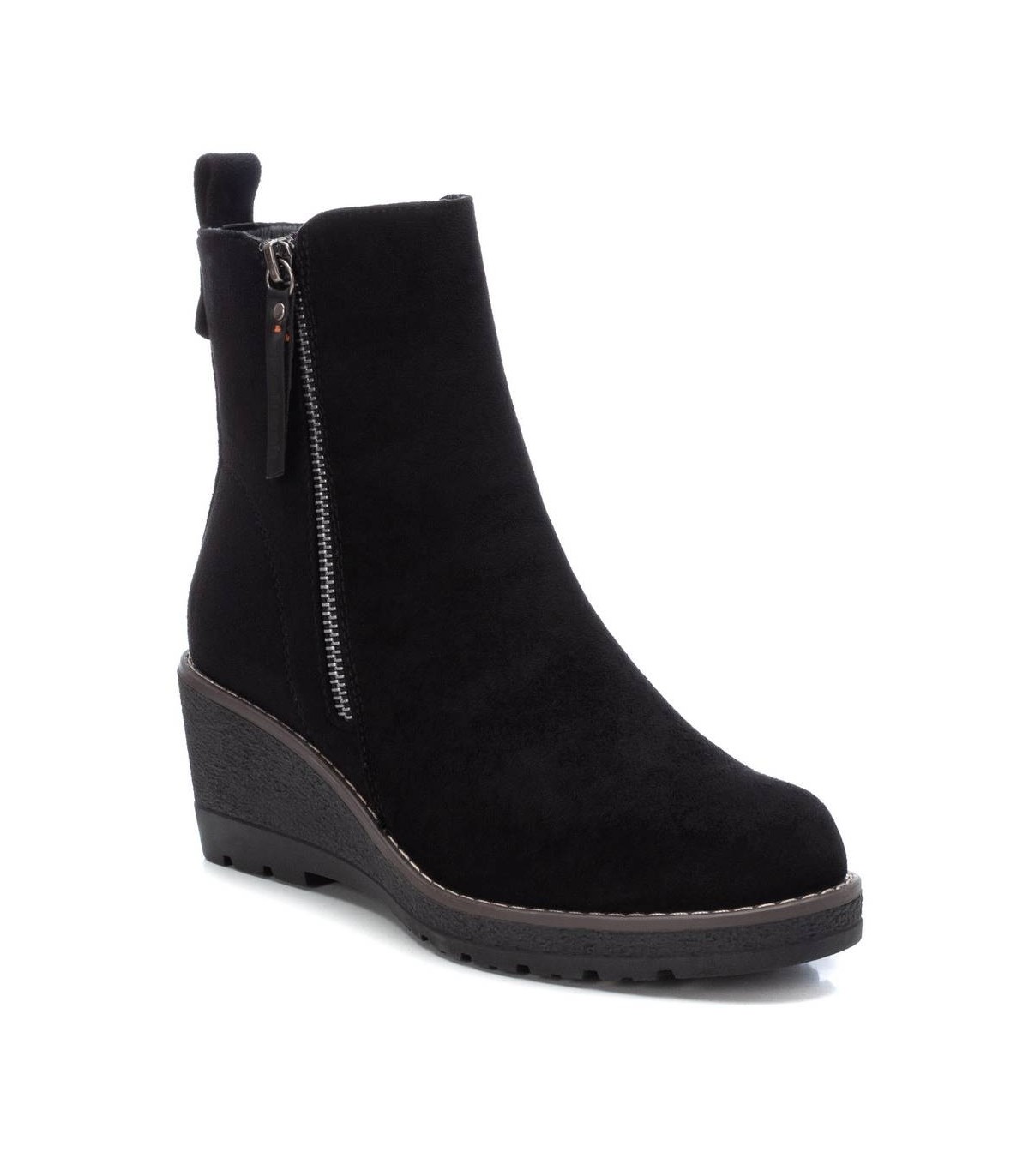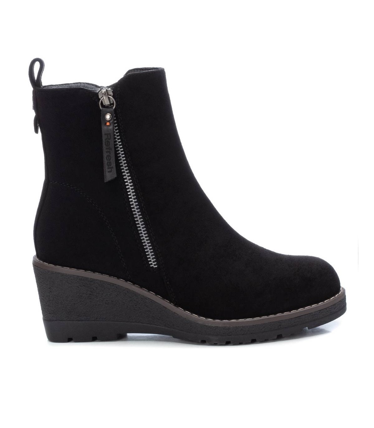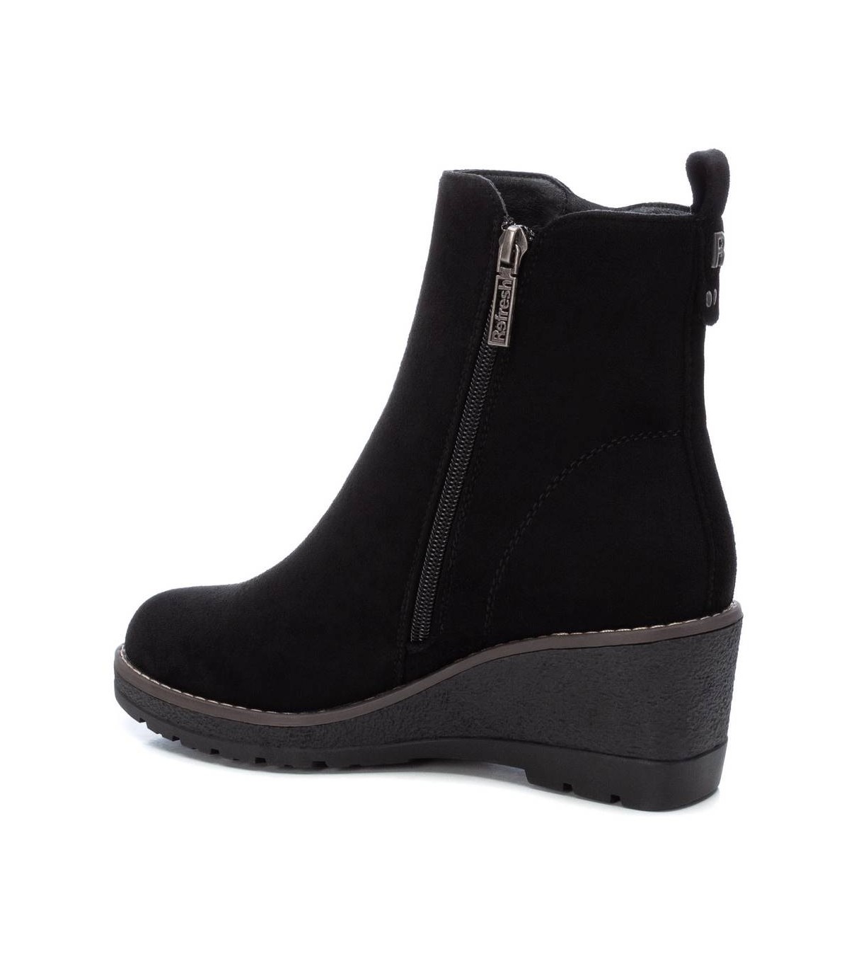 Botín de mujer, de la marca Refresh. Fabricado en antelina. Cierre mediante cremallera lateral. Tirador trasero para facilitar la puesta. Cremallera lateral decorativa. Cómoda cuña de 6 cm con suela de goma antideslizante. Este modelo ha obtenido el certificado vegano por la organización mundial PETA (Organización de los derechos de los animales).