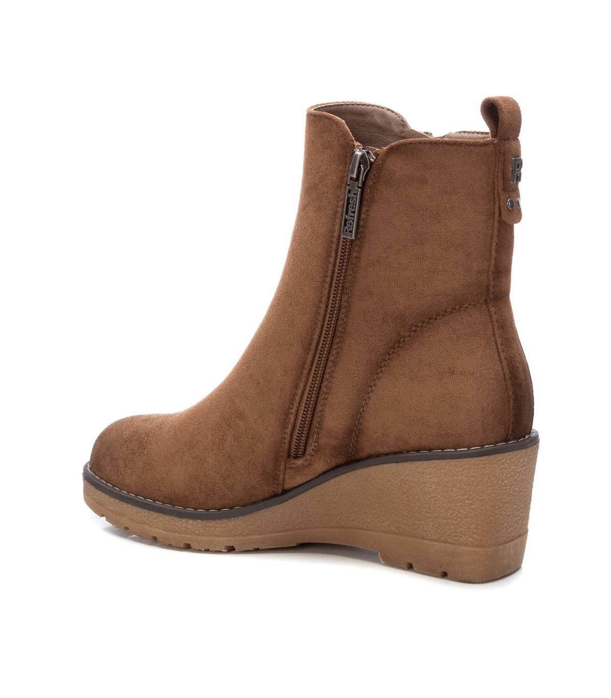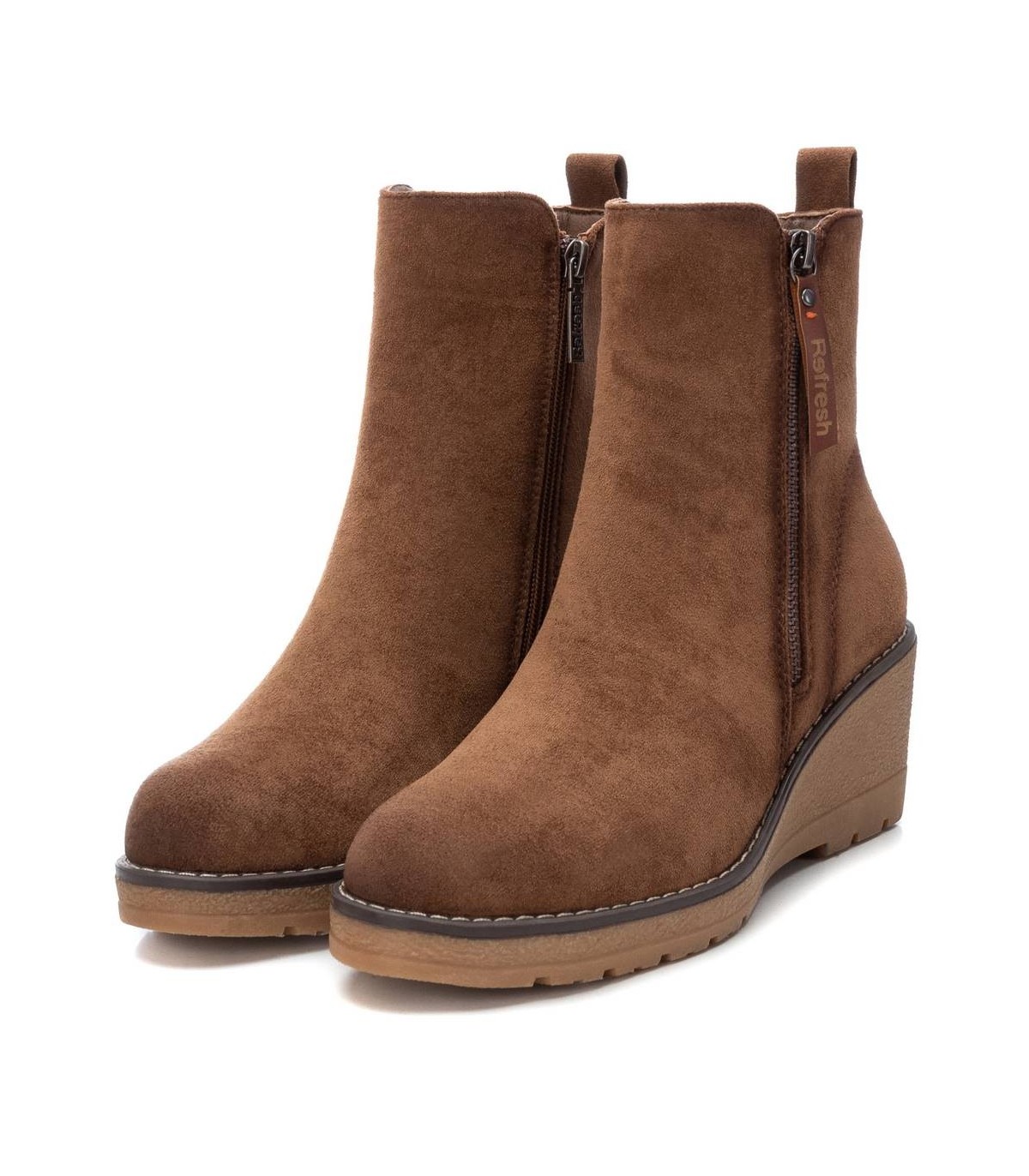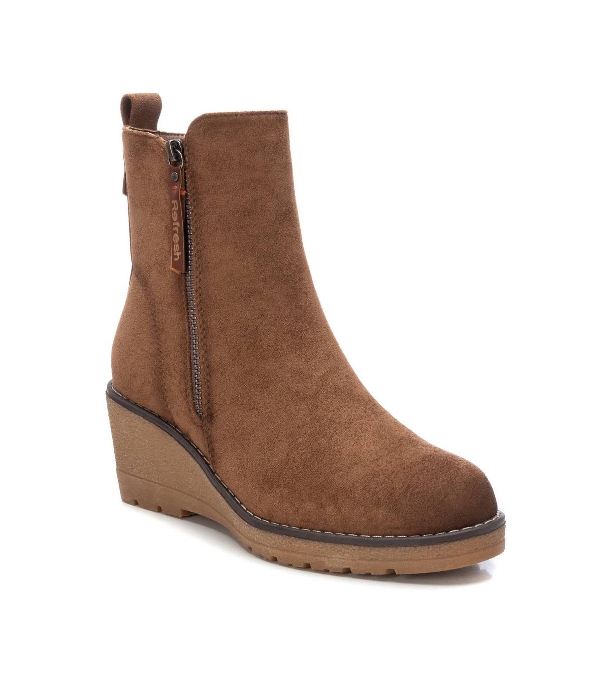 Botín de mujer, de la marca Refresh. Fabricado en antelina. Cierre mediante cremallera lateral. Tirador trasero para facilitar la puesta. Cremallera lateral decorativa. Cómoda cuña de 6 cm con suela de goma antideslizante. Este modelo ha obtenido el certificado vegano por la organización mundial PETA (Organización de los derechos de los animales).