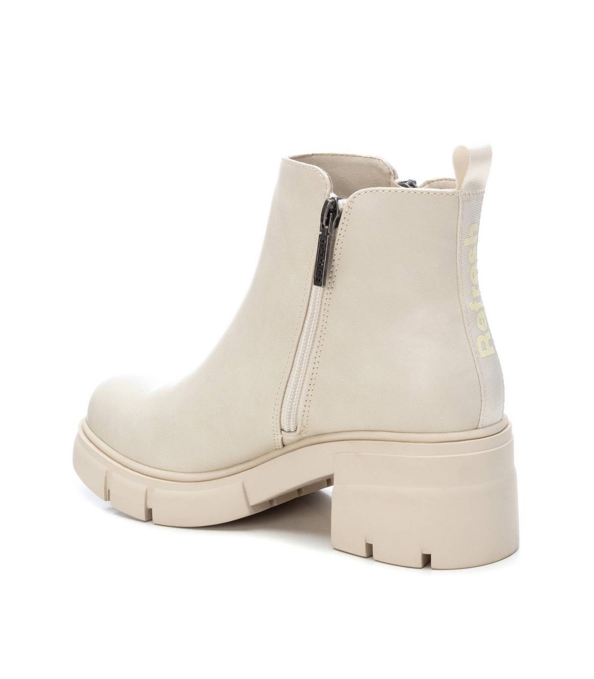 Botín de mujer, de la marca Refresh. Fabricado en material que imita la piel. Cierre mediante cremallera lateral. Tirador trasero para facilitar la puesta. Cremallera decorativa en el lateral exterior. Cómodo tacón ancho de 6 cm con suela de goma antideslizante. Este modelo ha obtenido el certificado vegano por la organización mundial PETA (Organización de los derechos de los animales).