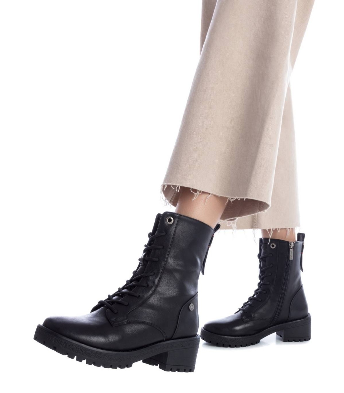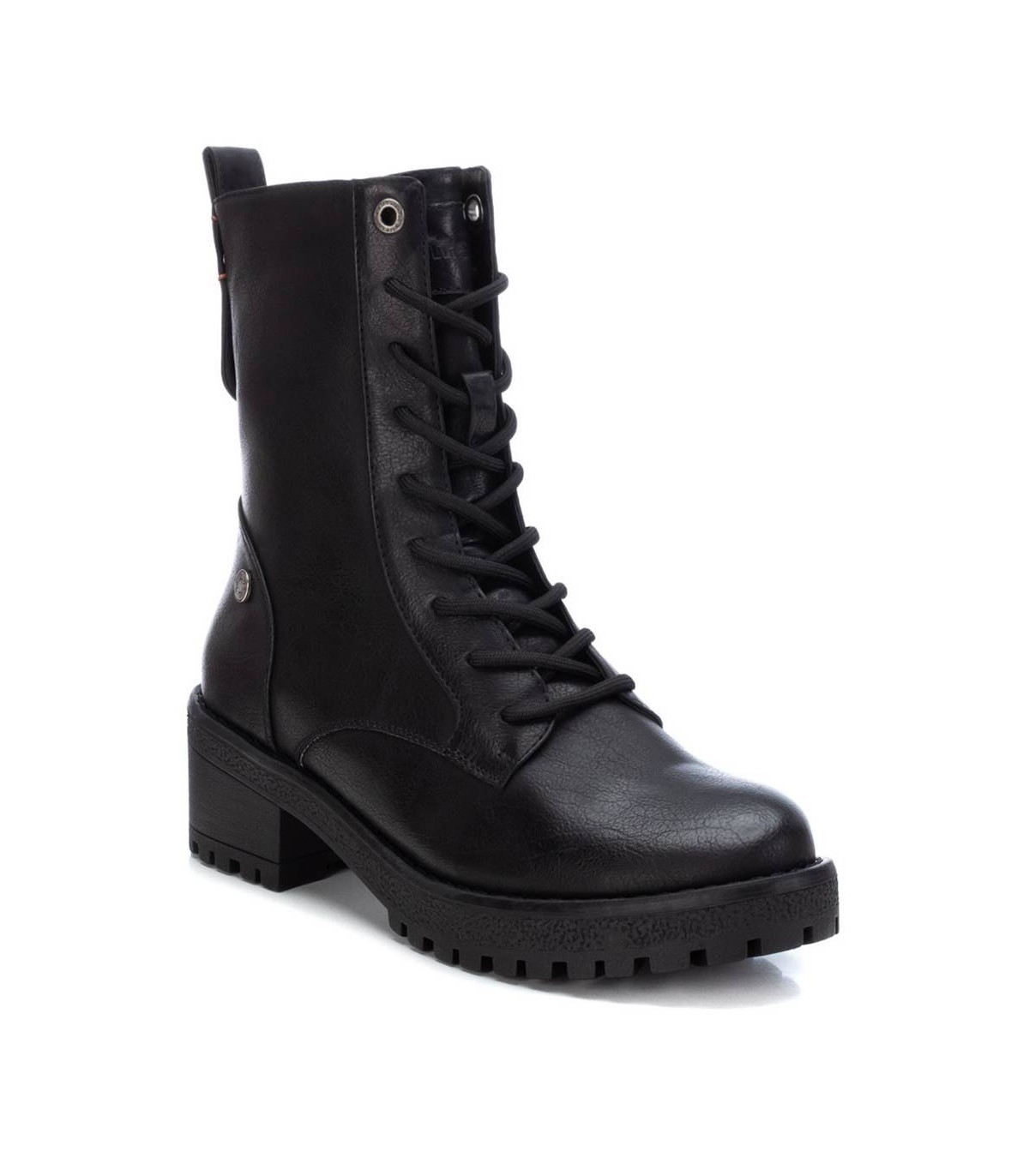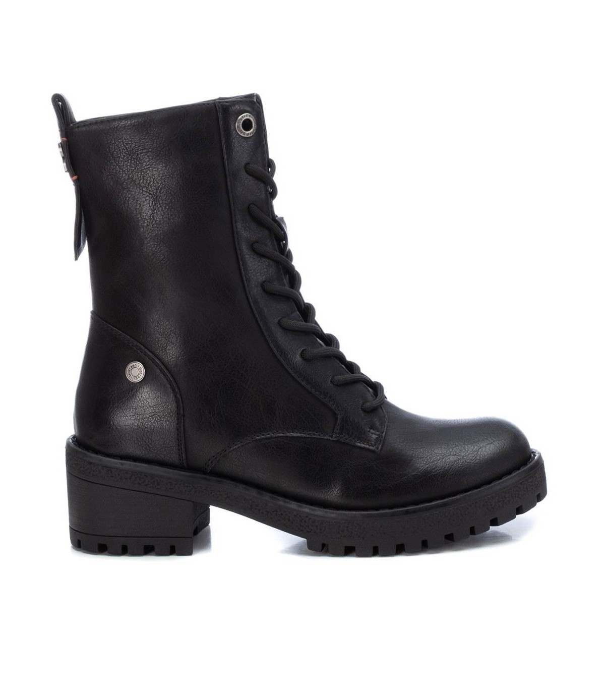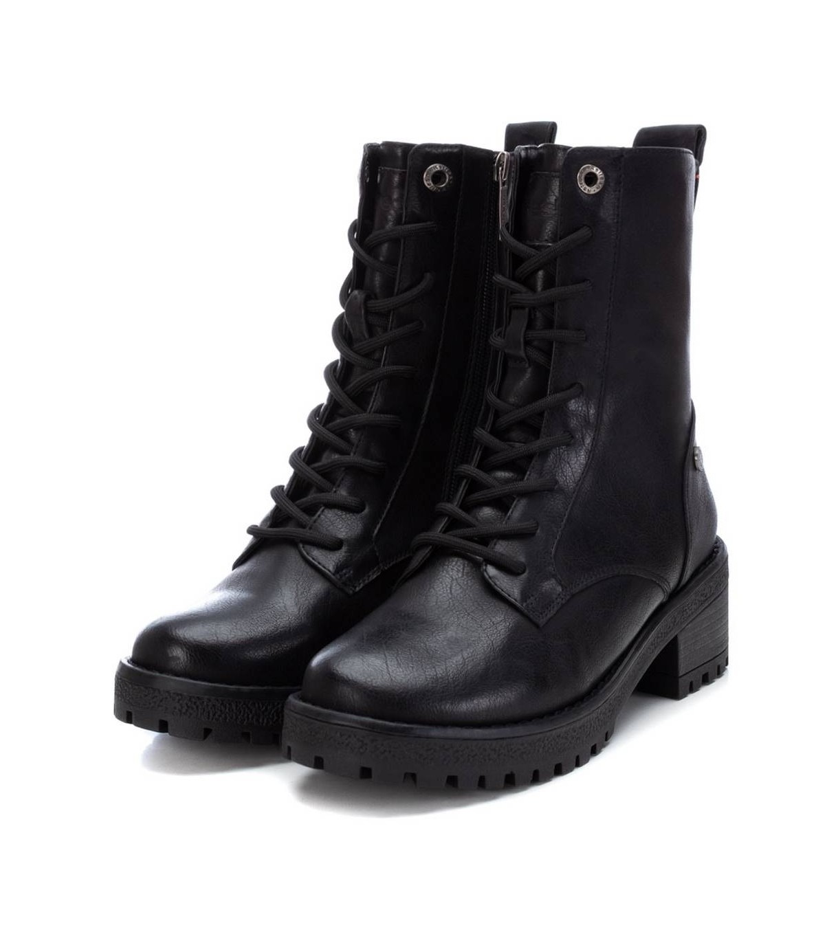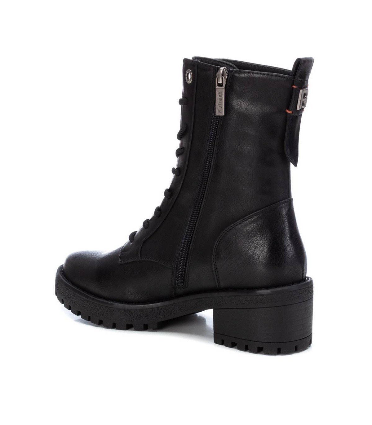 Botín estilo militar de mujer, de la marca Refresh. Fabricado en material que imita la piel. Cierre mediante cremallera lateral y cordones para un buen ajuste. Tirador trasero para facilitar la puesta. Cómodo tacón ancho de 5 cm con suela dentada de goma antideslizante. Este modelo ha obtenido el certificado vegano por la organización mundial PETA (Organización de los derechos de los animales).