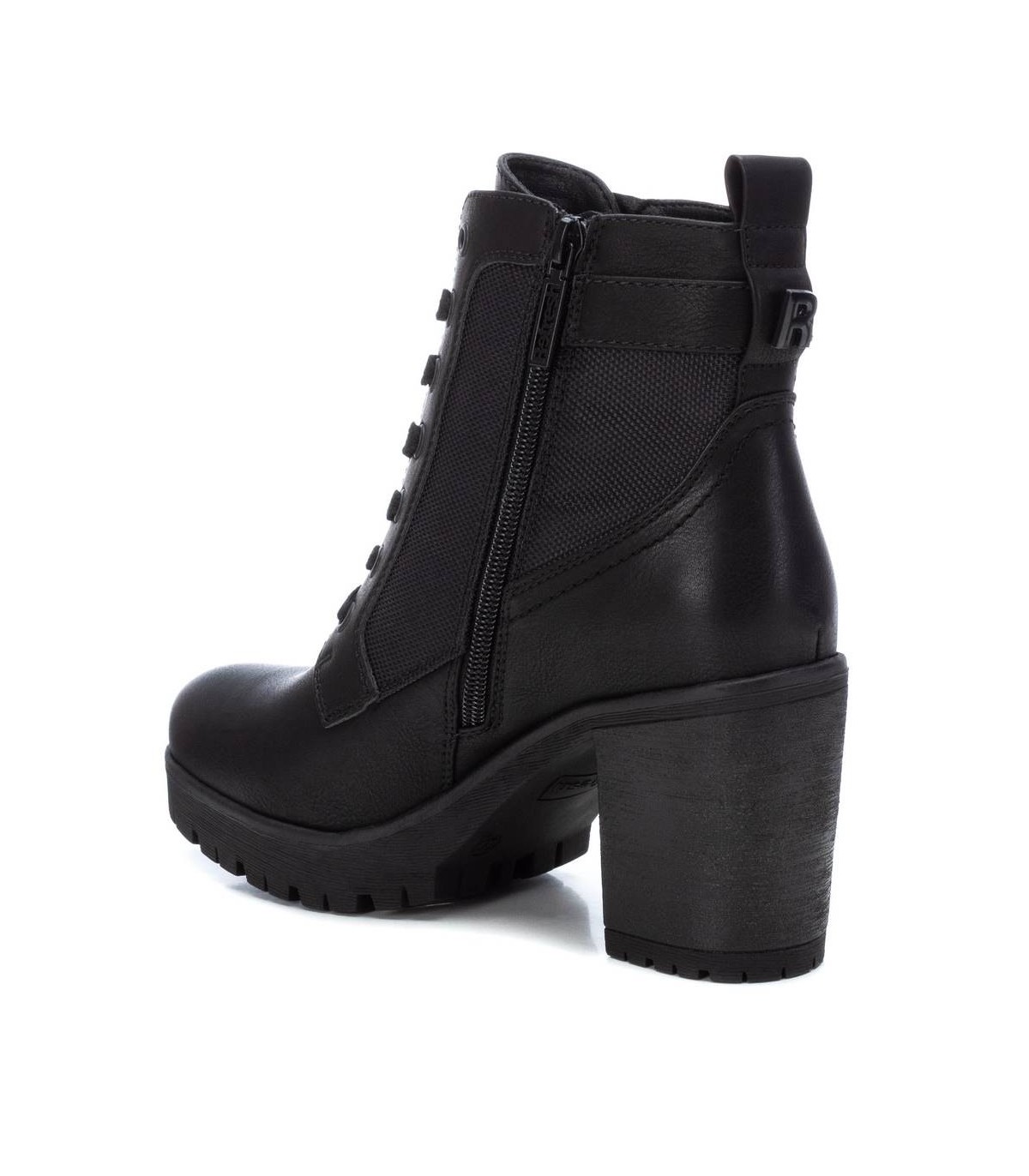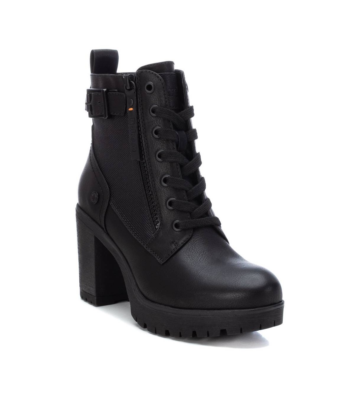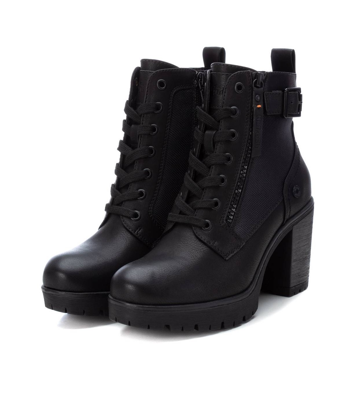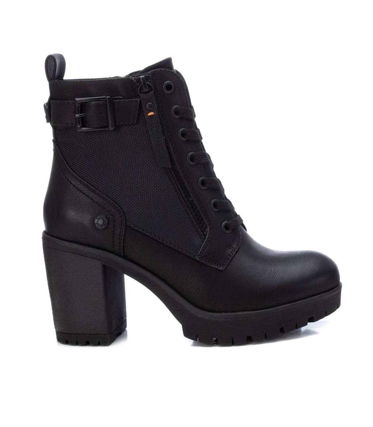 Botín de mujer, de la marca Refresh. Fabricado en material que imita la piel. Cierre mediante cremallera lateral y cordones para un buen ajuste. Tirador trasero para facilitar la puesta. Cremallera decorativa en el lateral exterior y correa con hebilla. Tacón ancho de 8 cm con suela dentada de goma antideslizante. Este modelo ha obtenido el certificado vegano por la organización mundial PETA (Organización de los derechos de los animales).